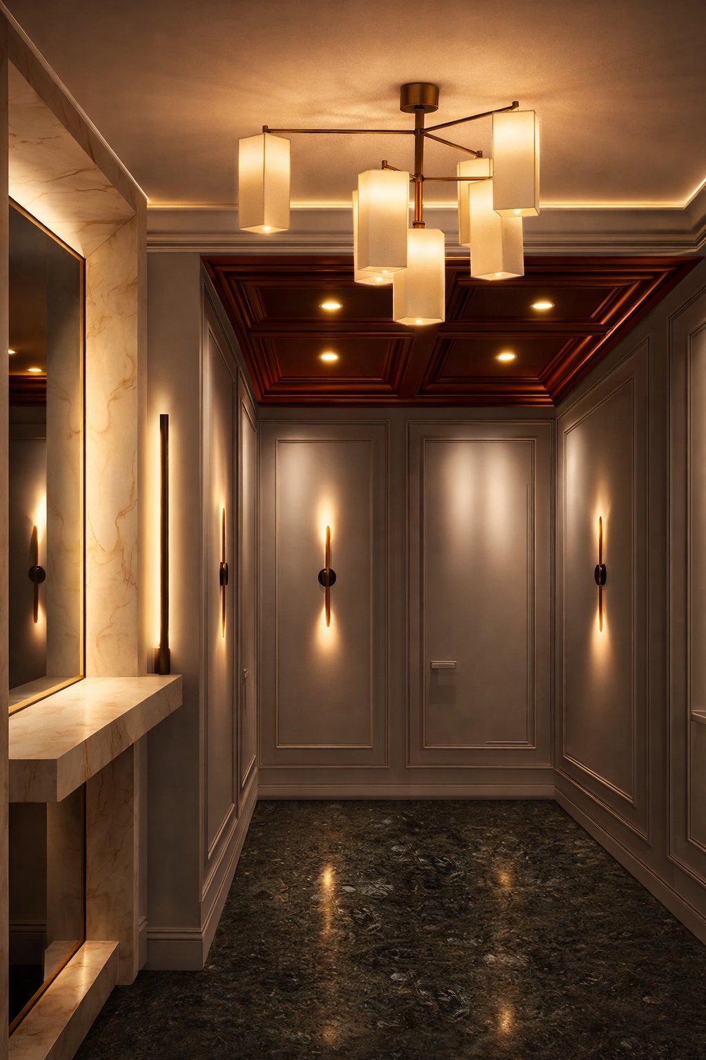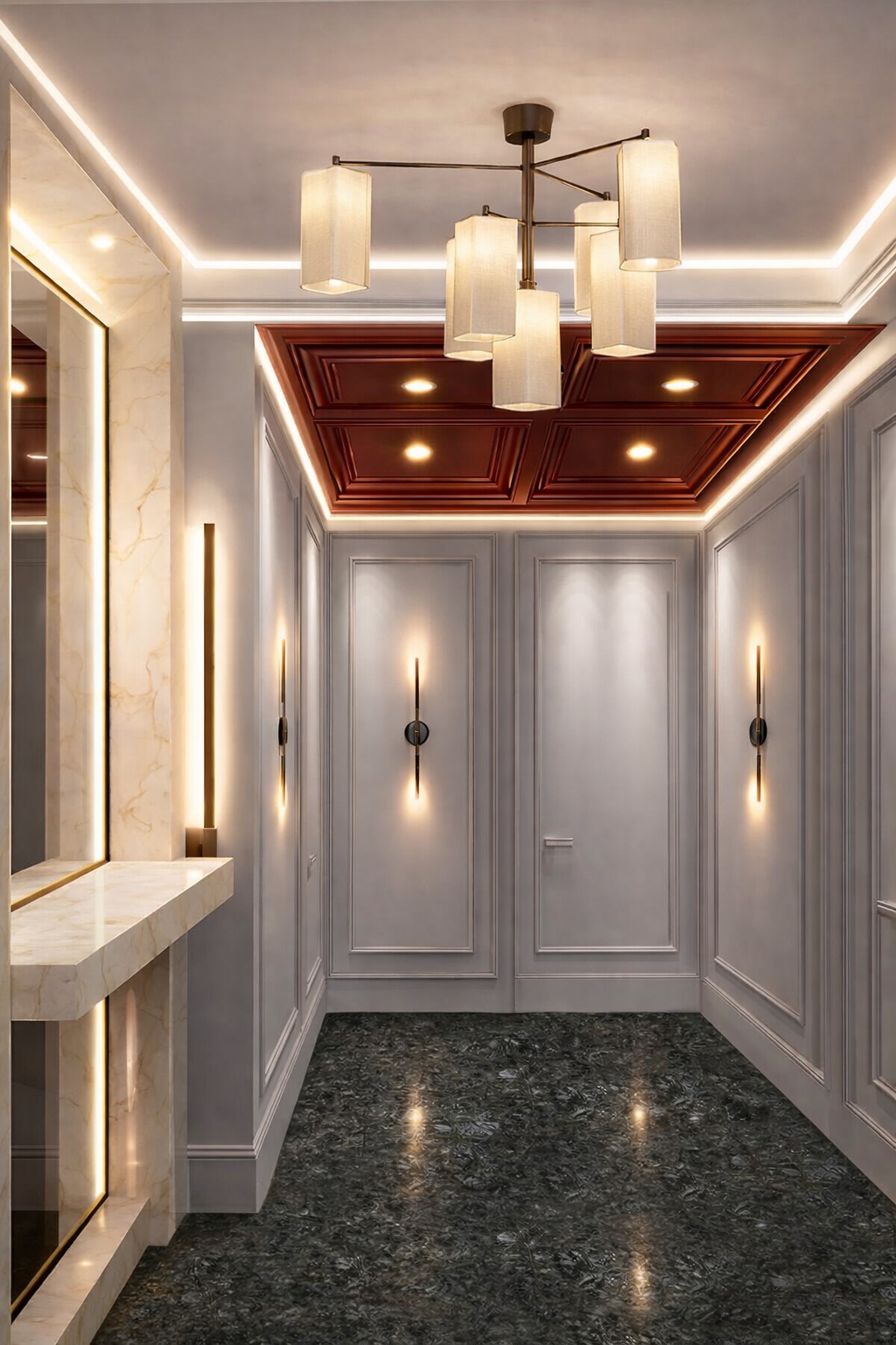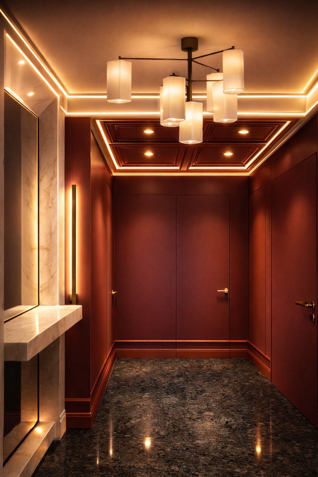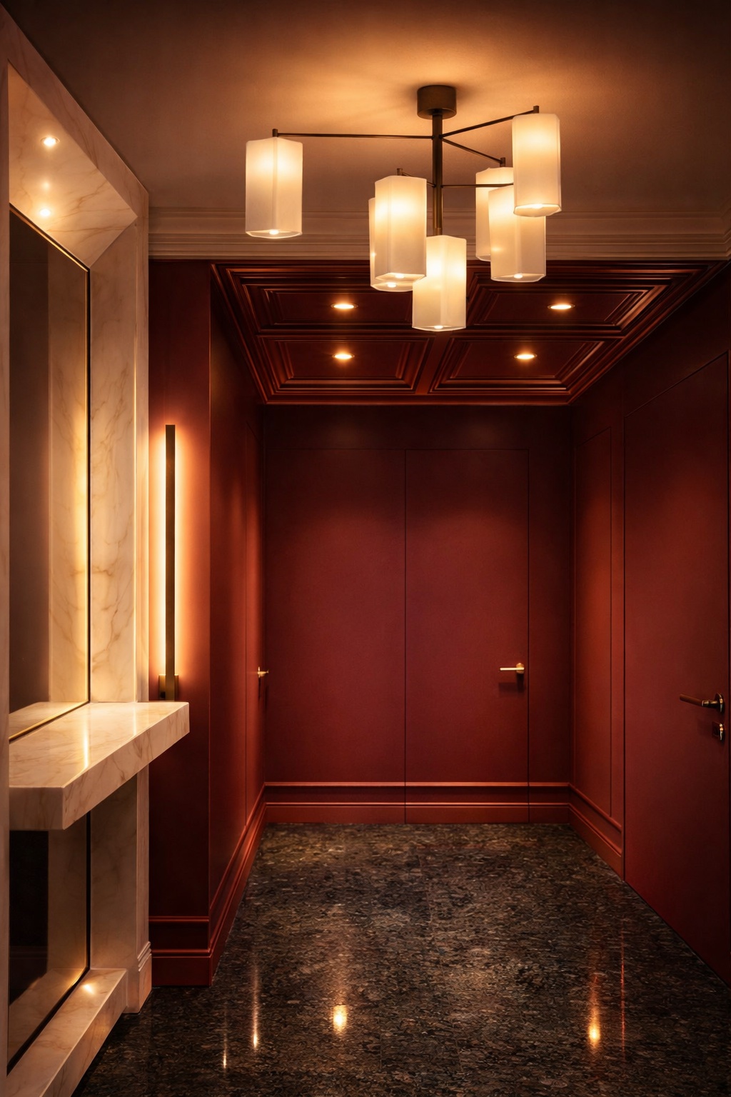 Una famiglia con figli ormai adulti abita in una grande casa con spazi distribuiti male e stile datato: In attesa di decidere per una ristrutturazione radicale optano per un relooking e l' ingresso è il protagonista di questa carrellata di immagini. Nessuna modifica alle pareti ma solo sostituzioni e integrazioni: le porte diventano"filomuro" e il soffitto è ribassato per differenziare e regolarizzare volumi e percezioni. Il pavimento nero diventa una sorta di tappeto che fa' risaltare il bordeaux che si riflette creando un mix davvero sofisticato. I profili boiserie raccordano i diversi volumi e colori vecchi e nuovi. Benvenuti e buon viaggio!