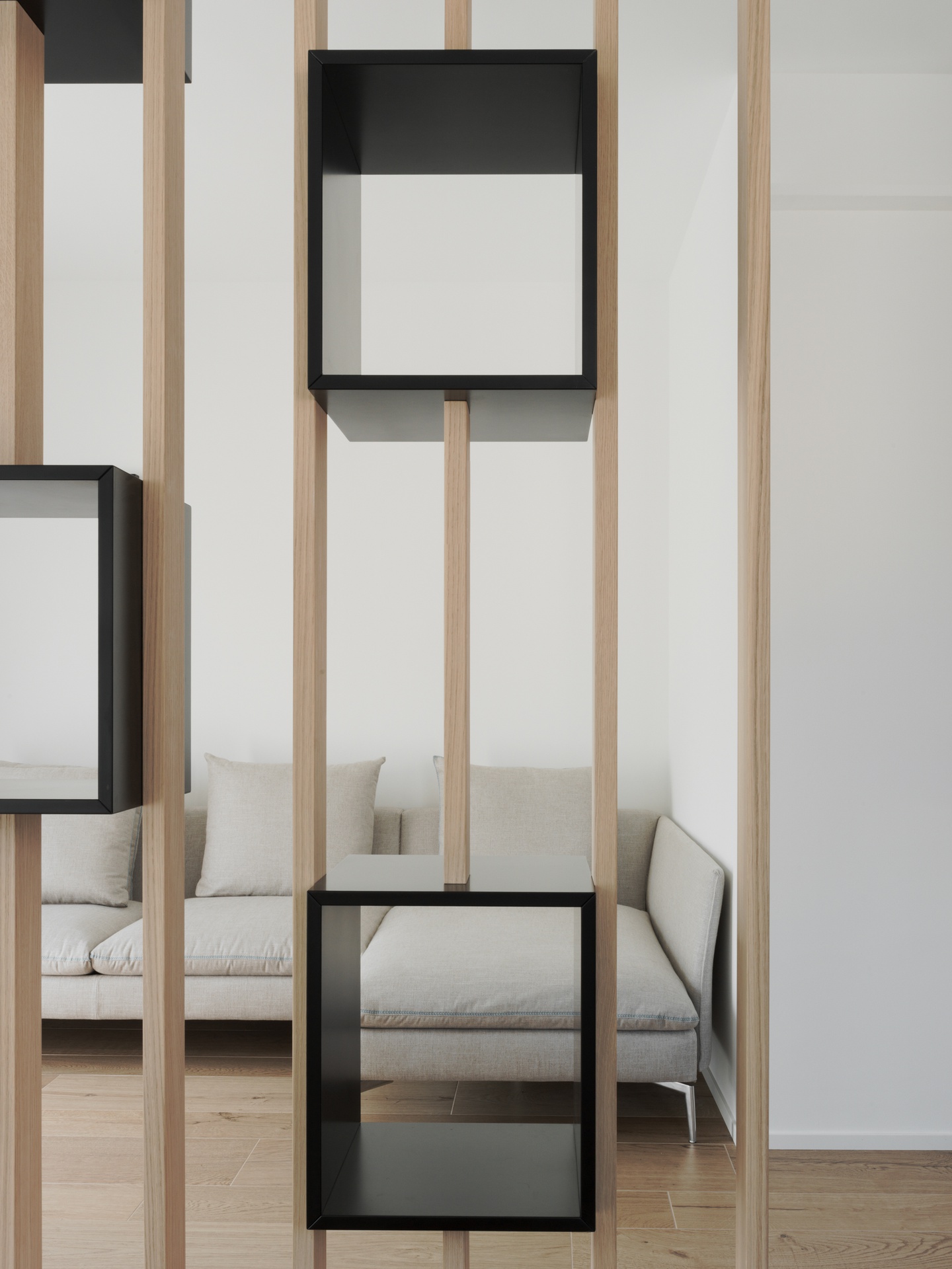 La sfida progettuale si è sviluppata nel trasformare una legnaia del tutto priva di finiture ed impianti, in una funzionale unità abitativa che rispecchiasse le esigenze della committente: avere una zona living di ampio respiro dove trascorrere la maggior parte del tempo ed una più raccolta zona notte dove ritirarsi.Considerato il taglio non regolare della planimetria, caratterizzata da continue rientranze e sporgenze da aggiungersi alla contenuta metratura, si è cercato di creare una molteplicità di ambienti avvalendoci di soluzioni tecniche che permettessero da un lato una necessaria settorializzazione, dall’altra una continuità spaziale che potesse mantenere il senso di ariosità.La scelta è ricaduta sull’utilizzo di listelli di legno a tutta altezza, proporzionalmente distanziati tra loro, che creassero un muro permeabile in grado di mantenere un continuum visivo e nel contempo generare un susseguirsi di ambienti tra loro collegati: corridoio, soggiorno, zona pranzo, cucina.Quest’ultima appare come l’elemento fulcro attorno al quale ruota l’intera zona living, un mobile disegnato su misura dall’Architetto, privo di maniglie così da garantire una maggiore pulizia compositiva, inserito in un portale che ne facesse da cornice, con l’aggiunta di un’isola centrale caratterizzata da pieni e vuoti volti ad alleggerirne le forme e che garantisse una libertà di percorsi e movimenti da parte della committenza.Trovandoci in un ambiente tipicamente montano, la scelta dei materiali ha prediletto l’utilizzo di elementi poveri come il legno, da aggiungersi ad un arredo decisamente minimale e retrò che potesse parlare ed emergere nell’ambiente circostante anche grazie alla scelta di un cromatismo neutrale come quello delle pareti e del soffitto, che qui risultano come un semplice fondale.Non meno importante appare l’illuminazione, volutamente diversificata e costituita da applique, led, faretti e lampade discendenti, che oltre a creare giochi di luce costantemente mutevoli che ne risaltassero i volumi, si prefigge l’obiettivo di interagire con l’arredo restando a servizio delle volubili esigenze di vita all’interno dell’abitazione.