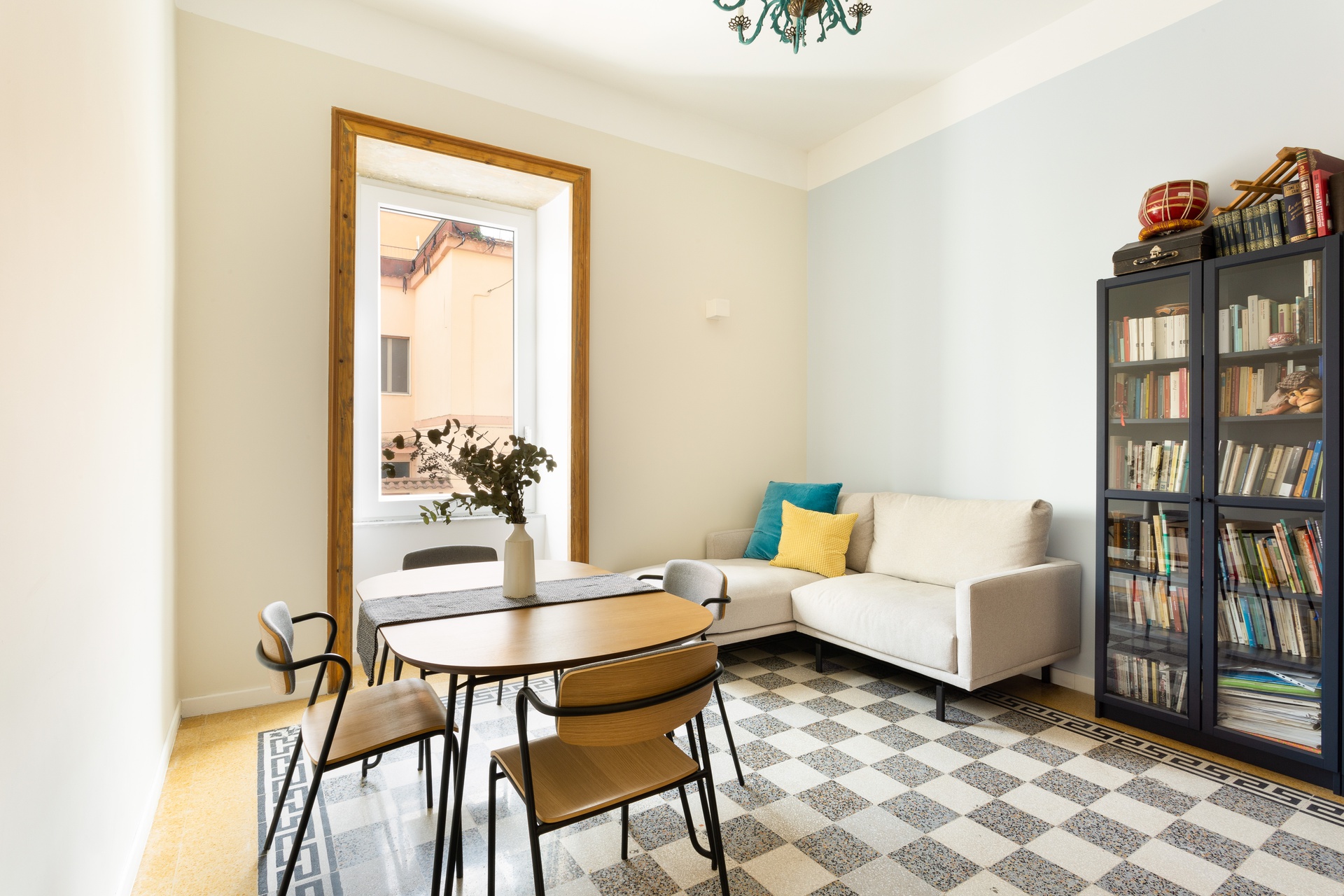 La prima volta che siamo entrati in questa casa c’era un’atmosfera magica, sembrava che il tempo si fosse fermato agli anni 30. Attraversando le stanze nella penombra abbiamo trovato un filo di bandierine appeso al soffitto che ricordava una festa, di lì il nome del progetto. Una giovane coppia con due bambini ha scelto questo piccolo appartamento di 60 mq come pied-a-terre partenopeo, vivendo tra Napoli e Londra. L’esigenza principale della famiglia era quella di avere una casa dai colori vivaci, con molti spazi di storage e a prova di bambino. Porte e cornici in legno, soffitti alti e passaggi stretti sono gli elementi caratterizzanti di questa casa che abbiamo lasciato inalterati. In generale si è trattato di un intervento conservativo: le uniche demolizioni e ricostruzioni sono state quelle necessarie per ri-definire bagno e cucina. Il resto della casa ha mantenuto la sua conformazione originaria anche per quanto riguarda le altezze. Gli unici spazi dove c’è stato un ribassamento sono quelli corrispondenti a corridoio e bagno, per consentire la realizzazione degli impianti di ventilazione meccanica controllata e condizionamento. Tutte le porte interne e le cornici in legno sono state recuperate con attenti interventi di falegnameria. Gli antichi pavimenti in graniglia con motivi floreali ci hanno immediatamente colpito, tanto che abbiamo scelto di recuperarli nel corridoio e nel living. Le tonalità delle graniglie sono state prese come riferimento per definire la palette di progetto. Gli arredi sono stati selezionati con la tecnica del mix and match: alcuni elementi già in possesso dei clienti sono stati bilanciati con i nuovi acquisti, dando un tocco finale eclettico all’intera casa.ph. Pietra Studio – Greta Valente / ph. Valentina Solano