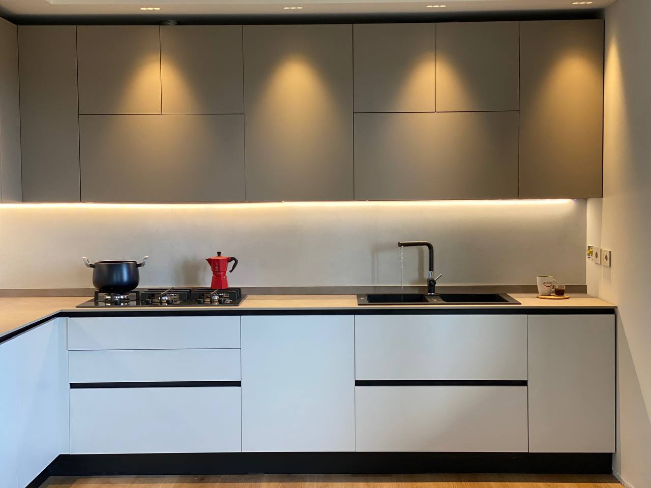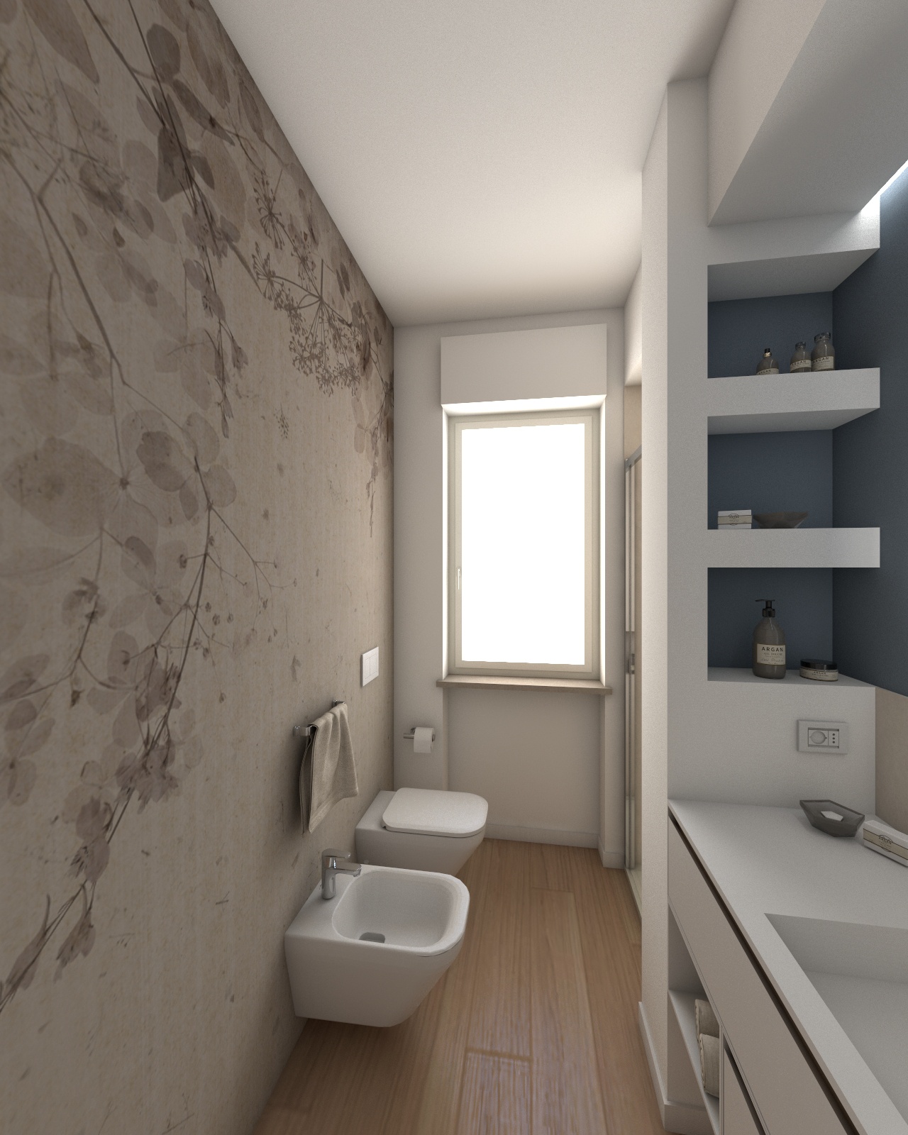 PROGETTO & RENDER | Ristrutturazione del mio appartamento al mare.Il progetto prevedeva la realizzazione di un open-space al posto di avere la cucina ed il soggiorno in due stanze separate, l'ingrandimento del bagno tramite la nicchia della doccia che occupa parte di una camera, e la realizzazione di una lavanderia nell'ampio ingresso.Per quanto riguarda le finiture, si è scelto di uniformare tutto con il beige F9.03.76 della Sikkens, ma avere alcune pareti di accento, come quella dietro al divano e dietro ad un letto, del verde salvia L0.04.65. La testata dell'altra camera da letto, invece, è stata tinteggiata con un color block di tre colori. In bagno si è voluto contrastare il bianco delle piastrelle con il blu S0.20.40 che entra anche nelle nicchie, e con piastrelle blu sul fondo della doccia, inoltre, la parete dietro ai sanitari si è rivestita di carta da parati vetrificata. Siccome si è optato per il riscaldamento tramite impianto canalizzato a soffitto, si è dovuto controsoffittare l'ingresso, e si è voluto continuare con il controsoffitto anche nella parte tra soggiorno e cucina, sia per avere due bocchette di aerazione, sia per dividere visivamente i due spazi, e sia per creare un gioco di luci con strisce led che illuminano entrambi i lati.Le strisce led sono state posizionate per evidenziare anche le pareti di accento, quindi quella dietro al divano, con la funzione dimmerabile, quella blu sopra al lavandino in bagno e quella piastrellata di blu in doccia.Siccome non si è voluto rimuovere il pavimento esistente, si è optato per la posa sopra ad esso del Clap! 3D della Dèco Decking nella finitura Takla. Dello stesso brand sono anche i listelli che vanno da pavimento a soffitto vicino al divano, ma questi si sono scelti a contrasto della finitura Walnut.Progetto e render: Arch. Francesca Boglio