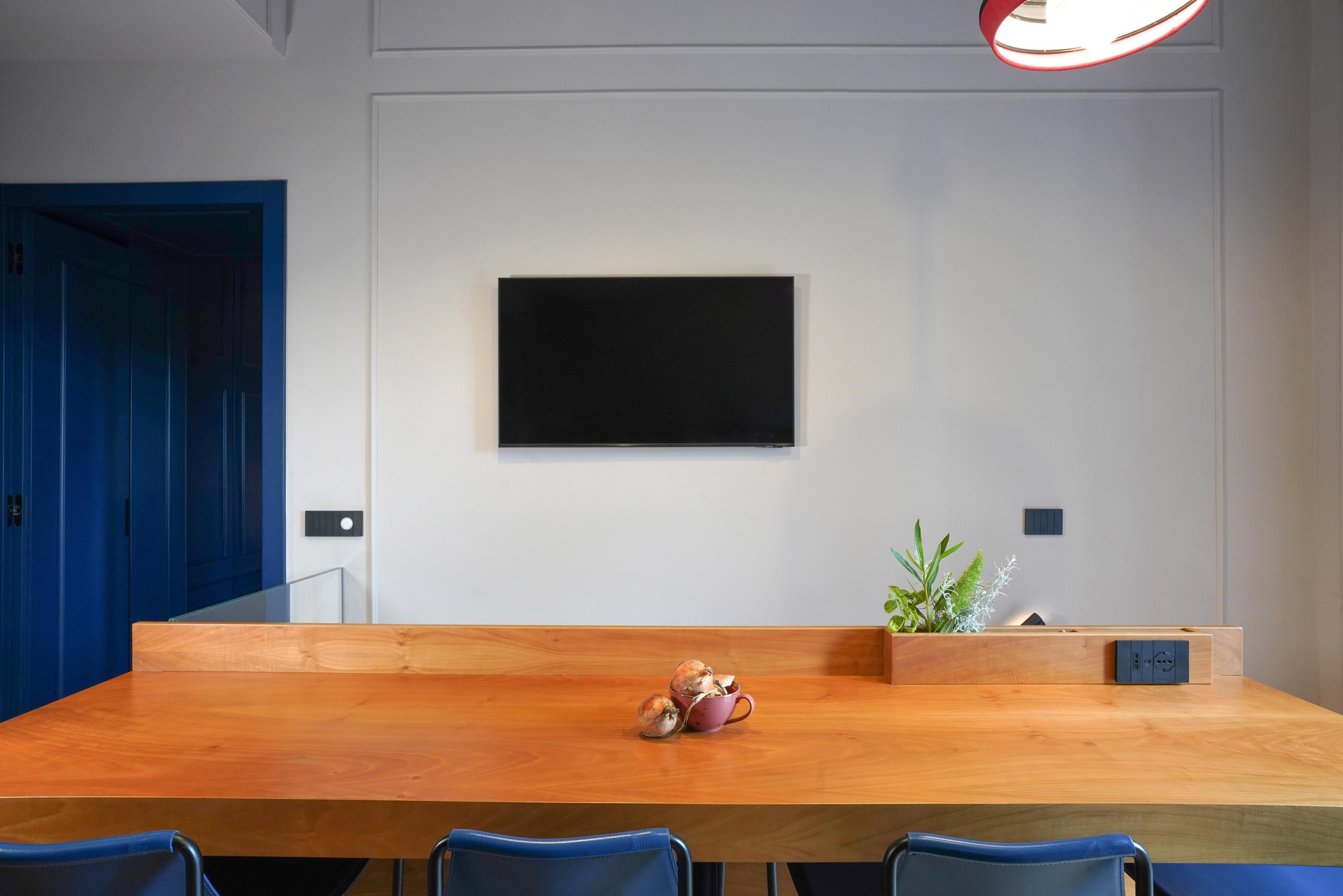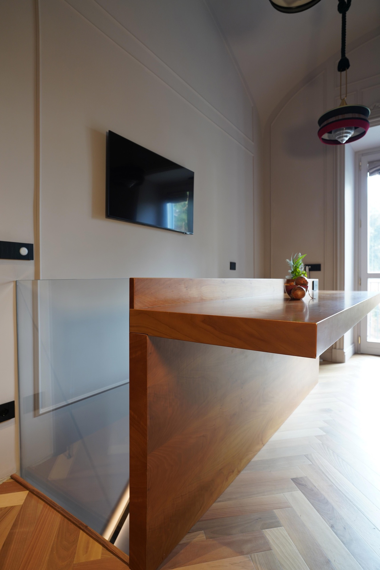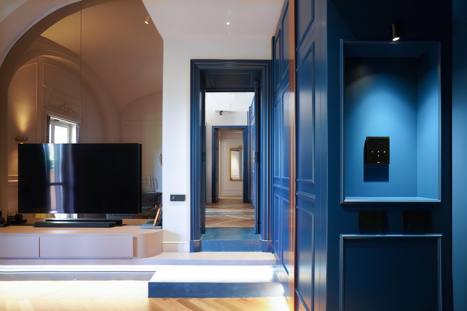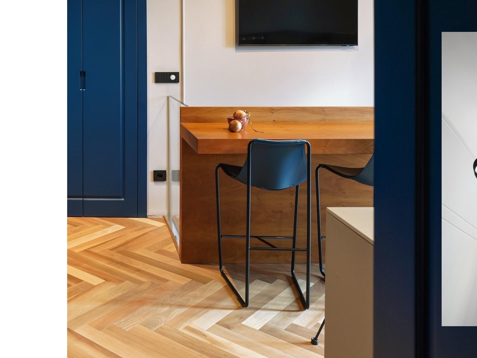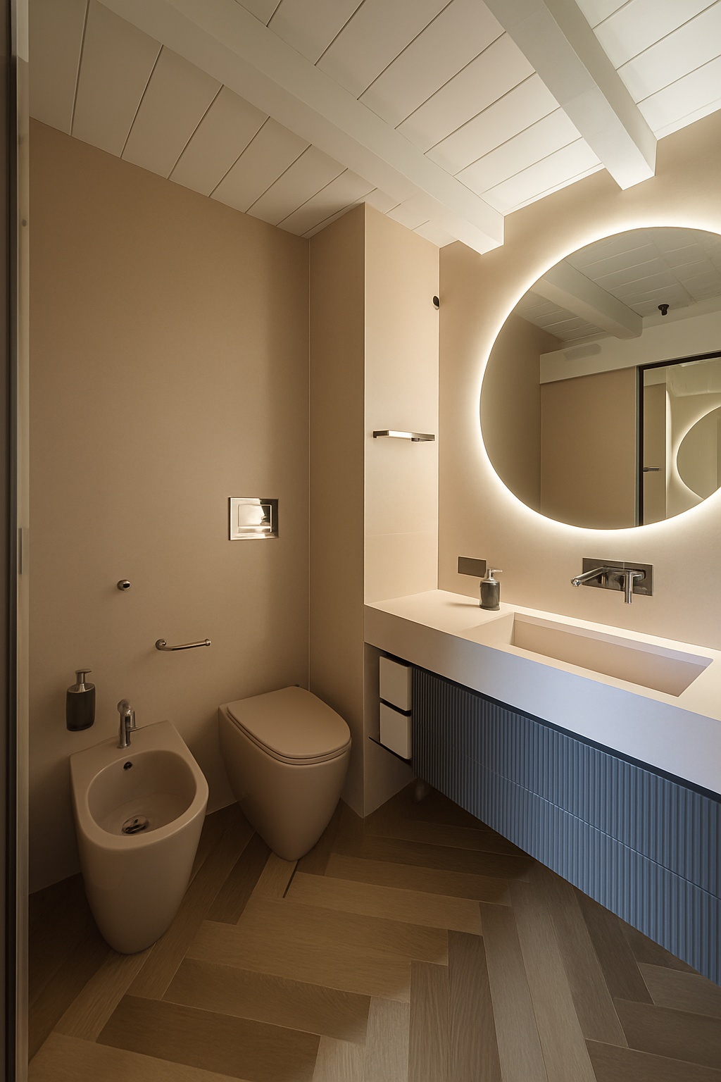Un progetto dove eleganza e carattere si incontrano in una villa vesuviana di fine ottocento.Le pareti e i soffitti in rosa carne avvolgono lo spazio in un’atmosfera morbida e sofisticata, mentre gli arredi blu donano profondità e personalità.________________________________La cucina e il living dialogano tra loro attraverso dettagli ricercati: il calore del legno, la geometria del parquet a spina di pesce e le linee contemporanee degli arredi.Un equilibrio perfetto tra tradizione e modernità. La balaustra della scala è un comodo tavolo snack in noce e gli arredi sono quinte scenografiche blu oltremare . Sotto travi in legno color cipria, il bagno in camera, un ambiente sartoriale prende forma: pareti rivestite in Rubino Laminan, lavabo con struttura in vetro plissé e accessori firmati Gessi. La parete e gli specchi retroilluminati formano riflessi che amplificano la profondità e disegnano giochi di luce.