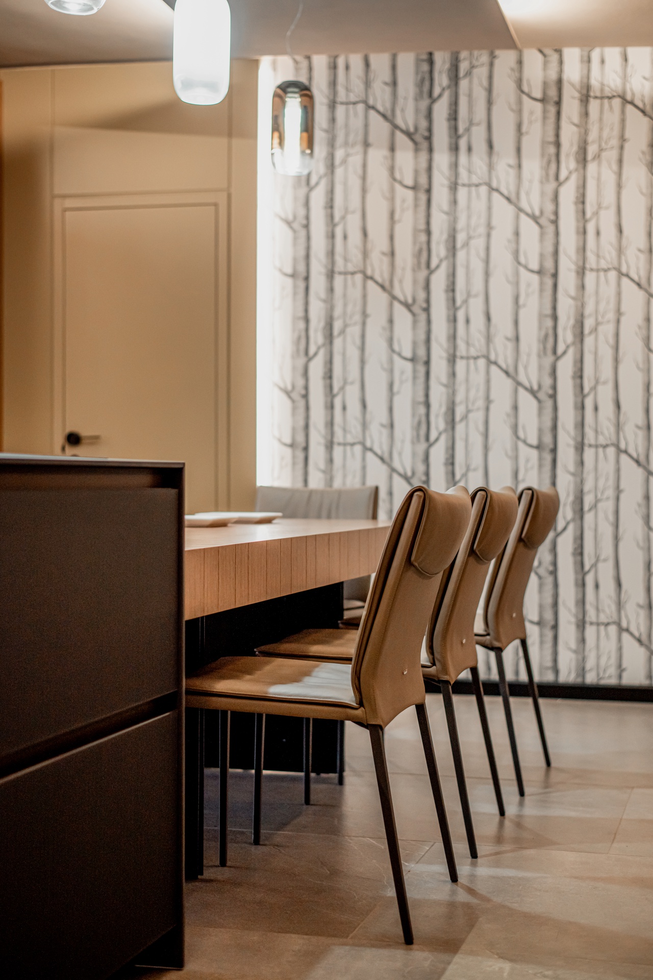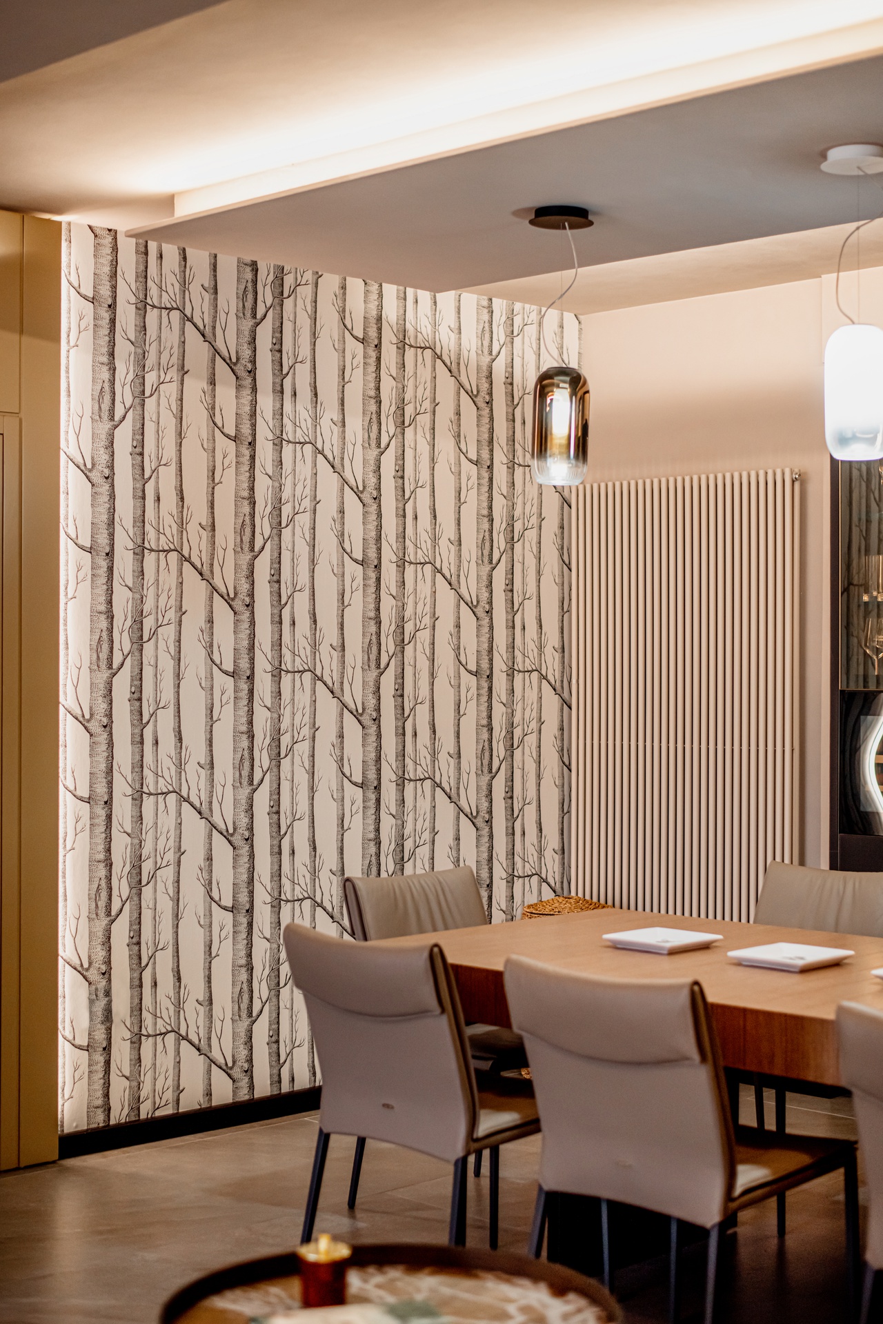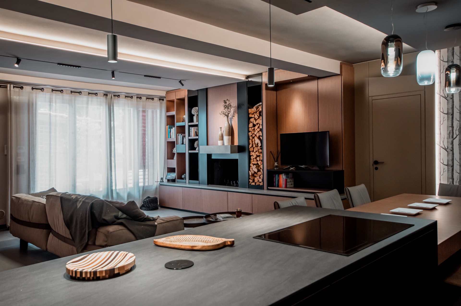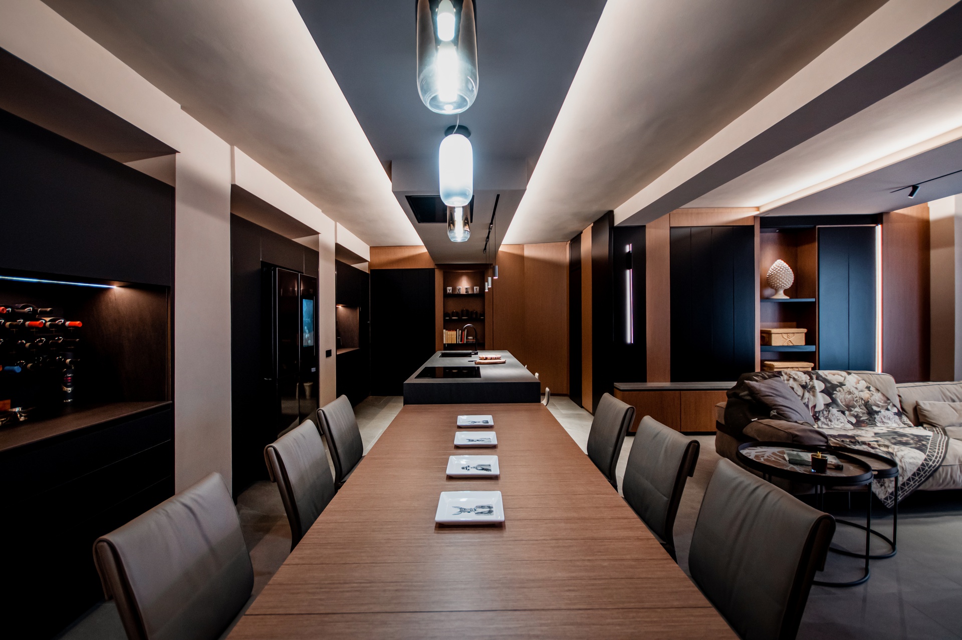 Una taverna dove ogni spazio è stato ottimizzato, dalle nicchie arredate alle due pareti attrezzate che avvolgono la super isola centrale con tavolo allungabile annesso e un divano super confort. Come materiali ho scelto un legno di colore medio accostato a delle pannellature laccate, mentre la carta da parati apre una finestra immaginaria sulla zona cucina, le finiture dei muri e del soffitto rendono l’ambiente avvolgente e affascinante.