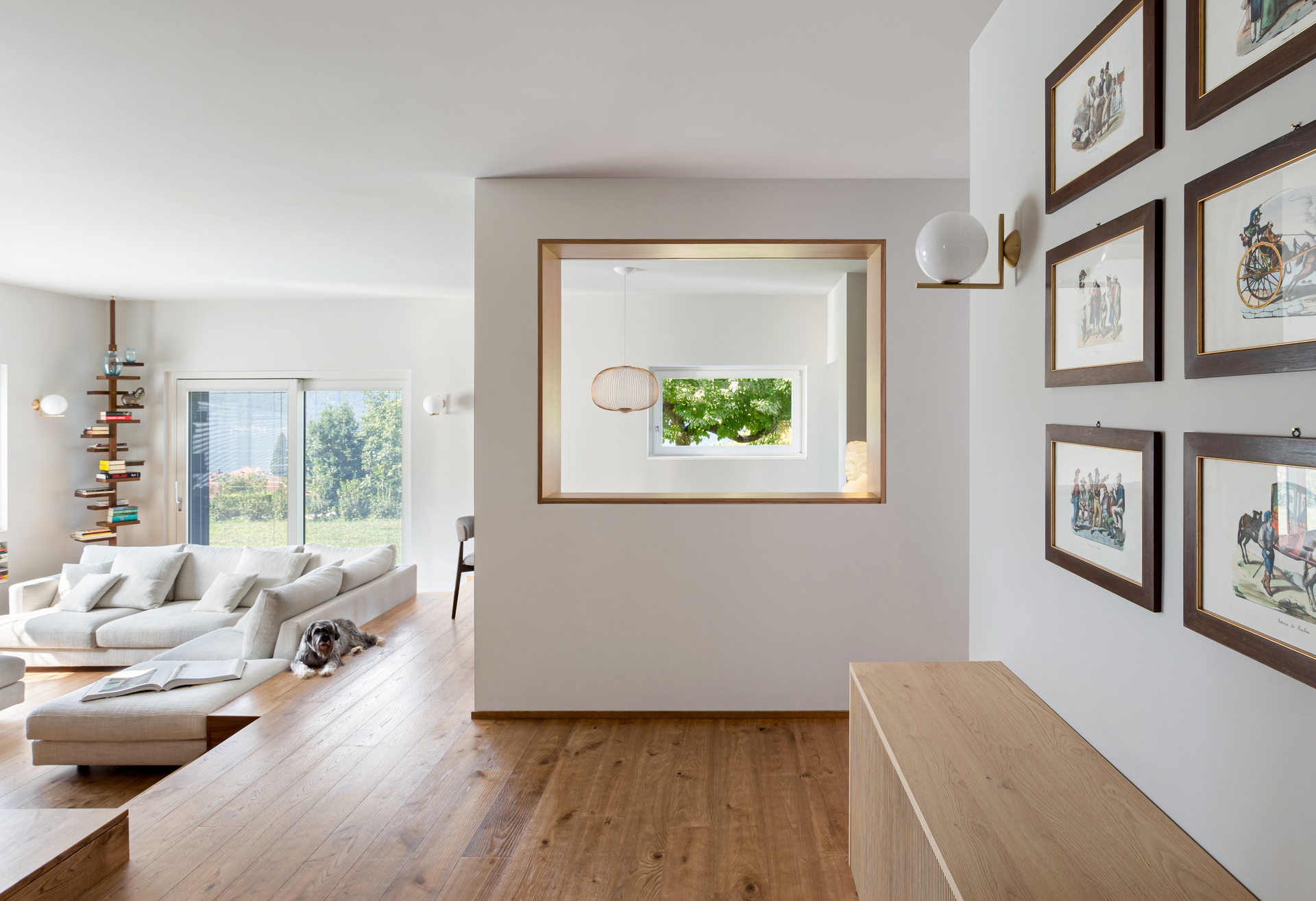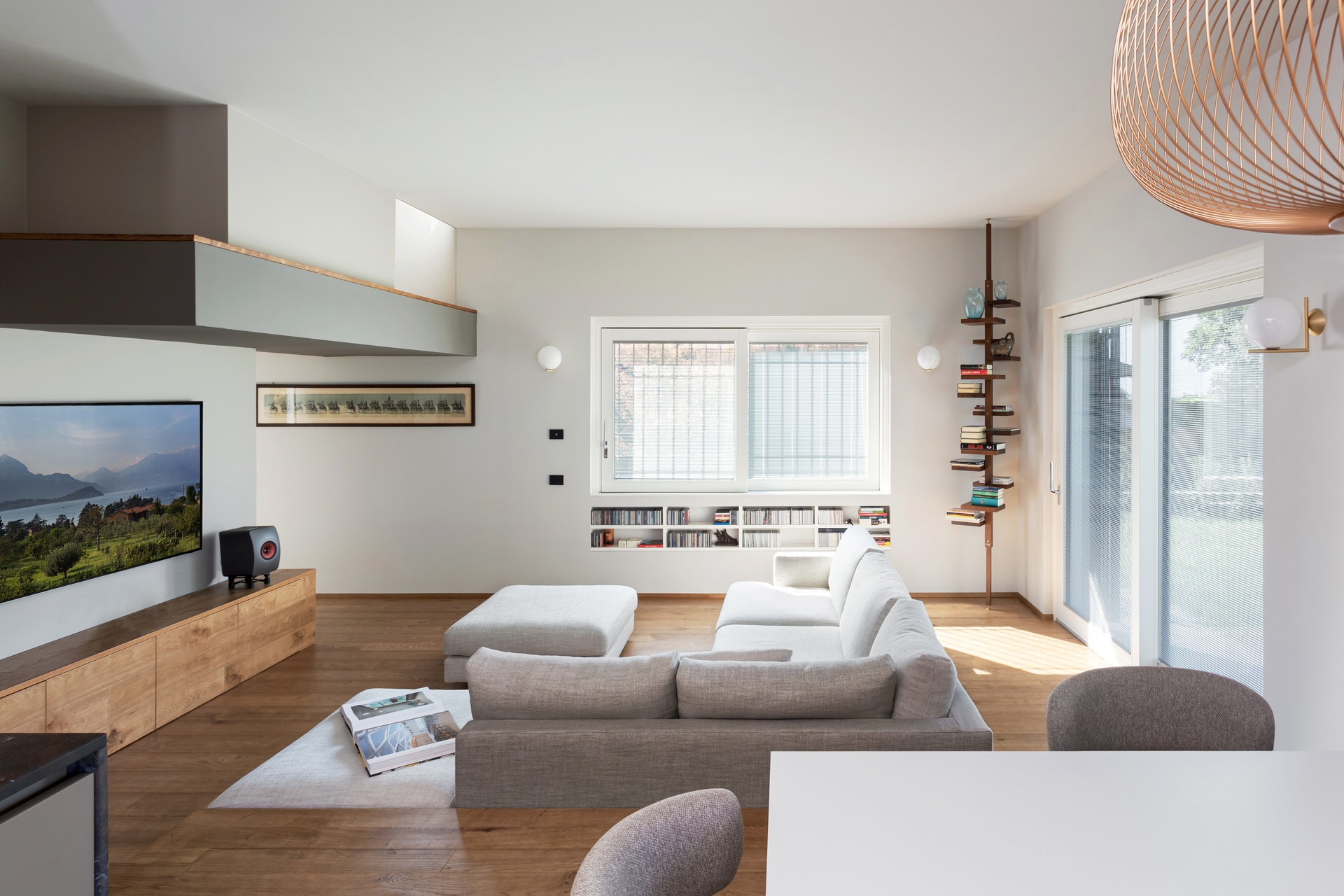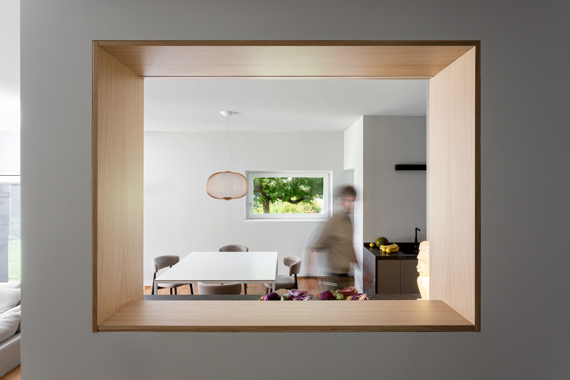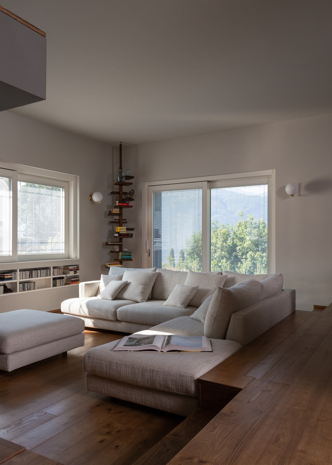 Ristrutturazione completa di una villa di circa 250 mq sul Lago di Como. Il progetto nasce dall'esigenza di trasformare questa casa da luogo di villeggiatura a casa per una coppia. Il concept nasce dall'enfatizzare la luce naturale e la vista verso il lago. Per questo abbiamo sviluppato un progetto in cui gli spazi sono molto aperti e si creano delle prospettive particolari dai vari punti della casa. Dall'ingresso si percepisce subito una sorta di quadro incorniciato da un portale in legno che guarda la cucina e il lago dopo; dalle scale un'apertura bassa chiusa con vetro crea uno scorcio sulla sala. Al piano superiore solo la zona notte con 3 camere, 2 bagni e un grande terrazzo molto riservato.