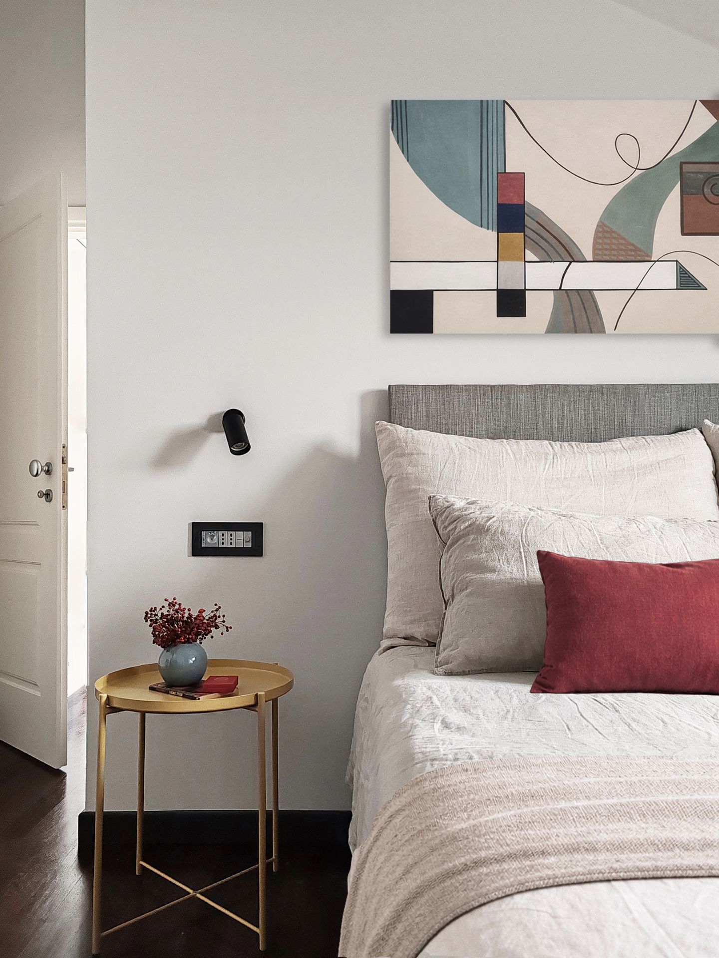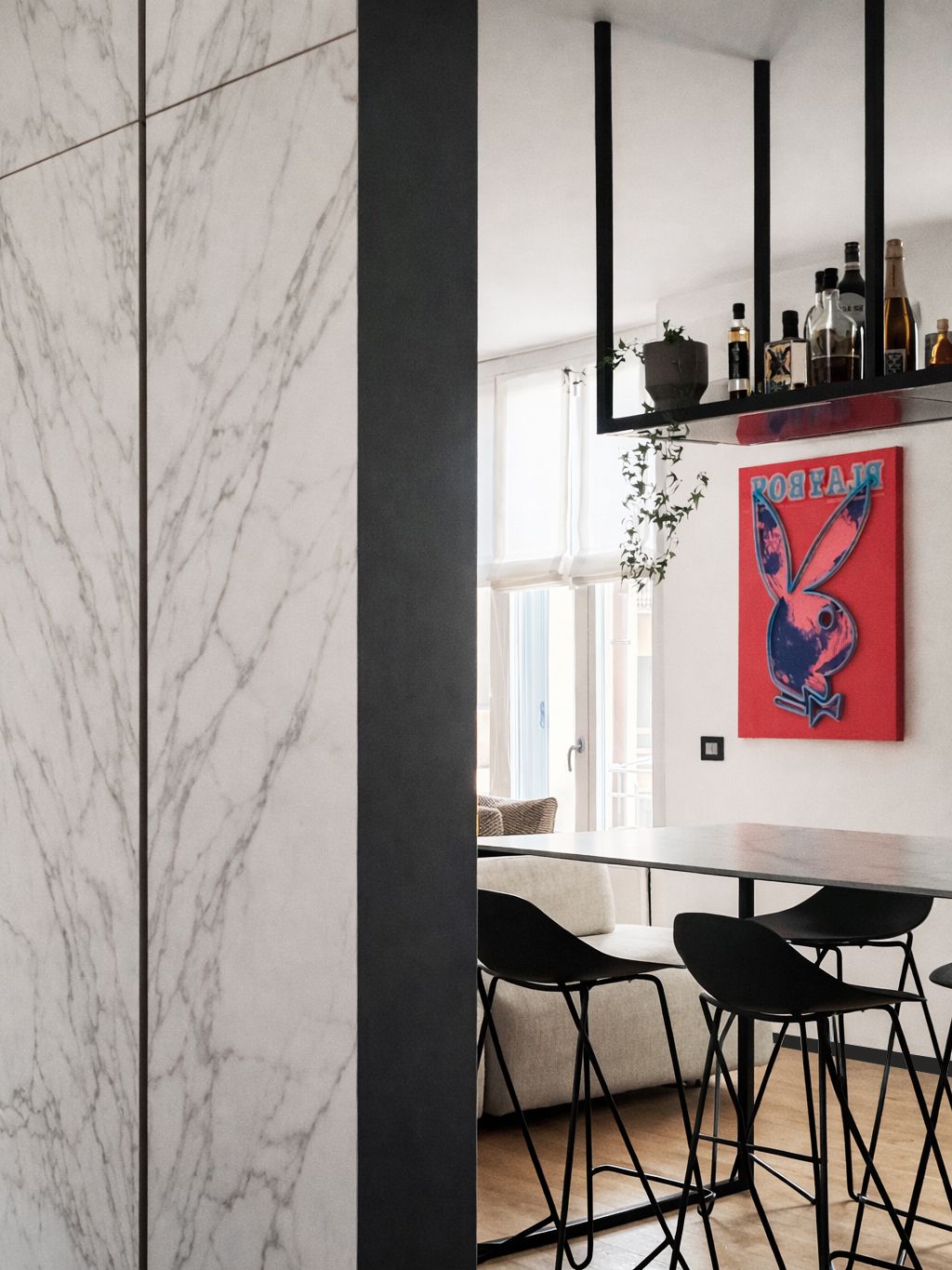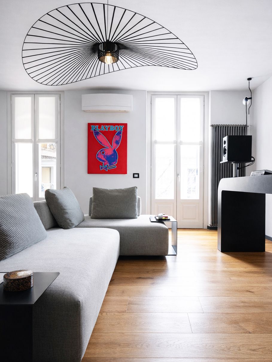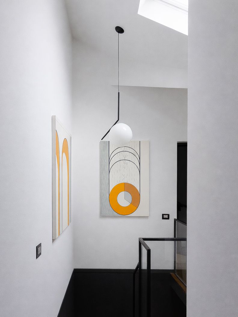 Un rifugio urbano sotto i tetti di Milano, concepito come una partitura silenziosa.Appena varcata la soglia, il buio lieve dell’antracite avvolge lo spazio, mentre la luce filtra da tagli lontani accompagnando lo sguardo. La cucina, nera come un pianoforte chiuso, dialoga con marmo e specchi, aprendo senza confini netti al soggiorno: un divano leggero, una libreria-wunderkammer e una consolle DJ booth al centro, manifesto silenzioso delle passioni del proprietario.Le scale bicolore, tra off-white e off-black, segnano il ritmo della casa e conducono alle stanze più intime. La camera padronale, immersa nel verde salvia, è pensata come un rifugio modulabile tra luce e silenzio. La camera ospiti accoglie come una piccola suite d’albergo, definita da una fascia orizzontale in salvia intenso e da un lit de repos in lino. È un omaggio alla filoxenia, l’ospitalità greca: la bellezza come gesto di rispetto verso chi arriva da lontano. Questa casa non è solo progettata, ma scritta: un luogo per chi viaggia e desidera tornare, per chi cerca spazi che accolgano senza invadere.