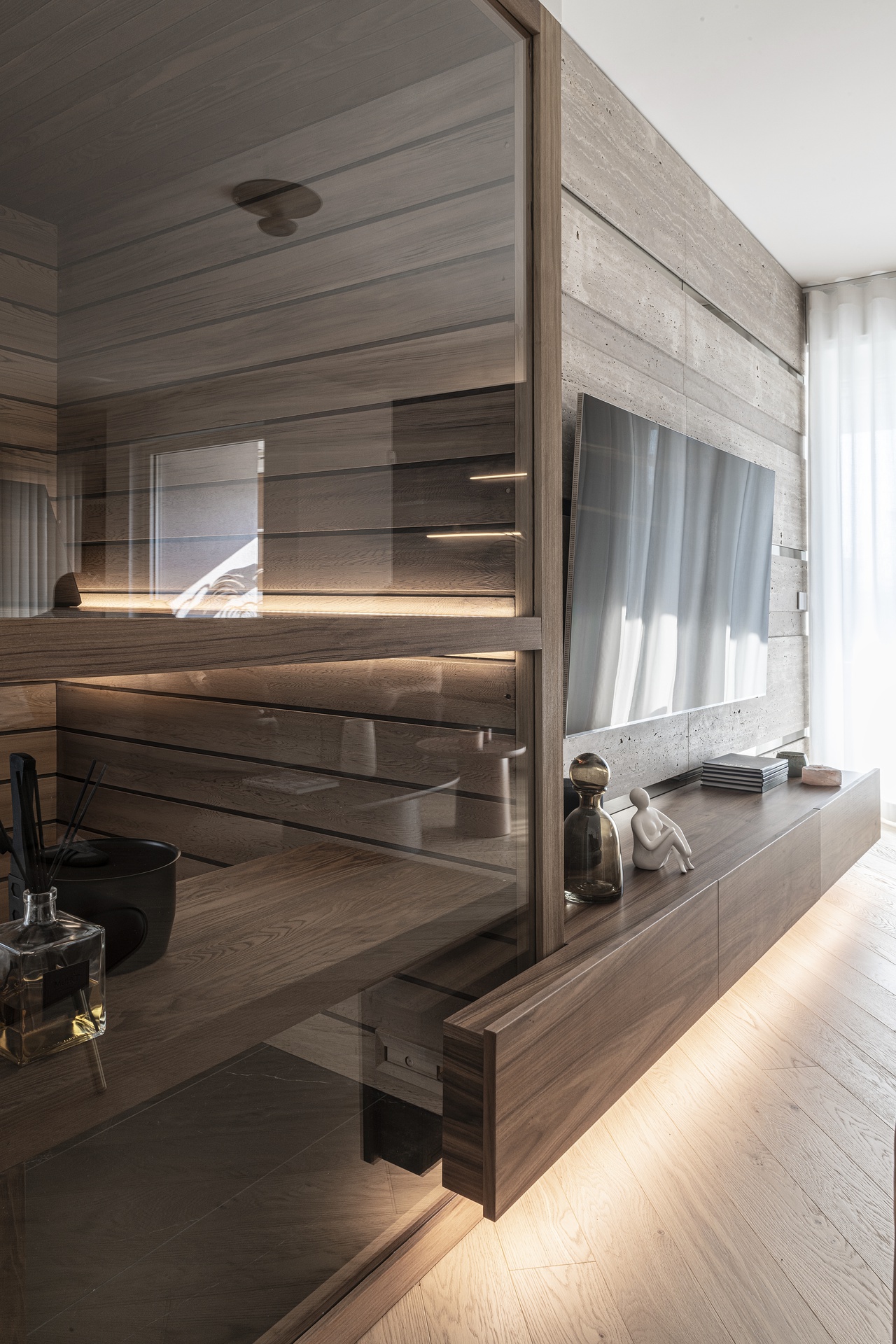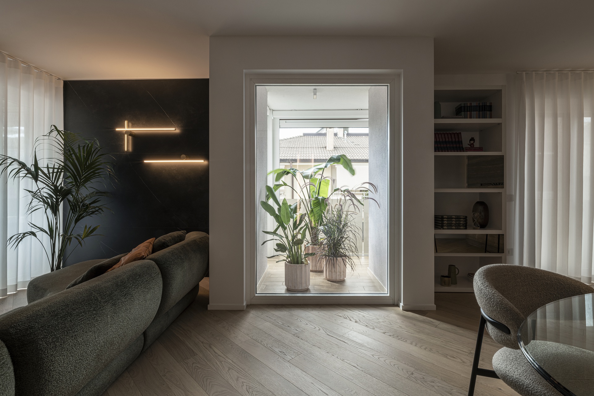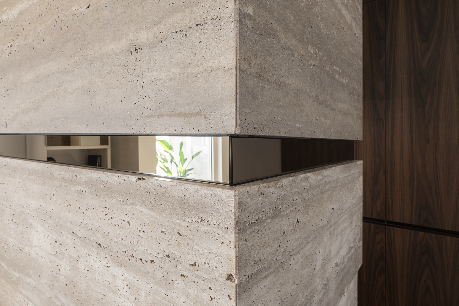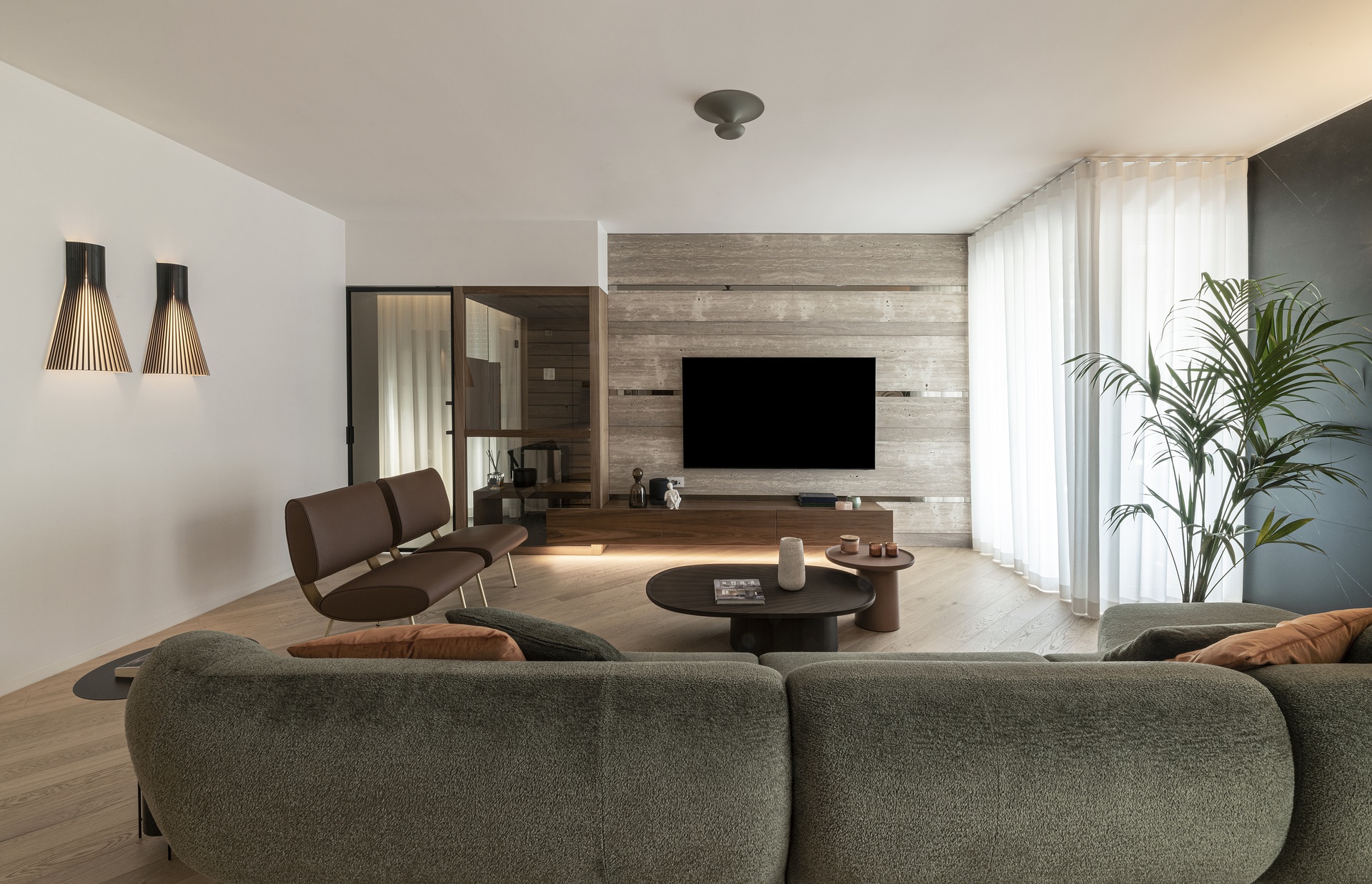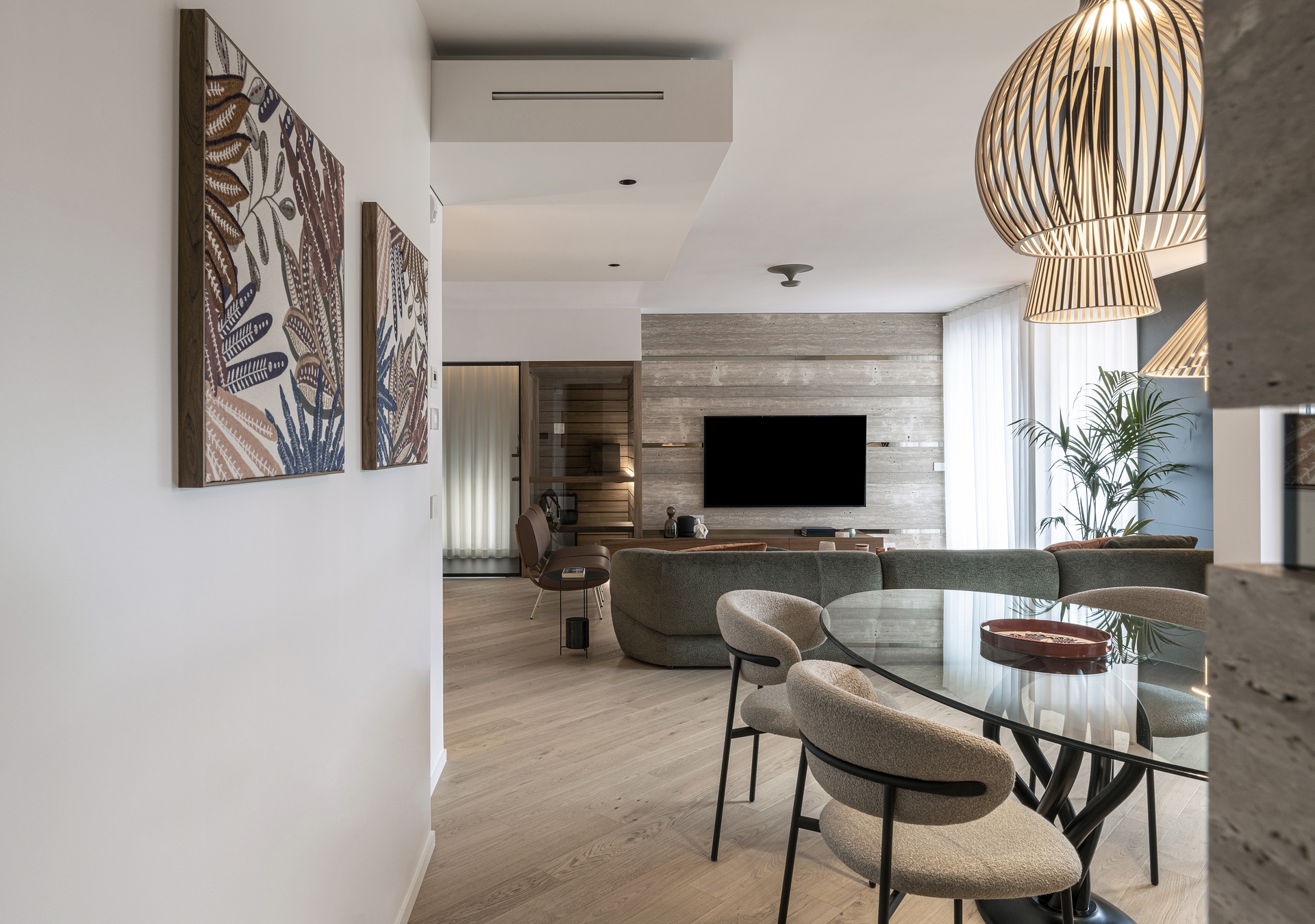 In questo appartamento di circa 120 mq, il restyling dà vita a un ambiente che respira luce, comfort e armonia materica. Il cuore del progetto è una sorprendente parete TV con sauna a vista, incastonata in un antibagno scultoreo, dove un lavabo monolitico e una sauna angolare dialogano con la zona giorno attraverso trasparenze studiate, lasciando intravedere il benessere come parte integrante dell’abitare quotidiano. L’open space, ampio e luminosissimo, si apre su grandi vetrate affacciate su un angolo verde, dove vasi e piante creano una connessione diretta con l’esterno, quasi a portare un giardino dentro casa. La cucina, raccolta ma aperta, è schermata da un setto materico in travertino, attraversato da tagli orizzontali in specchio bronzo, gli stessi che ritornano sulla parete TV, creando riflessi, giochi di luce e una narrazione coerente che lega ogni spazio in un’unica atmosfera calda e sofisticata.