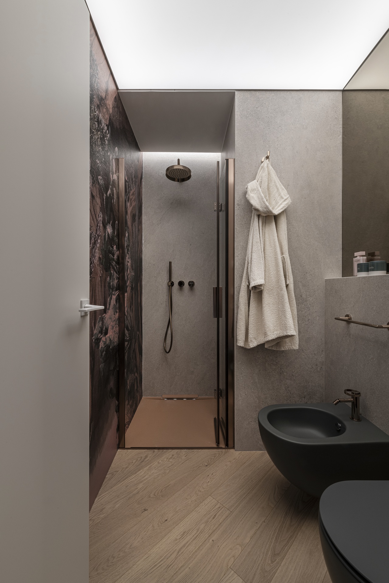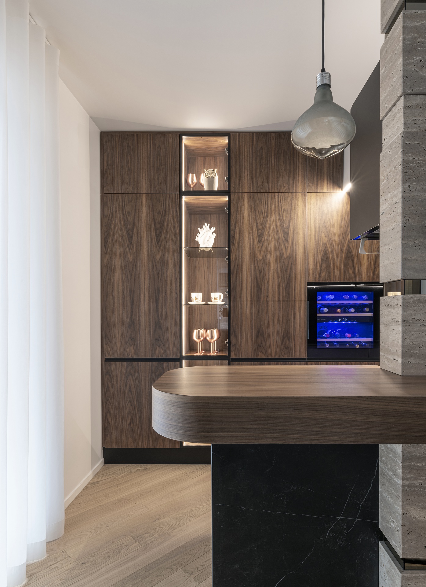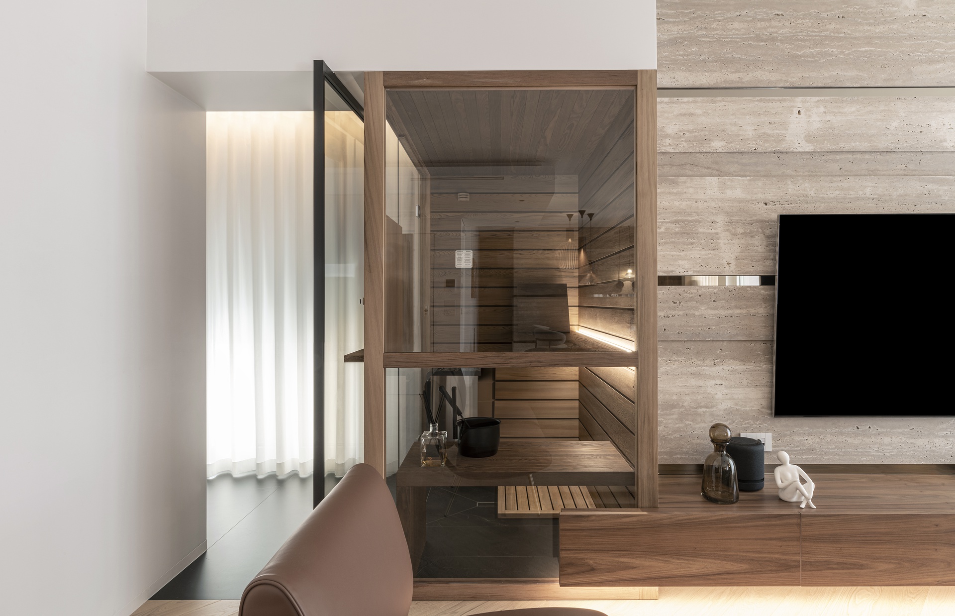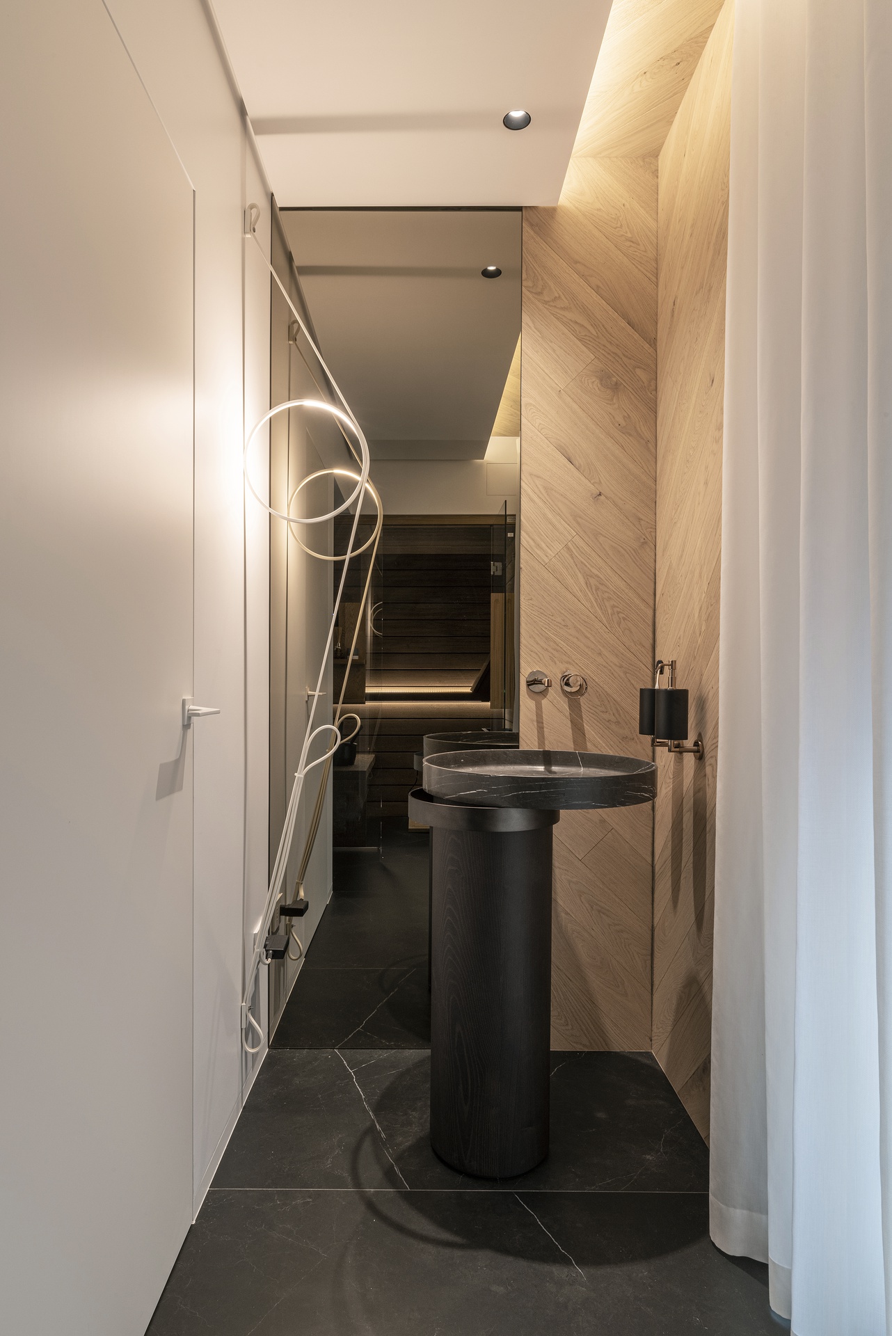 In questo appartamento di circa 120 mq, il restyling dà vita a un ambiente che respira luce, comfort e armonia materica. Il cuore del progetto è una sorprendente parete TV con sauna a vista, incastonata in un antibagno scultoreo, dove un lavabo monolitico e una sauna angolare dialogano con la zona giorno attraverso trasparenze studiate, lasciando intravedere il benessere come parte integrante dell’abitare quotidiano. L’open space, ampio e luminosissimo, si apre su grandi vetrate affacciate su un angolo verde, dove vasi e piante creano una connessione diretta con l’esterno, quasi a portare un giardino dentro casa. La cucina, raccolta ma aperta, è schermata da un setto materico in travertino, attraversato da tagli orizzontali in specchio bronzo, gli stessi che ritornano sulla parete TV, creando riflessi, giochi di luce e una narrazione coerente che lega ogni spazio in un’unica atmosfera calda e sofisticata.