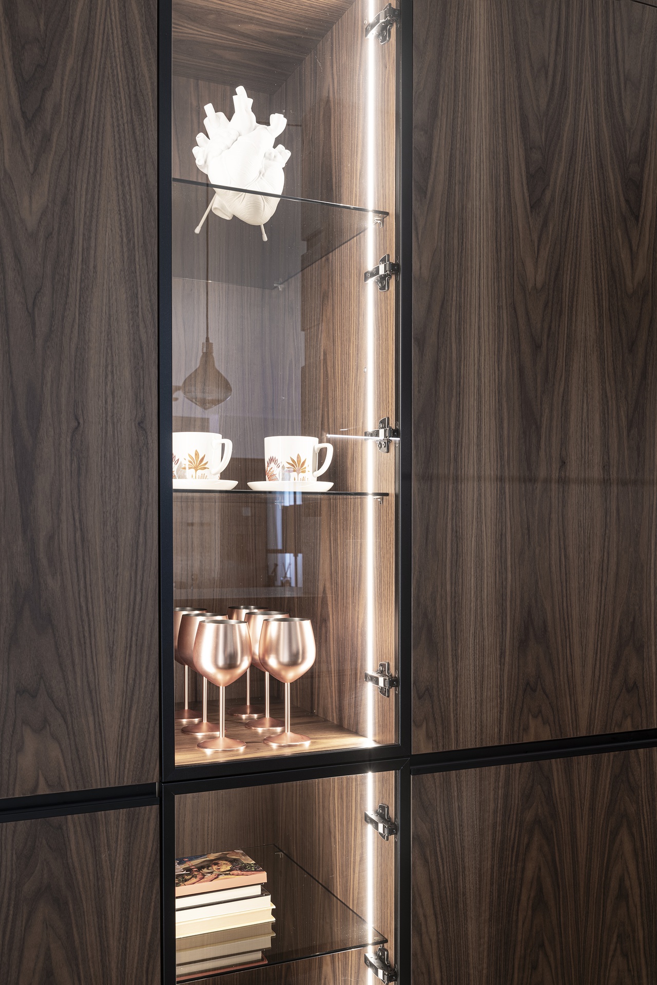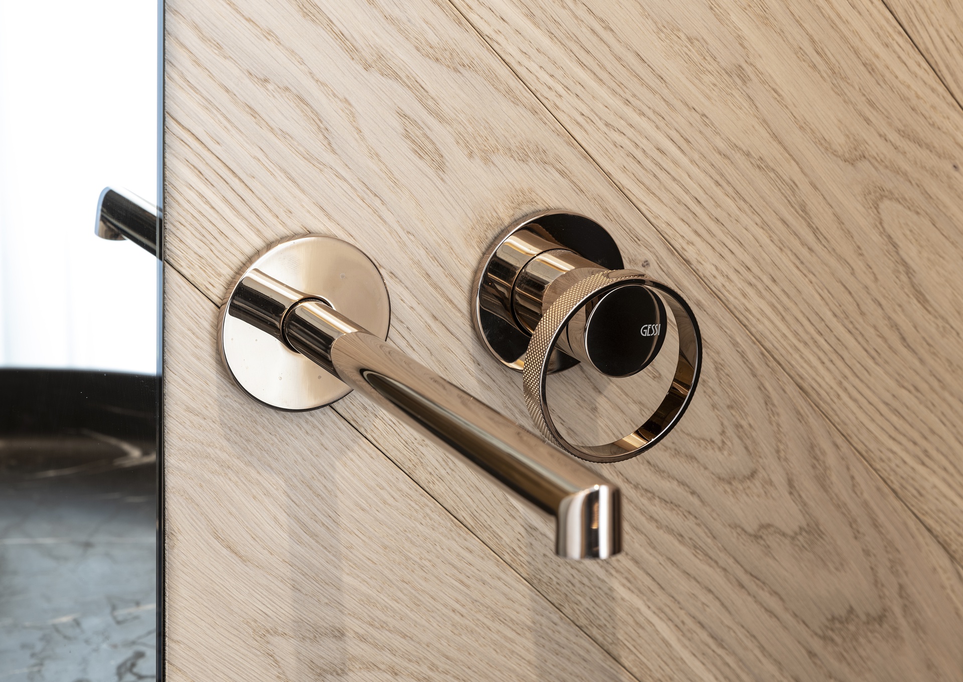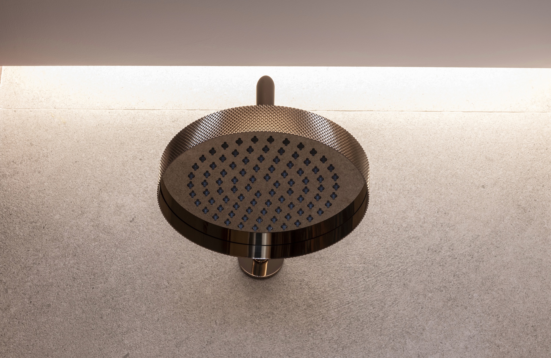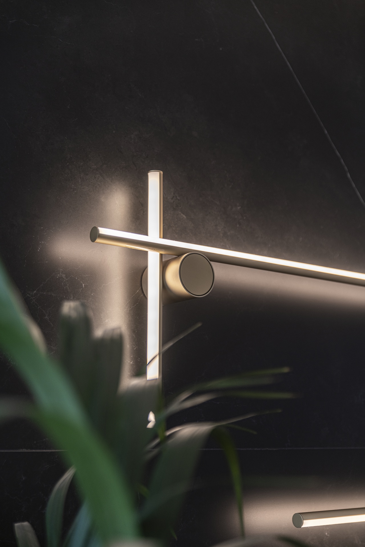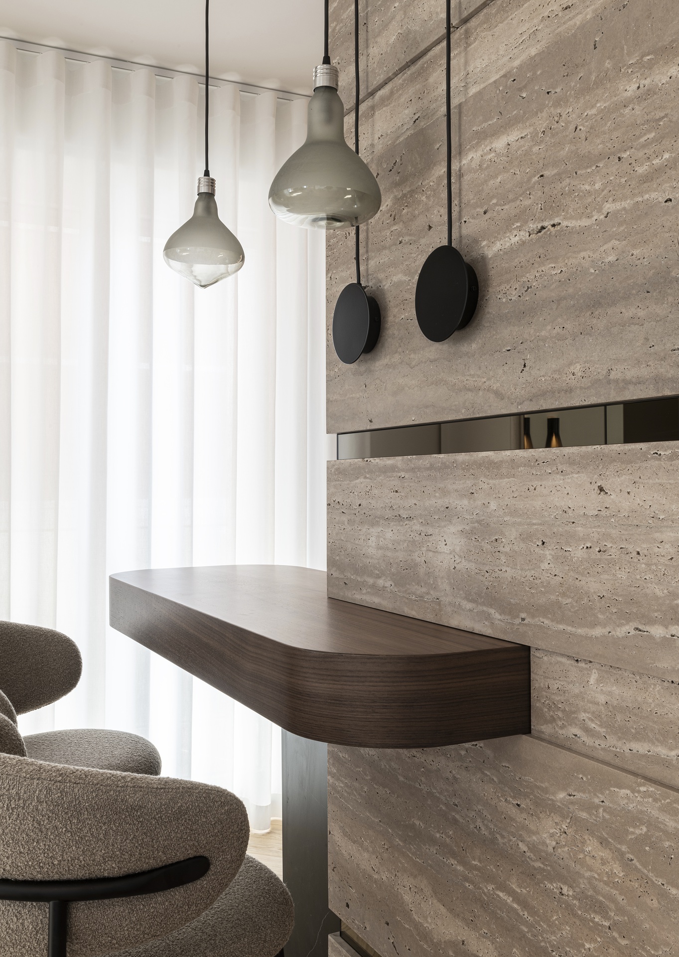 In questo appartamento di circa 120 mq, il restyling dà vita a un ambiente che respira luce, comfort e armonia materica. Il cuore del progetto è una sorprendente parete TV con sauna a vista, incastonata in un antibagno scultoreo, dove un lavabo monolitico e una sauna angolare dialogano con la zona giorno attraverso trasparenze studiate, lasciando intravedere il benessere come parte integrante dell’abitare quotidiano. L’open space, ampio e luminosissimo, si apre su grandi vetrate affacciate su un angolo verde, dove vasi e piante creano una connessione diretta con l’esterno, quasi a portare un giardino dentro casa. La cucina, raccolta ma aperta, è schermata da un setto materico in travertino, attraversato da tagli orizzontali in specchio bronzo, gli stessi che ritornano sulla parete TV, creando riflessi, giochi di luce e una narrazione coerente che lega ogni spazio in un’unica atmosfera calda e sofisticata.