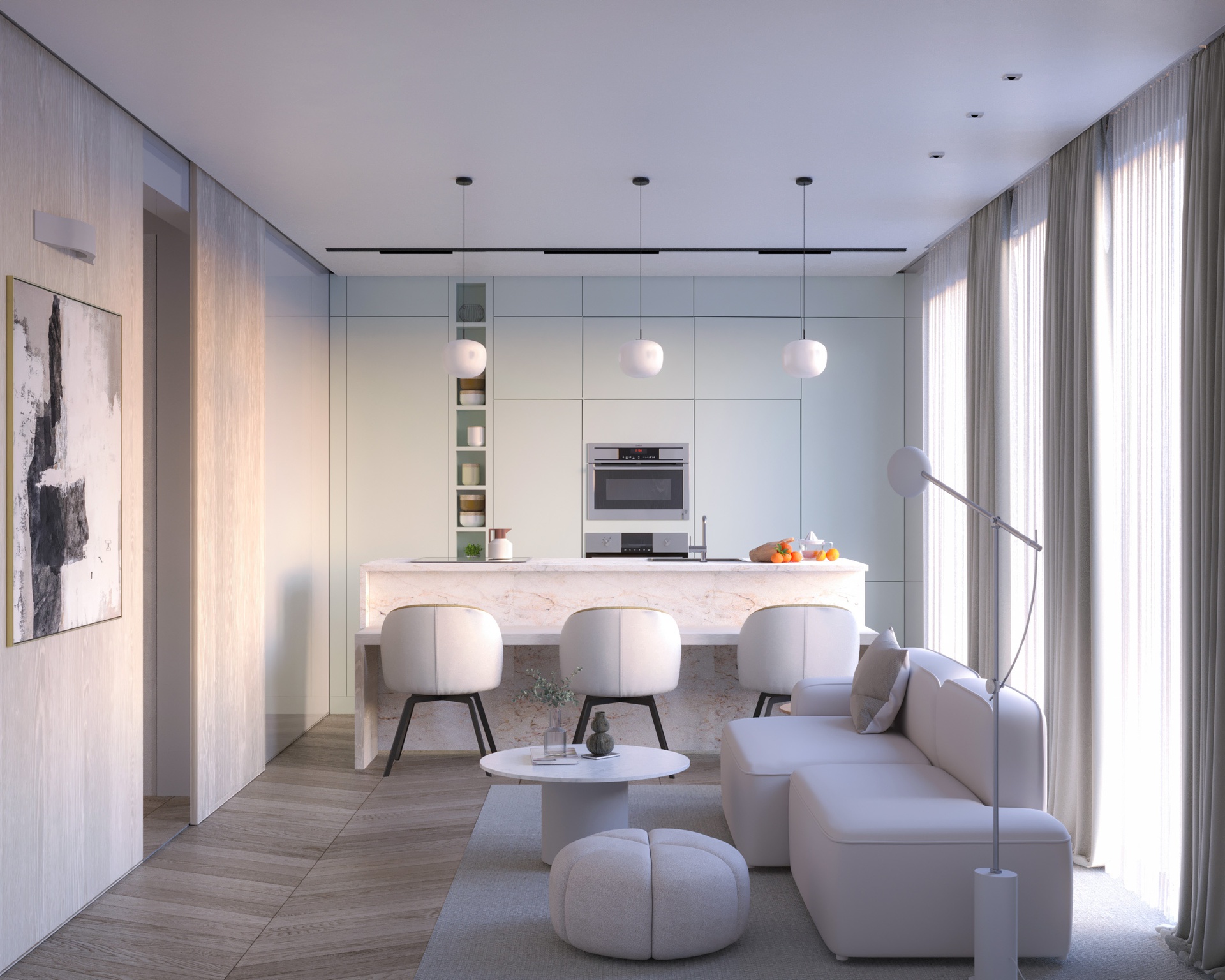 Soggiorno open space, progettato per una cliente single, con colori in verde, beige e bianco.