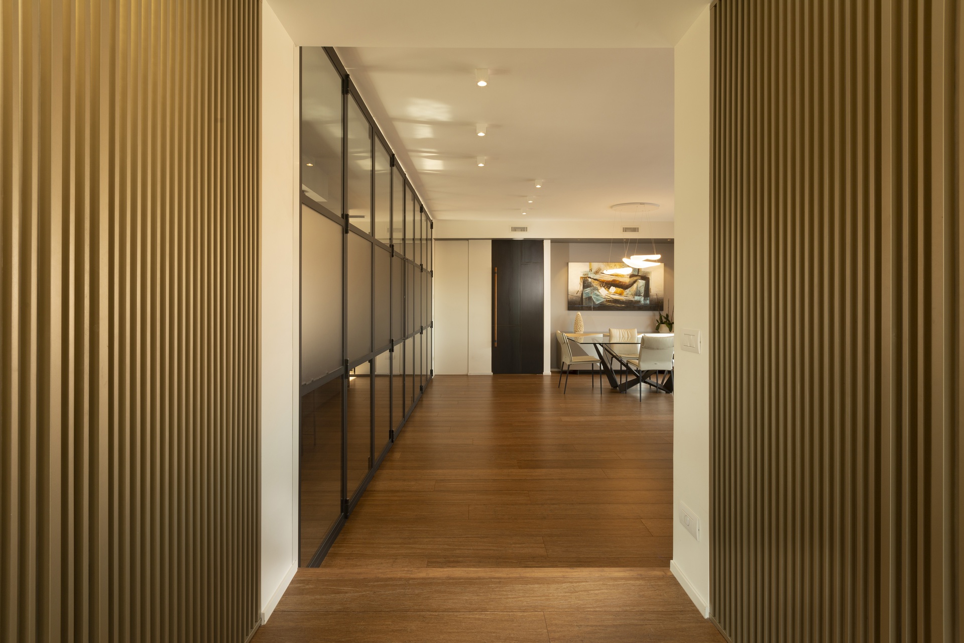 I proprietari di questo splendido attico hanno subito espresso il desiderio di avere una casa dove poter ospitare tante persone. Amano cucinare per cui la cucina doveva avere un ruolo fondamentale ma allo stesso tempo volevano anche che potesse essere nascosta nel momento in cui nell'ambiente ci fosse stato troppo disordine. Abbiamo inserito una vetrata di 6 metri con una tecnologia a libretto che potesse essere totalmente o parzialmente chiusa ma nel momento in cui la vetrata è completamente aperta sul living, diventa protagonista assoluta l'isola di 4 metri total black nella quale si inserisce il piano snack in rovere naturale.
