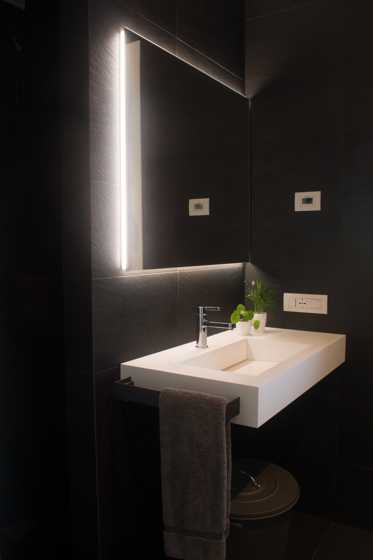 Il committente adora i particolari dei loft americani ma si sa che in Italia è difficile trovare un appartamento che si adatti a questo stile, soprattutto fuori città.La concentrazione per adattare l'involucro a questo stile è stato sulla scelta dei materiali e dei colori, cercando di contestualizzare anche l'anima moderna che lo stesso edificio presenta.L'intero appartamento è rivestito da un pavimento in parquet mentre cucina e bagni in gres porcellanato.Il colore nero fa da protagonista in cucina e crea un ambiente tipico dei vecchi "speakeasy" con luci soffuse al piano bar dell'isola. L'area pranzo è dettata da tratti distintivi tutti industriali: parete rivestita in mattoni, spallette in cartongesso effetto corten per contenere delle luci a led, cavi a vista del lampadario a sospensione, tavolo in legno con gambe in metallo e sedie wireframe in alluminio nero.In soggiorno è stato ripreso uno stile più moderno mantenendo gli stessi colori e materiali di tutta la casa: divano in tessuto nero-blu, parete attrezzata in legno e cemento sostenuta da una cantinetta-frigo posta alla base.Nei bagni sono stati scelti sanitari moderni per non appesantire troppo l'ambiente. La camera è una suite: la scelta della vasca freestanding posta davanti al letto e un armadio completamente a vista con ante in vetro, distrae da tutti gli altri complementi.Marchi utilizzati:Bonaldo: divano.Vasca: Glass 1989Sanitari: SimasRubinetteria: NewFormCucina in materiale Fenix e Dekton: ArrexRivestimenti: EdilnovaTavolo da pranzo: RiflessiSedie: VitraSgabelli: KartellLuci: Aim di Flos, Axolight, Nemo.