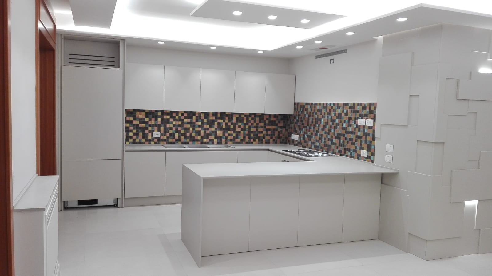 In questo appartamento la monocromia fa da padrona per dare spicco ad accenti nei toni del verde scuro e dei legni per i dettagli.Total look customizzato