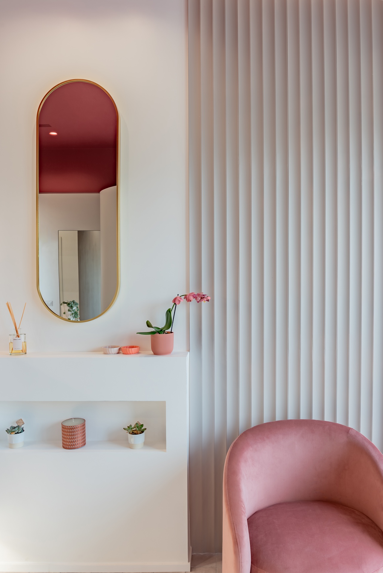 Un volume morbido, un insieme di linee verticali e un gioco di riflessi dorati si alternano sotto un unico soffitto viola. Questo è lo scenario di New Life Center, un centro estetico dal gusto giovane con un tocco chic.Il progetto ha risposto alla necessità di avere la zona accoglienza distinta dalla zona dei trattamenti senza creare una netta divisione ma attraverso un passaggio fluido dalla zona di ingresso all’area cabine. Il fulcro di questo passaggio è la parete curva che dolcemente riduce l’ampiezza dello spazio all’entrata trasformandolo in un percorso individuale verso l’interno del locale. La variazione dimensionale è sottolineata dal cambio di pavimento e da un leggero ribassamento del soffitto colorato.La parete curva ha risolto a livello spaziale la spigolosità della sagoma planimetrica esistente, e contemporaneamente hapermesso la creazione di un punto focale sulla parete di fondo, di fronte all’ingresso e indirizza lo sguardo direttamente verso il bancone. Il visitatore è in comunicazione visiva diretta con il personale di benvenuto, con il marchio e i prodotti in vendita.La parete di fondo così come l’area di attesa completa di sedute, sono trattate con una boiserie tridimensionale verticale, a leggero contrasto con le superfici bianche adiacenti. I dettagli degli arredi sono in ottone spazzolato per creare un gioco di riflessi caldi e un’atmosfera più sofisticata.Nell’area delle cabine si alternano giochi di specchi e luci, mensole, fasce di ottone e diversi rivestimenti. La finitura delle pareti cambia in base al trattamento estetico a cui la cabina è dedicata: in alcune viene riproposta la mattonella con dettagli materici della pavimentazione dell’ingresso, dal sapore naturale, in altre le linee verticali della boiserie individuano l’area di servizio all’operatrice.Una linea luminosa interrompe i rivestimenti a parete enfatizzando la differenza di altezza tra il cielo colorato e i divisori interni. La distanza è colmata da una fascia di ottone continua che attraversa le cabine e crea un unico elemento orizzontale.In questo progetto l’elemento principale è il soffitto, un manto colorato che nasconde tutta la tecnologia impiantistica, per la quale la scelta delle componenti a vista è stata fondamentale: bocchette filo-muro e faretti verniciabili permettono l’omogeneità della superficie colorata riducendo al minimo le interruzioni.Il soffitto avvolge gli spazi come l’incarto di una caramella: il colore forte cattura l’attenzione e fa scoprire un interno fatto di atmosfere delicate ma intense.