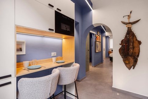 Nel quartiere di Chiaia, a pochi passi dal lungomare di Napoli, si è ricevuto incarico di poter effettuare un intervento mirato di restyling di un appartamento la cui ultima ristrutturazione risaliva agli anni 80 del secolo scorso.Volendo la committenza preservare la pavimentazione esistente, parquet in essenza di aformosia, oggi alquanto rara, ci si è concentrati nella rilettura e riconfigurazione di parte degli spazi dell’appartamento, con ricalibrazione e posizionamento delle funzioni interne ai singoli ambienti e creando arredo con forme di colore, variandone la nuance, a seconda della funzione dell’ambiente stesso.Oltre al parquet sono state preservate, inoltre, le porte di ingresso alle stanze, tale era la richiesta della committenza, trattandosi di porte di noce massello di difficile riproduzione.Rispetto all’originaria configurazione si è preferito optare per la realizzazione di un unico grande spazio soggiorno, andando a eliminare le pregresse suddivisioni che creavano più spazi di piccole dimensioni.La realizzazione di uno spazio unico, grande ed arioso, ha consentito, allo stesso tempo, di poter organizzare lo spazio stesso con funzioni ben definite e con propria collocazione ideale all’interno del grande ambiente, ovvero uno spazio soggiorno con parete attrezzata ed una parte, con tavolo pranzo, adibita alla socializzazione conviviale.Il colore accompagna sin dall’ingresso, con quello che viene definito un effetto “scatola”, verso l’ambiente soggiorno divenendo un elemento d’arredo vero e proprio grazie alla distribuzione geometrica sulle pareti che danno verso l’ambiente principale dell’abitazione.Le camere da letto sono state collocate nella parte finale dell’appartamento, usufruendo della conformazione longitudinale della casa per poter creare una suddivisione ben definita tra zona notte e zona giorno.Anche nella camera patronale è stata utilizzata una conformazione geometrica del colore, andandosi ad estendere anche su parte del soffitto di tale ambiente, cosi da creare un gioco prospettico per avere maggiore profondità dello spazio.I bagni sono stati progettati con l’uso di ceramiche con colorazione neutra, per la maggior parte dell’estensione dell’ambiente, utilizzando fantasie di colore e disegno esclusivamente in parti dove si voleva maggiormente creare un “focus”.