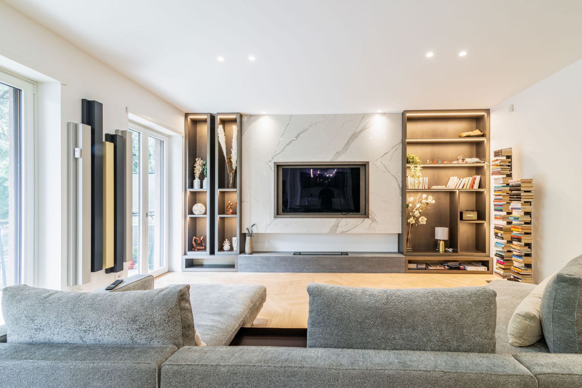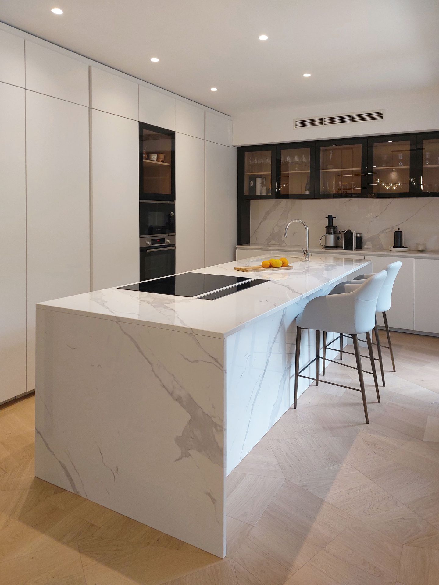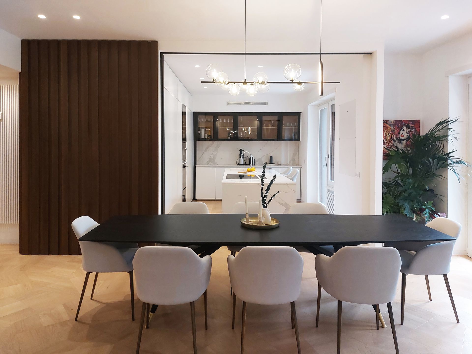 Situato nel cuore di Roma, questo progetto è caratterizzato da spazi ampi e luminosi, ricchi di luce naturale.I materiali di finitura sono stati scelti con cura per creare un’atmosfera calda e accogliente, ma allo stesso tempo contemporanea ed essenziale.Il contrasto tra il marmo e il legno gioca con texture e superfici, dando vita a un ambiente vibrante e scenografico.La grande cucina si affaccia direttamente sulla zona living, separata solo da un’ampia porta vetrata che scompare completamente nella muratura, garantendo una continuità visiva e una percezione a 360 gradi dello spazio.I bagni, rifiniti in pietra e resina, giocano sulla stessa tonalità declinata in diverse texture, creando movimenti e dettagli inaspettati.