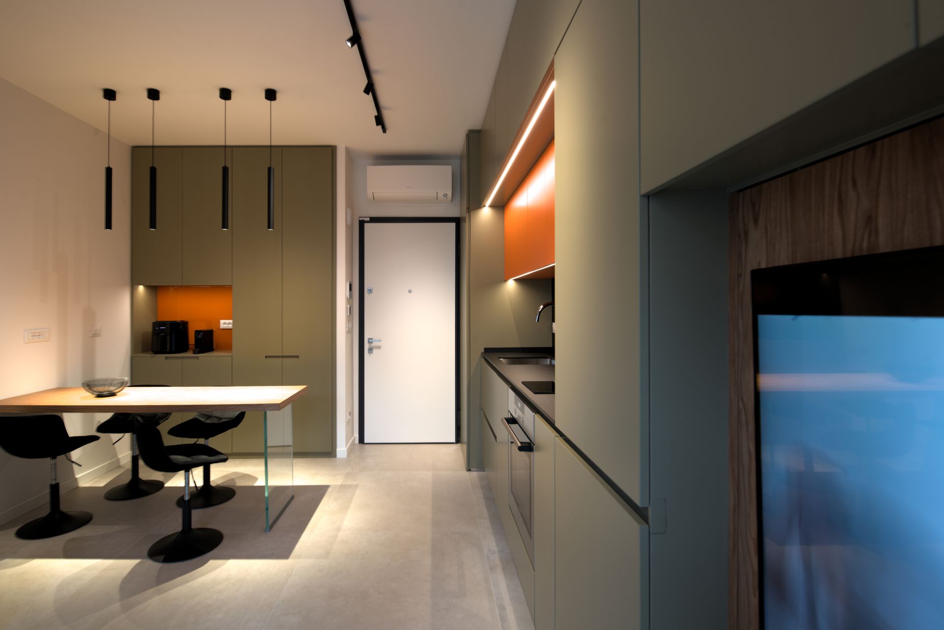 un giovane professionista, desideroso di vivere un ambiente che sappia coniugare la praticità estrema di una casa sempre in ordine con la freschezza di un ambiente, almeno in apparenza, non troppo impegnativo, con spunti di colore e toni neutri a fare da contraltare. Il risultato è stato un ambiente organizzato e sempre in ordine, dove ogni cosa ha il suo posto e e ogni posto ha la sua destinazione, anche l'angolo più recondito.