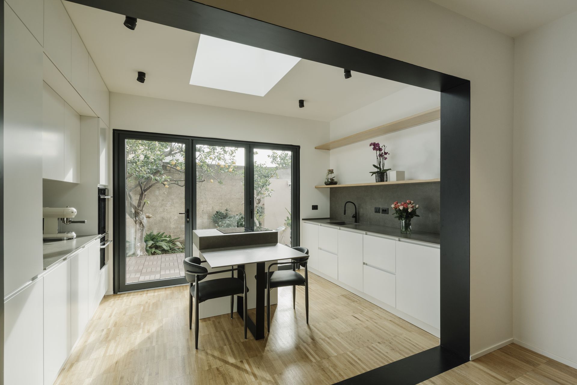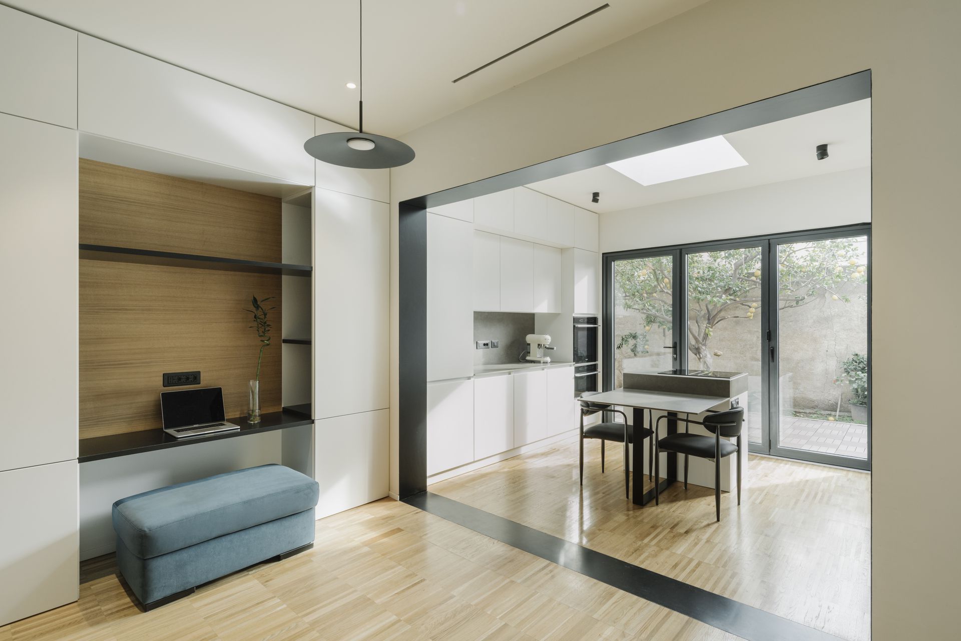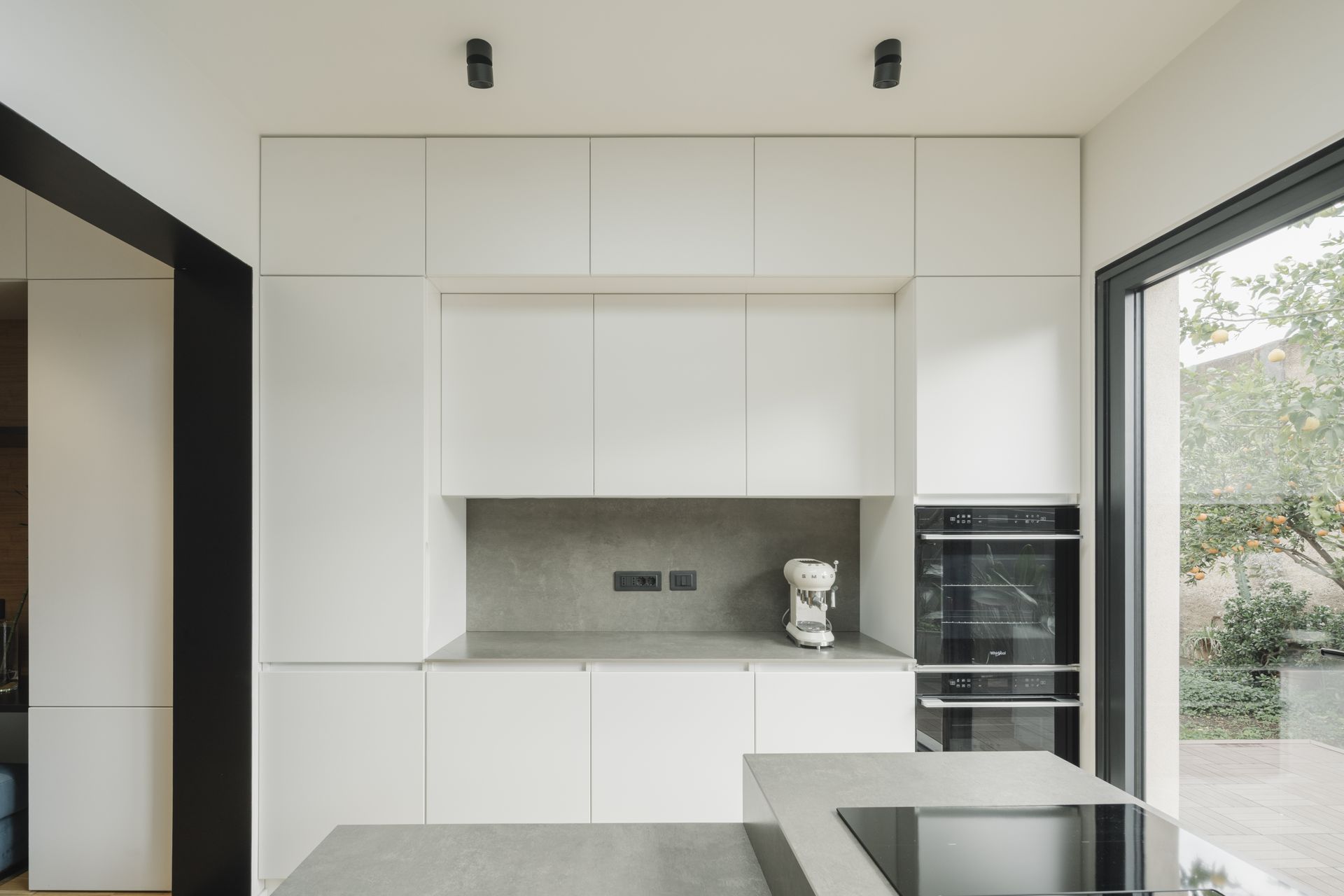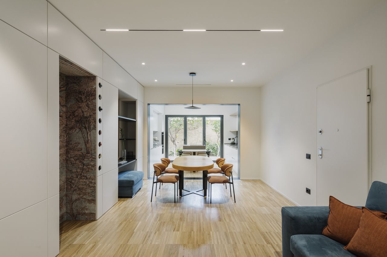 Foto by Cédric DasessonPMB House nasce dalla demolizione e ricostruzione di un edificio unifamiliare degli anni ’60 situato nell'area di Pirri, a Cagliari. L’intervento ripensa integralmente la volumetria e la distribuzione interna, rivoluzionando l’organizzazione degli spazi al fine di ottimizzarne funzioni, percorsi e relazioni con il cortile posteriore.Il progetto segue un criterio geometrico che accomuna tutti gli ambienti, definendo un linguaggio coerente e contemporaneo. La zona living, e la cucina adiacente, sono proiettati verso lo spazio esterno di pertinenza. Gli arredi, interamente disegnati su misura e realizzati da maestranze artigiane, contribuiscono a costruire una continuità materica e visiva tra spazio e funzione. L'isola e il tavolo sono anch'essi progettati e realizzati artigianalmente; quest'ultimo ha la possibilità di estendersi fino a tre configurazioni.Il rovere è un elemento ricorrente dell’intervento: presente negli arredi e nella pavimentazione di tipo industriale. Il passaggio alla zona notte è celato da una nicchia rivestita in carta da parati, mentre il colore diventa protagonista nella camera da letto e nei servizi.Il sistema di climatizzazione, completamente canalizzato, si inserisce nel disegno architettonico attraverso tagli netti nel controsoffitto, integrandosi con l’illuminazione e contribuendo a rafforzare la pulizia formale degli spazi.