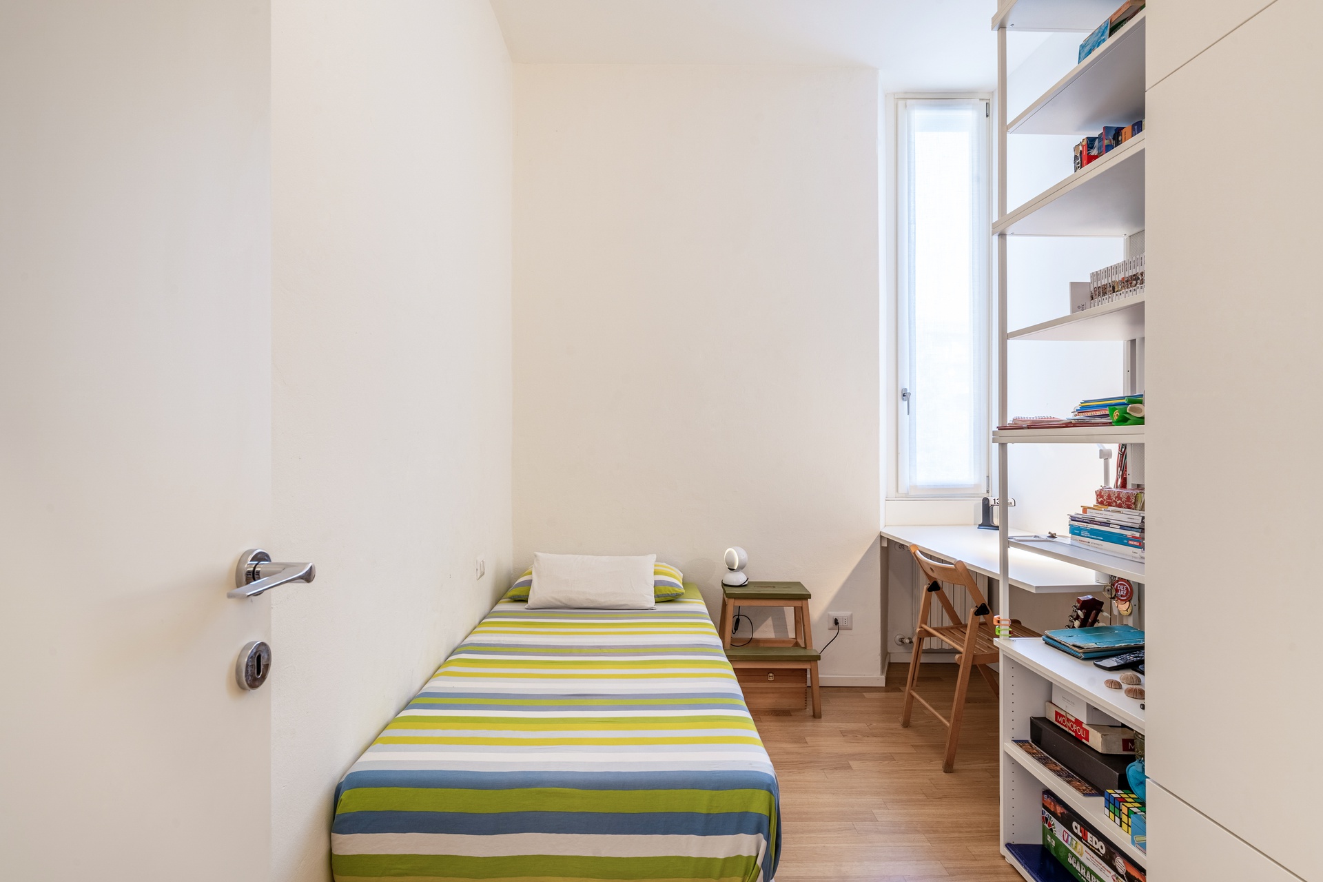 L’appartamento si trova in un edificio inizi Novecento tra due vie, Via Popoli Uniti e Via Venini, a NoLo, un quartiere di Milano dinamico che tenta di fare sistema e valore dell’eterogeneità degli abitanti e delle attività.La casa si sviluppa in pianta ad angolo al primo piano, l’ingresso si trova proprio sulla bisettrice e nello stato di fatto l’ingresso, disegnato da un muro a chiusura del soggiorno e della luce, distribuiva da un lato cucina e bagno e dall’altro un’ampia camera.Le esigenze erano quelle di avere uno spazio comune dove ritrovarsi con amici e familiari e tre piccoli ambienti divisi per la committente e i suoi due ragazzi.Il progetto crea un ingresso aperto sul soggiorno e la cucina a vista che hanno in pianta una forma poligonale. A questo spazio si accede con un’entrata volutamente un po’ sbilenca, accentuata dall’abbassamento che ne segue la sagoma e il disegno del parquet e che distribuisce tutti gli ambienti della casa.Le tre camere e il bagno essenziali nello spazio e nelle forniture sono state progettate con mobili su misura.Il pavimento in parquet di rovere crea dei tappeti modificando la trama a seconda degli spazi. Le porte raso muro e i serramenti in legno con maniglie Lama Olivari fanno da contrappunto discreto ed elegante.La cucina realizzata in multistrato di rovere ha le ante colore caffelatte e verde chiaro celadon e gli sfondati in verde inglese. Abbiamo cercato di renderla più arredo possibile e meno “cucina componibile” con i pensili aperti, sfalsati, e gli elettrodomestici a libera installazione.I tantissimi libri della committente trovano posto nelle librerie minimaliste di Kriptonite Krossing che diventano dei veri e propri quadri a texture multicolore.Fotografie: Claudio Bugatti - Nicola Bortolussi