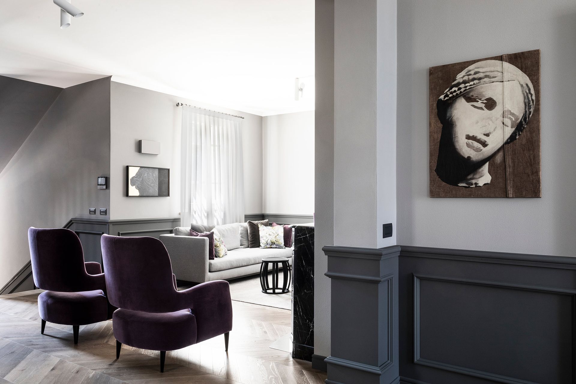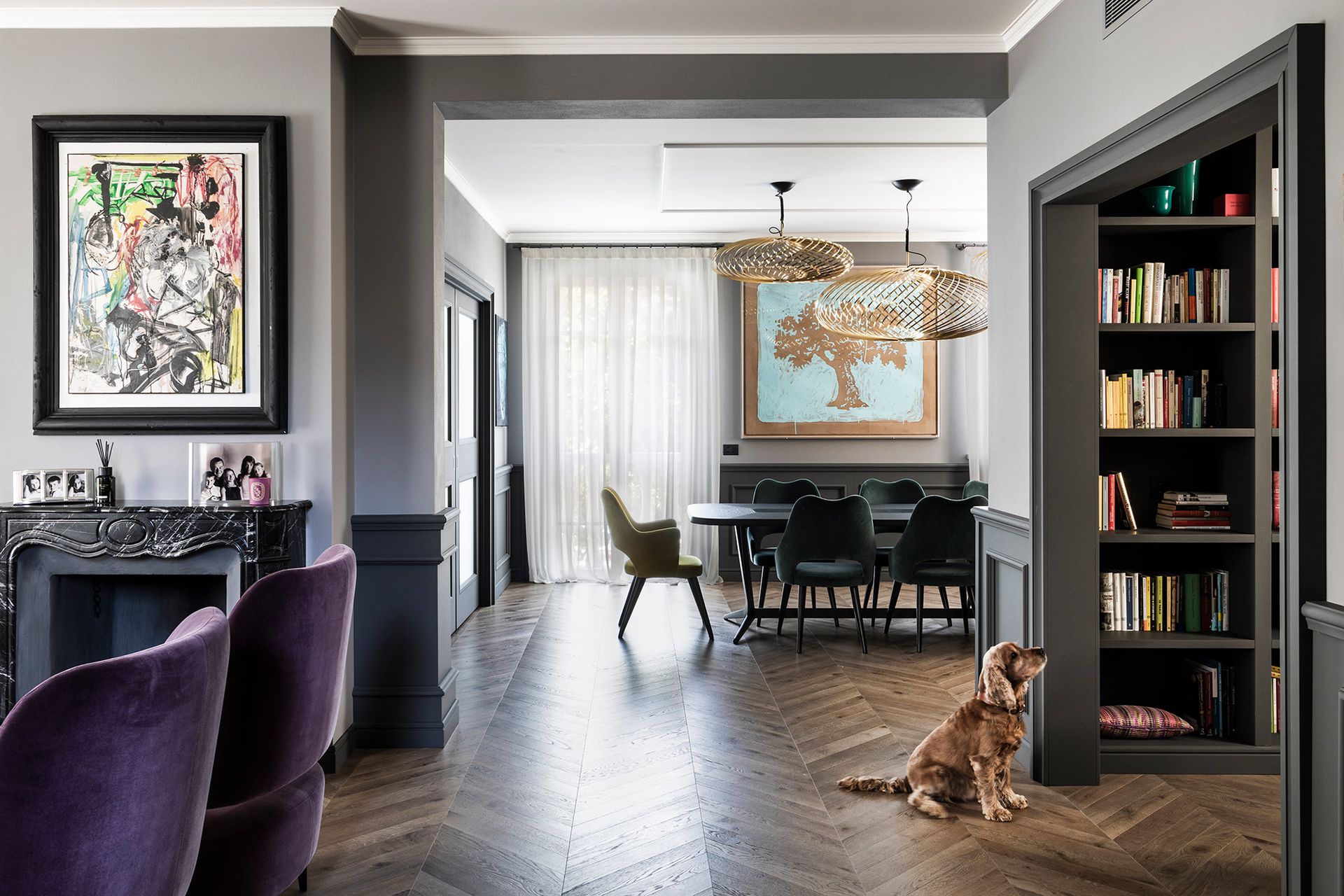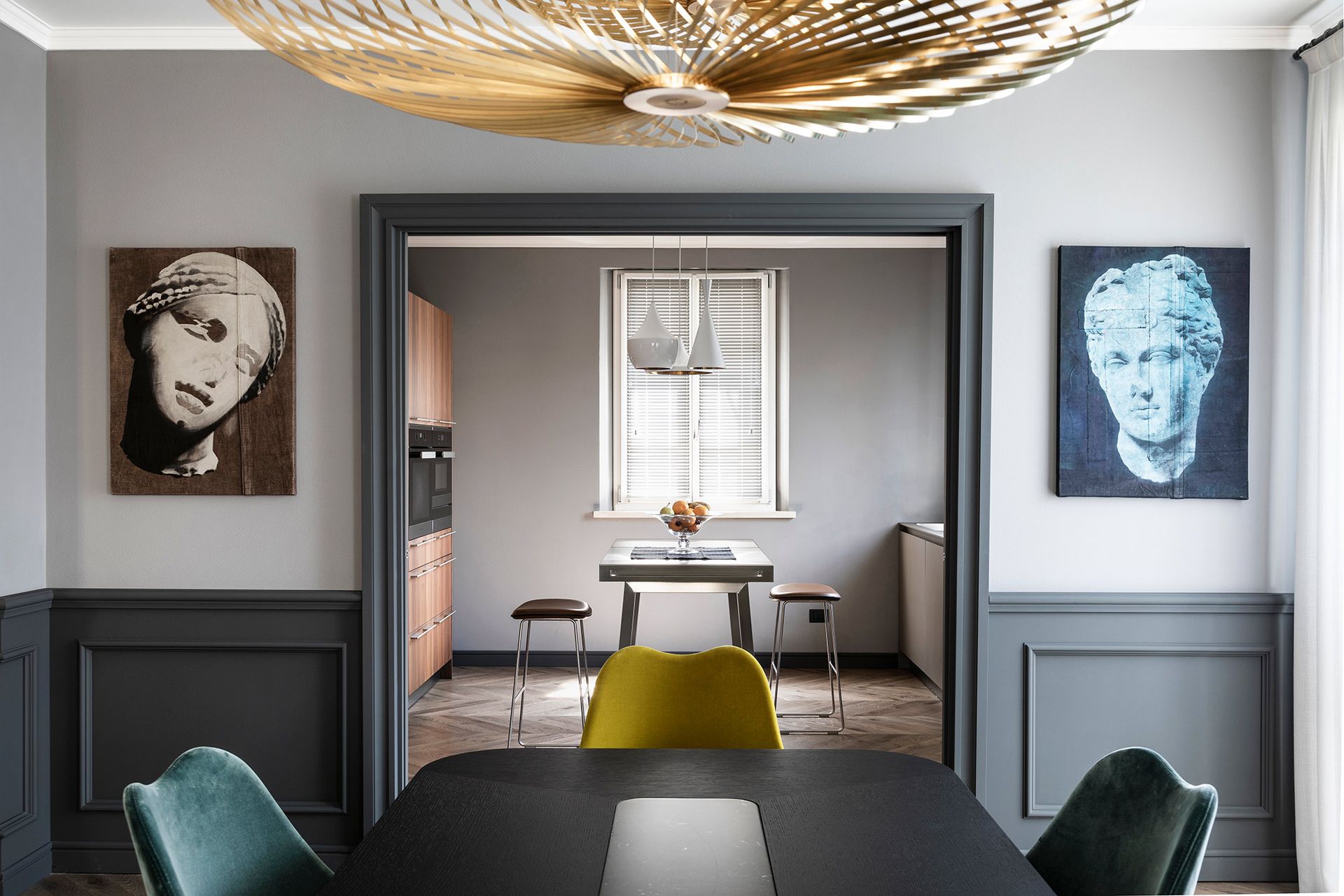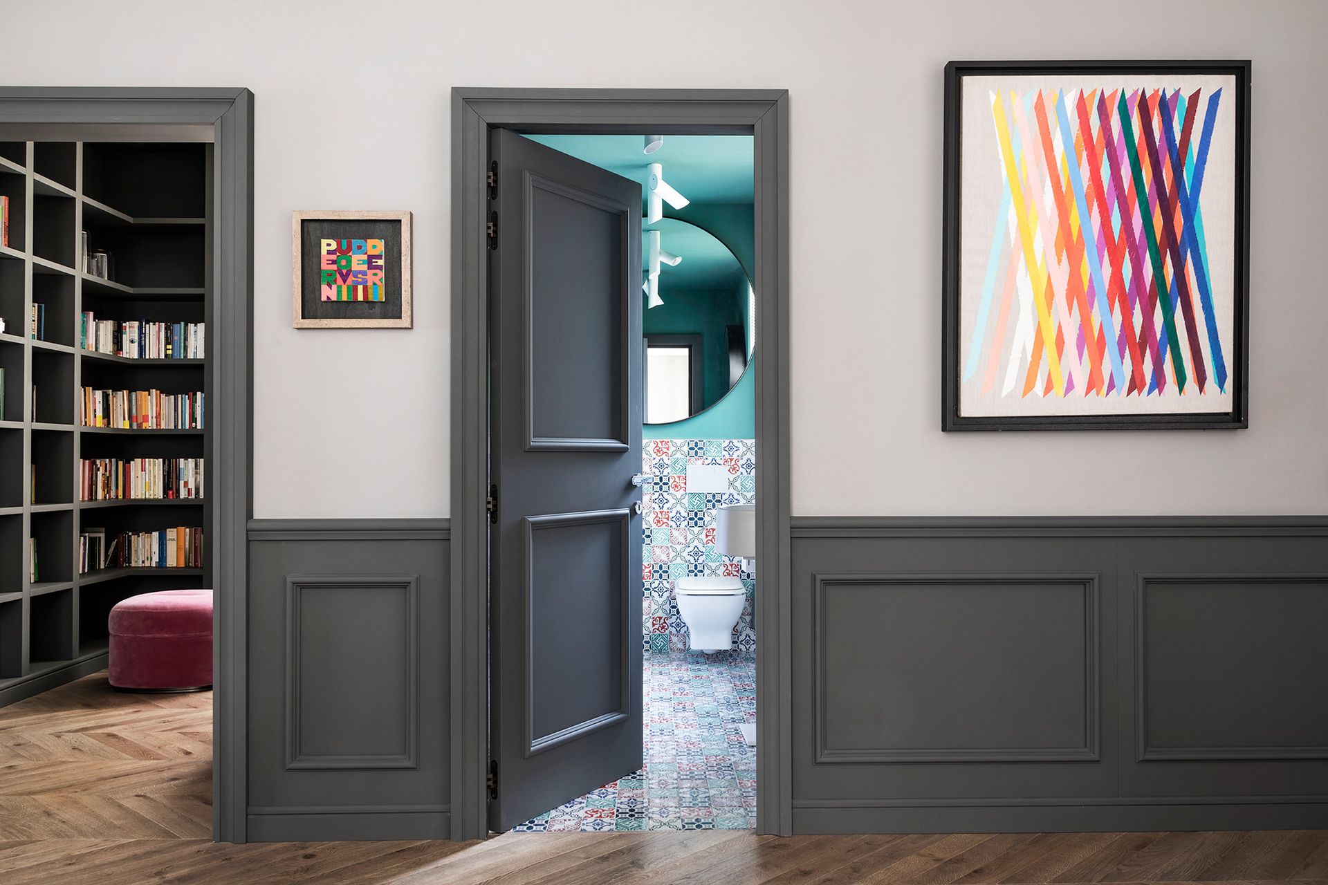 Una casa degli inizi del novecento perfettamente conservata, diventa il pretesto, per reinterpretare il concetto di boiserie, che diventa l'elemento espressivo di tutto il progetto architettonico.Un ipotetico nastro che accogli e conduce all'interno dell'abitazione, da terra a cielo.L'utilizzo di cromie sature, ne stempera la classicità e rimanda ad un utilizzo del colore più contemporaneo. Progetto e Art Direction COLLETTIVO_INVƎRSO Studio di Architettura