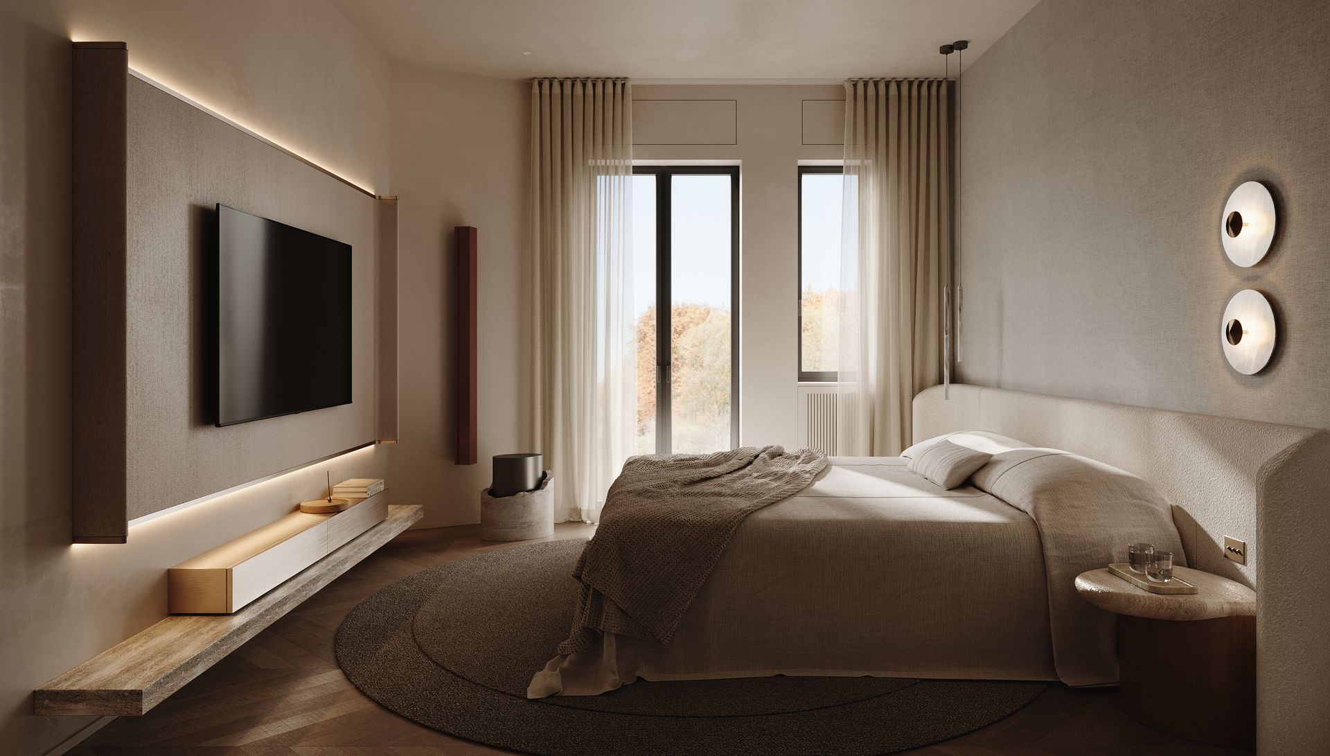 Questa camera da letto è progettata come uno spazio di lusso caldo e accogliente.I materiali scelti — caldi al tatto e visivamente ricchi — donano profondità ed eleganza, mentre le linee essenziali mantengono l’ambiente raffinato e armonioso. La palette neutra, con tonalità calde e naturali, rafforza la sensazione di comfort e benessere.È un lusso discreto, fatto di dettagli curati e finiture di qualità, che avvolgono lo spazio e lo rendono sofisticato ma profondamente accogliente.