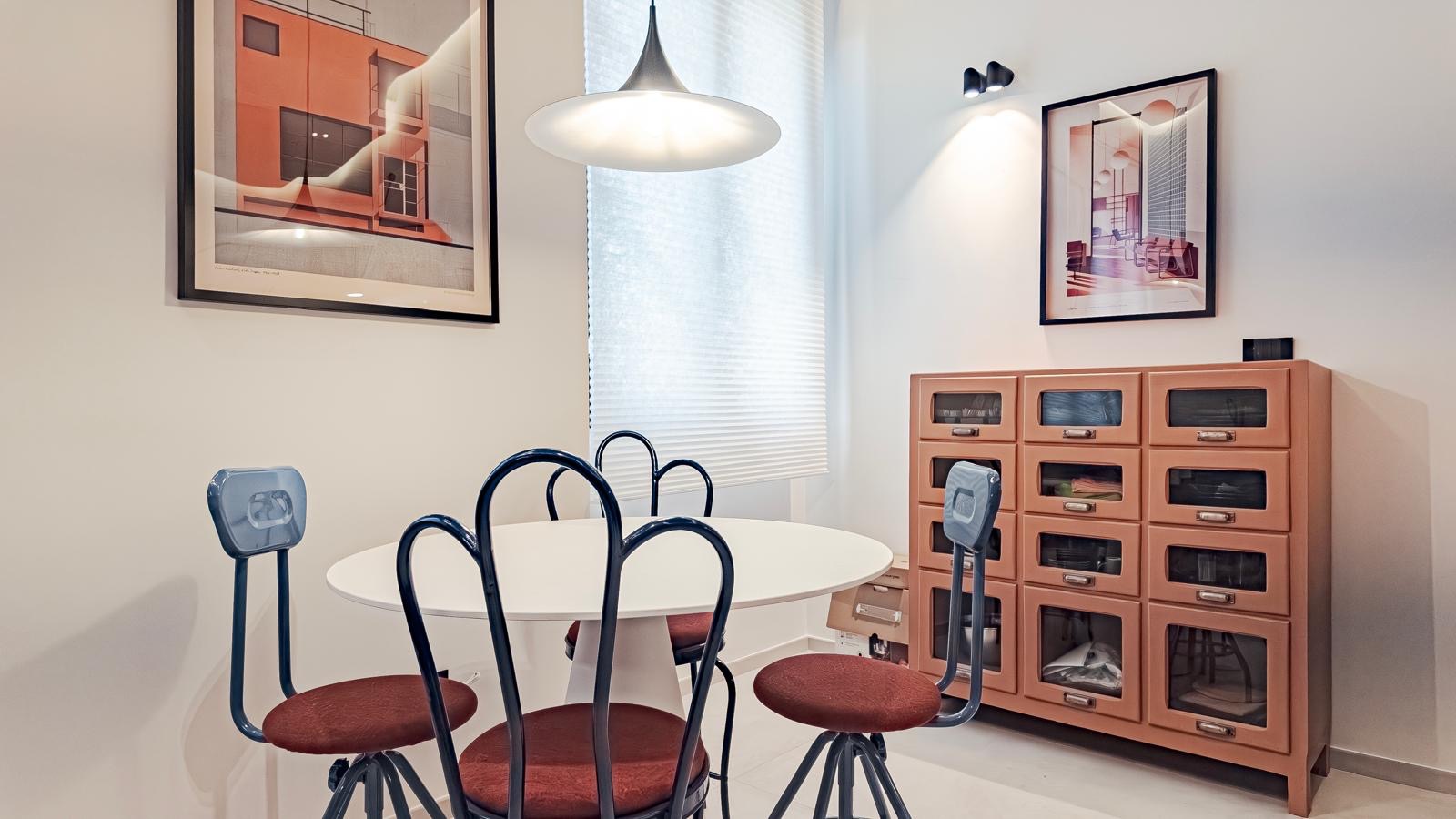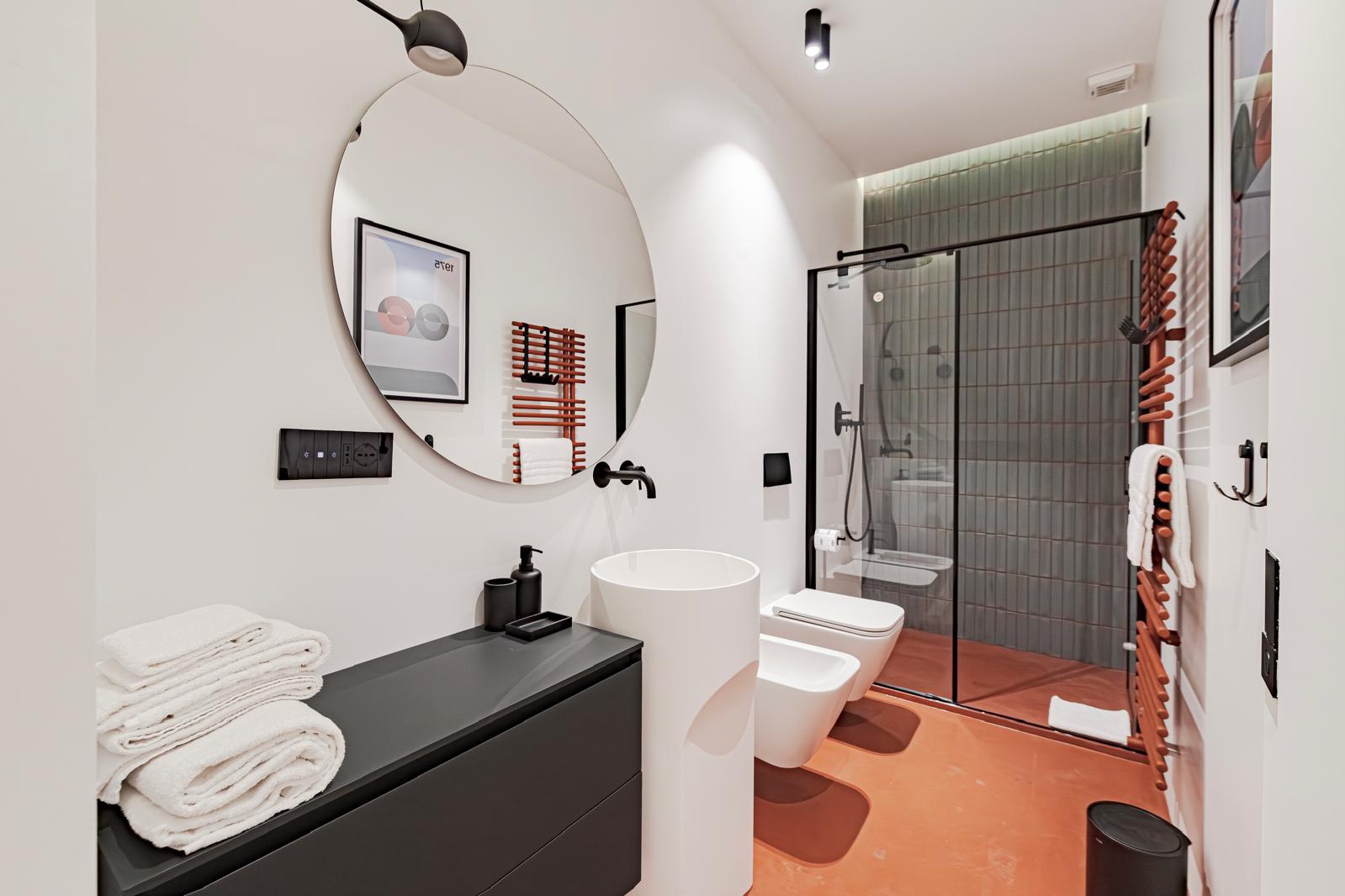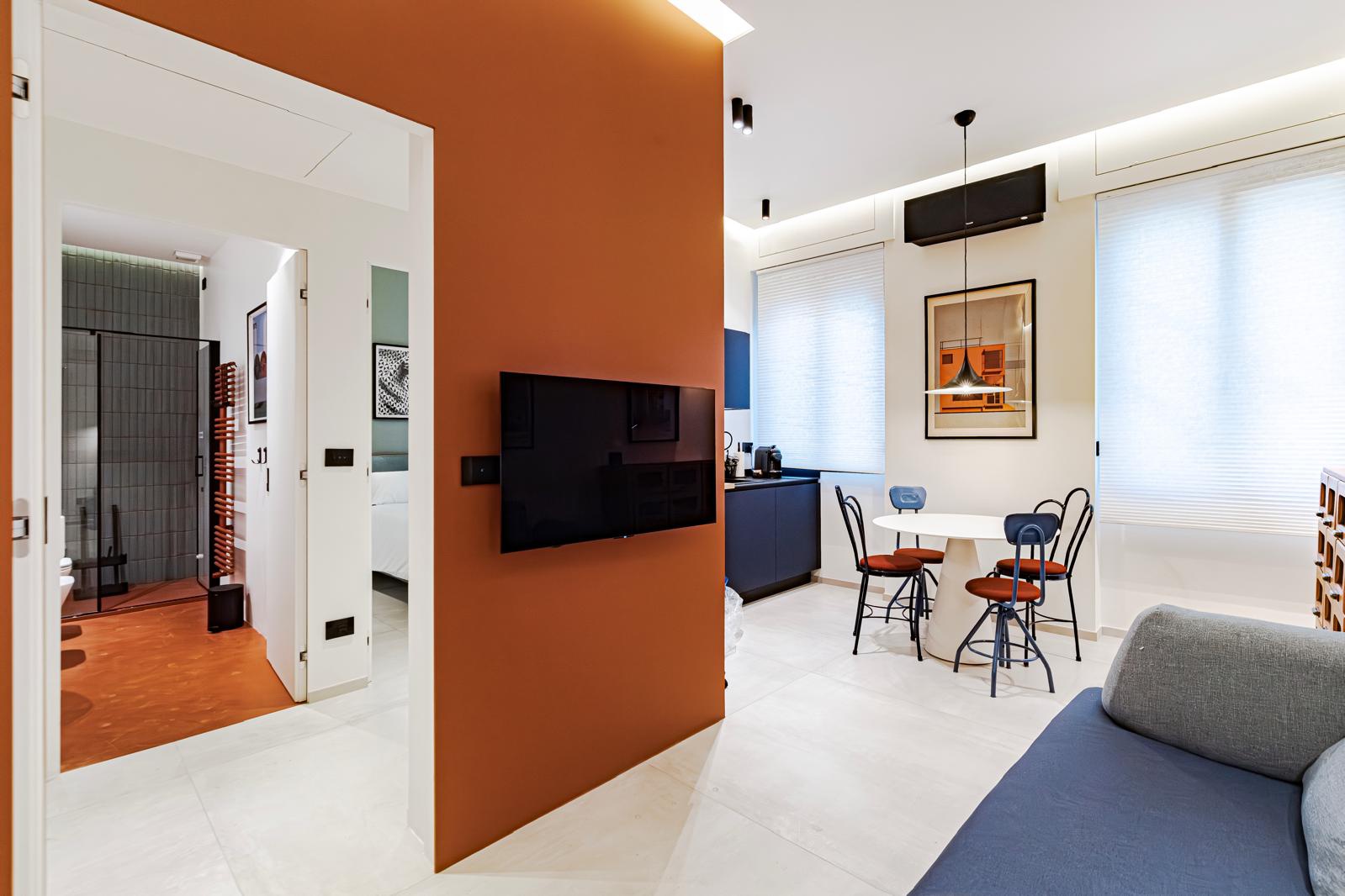 La planimetria iniziale era molto frammentata, e costringeva l’ingresso in un corridoio piccolo e buio. Nel disimpegno infatti, si distribuivano gli accessi a una piccola cucina, un bagno con scalino e un salotto che fungeva anche da camera da letto.Entrando la prima volta, è stata evidente la necessità di “aprire”, per eliminare il senso di chiusura, ma la richiesta contemporaneamente era di mantenere le destinazioni d’uso, il più possibile separate.La colonna delle canne fumarie ha impedito una totalmente libera immaginazione, ma allo stesso tempo ha aiutato a determinare i nuovi spazi.Il progetto ha quindi proposto che l’ingresso fosse posto nella zona giorno con in nicchia una piccola cucina completa di ogni funzione, usufruendo di ben due finestre che donano moltissima luce naturale all’ambiente. E' stato possibile così collocare, oltre a una zona filtro con disimpegno, dotato di lavanderia a scomparsa, una bagno molto grande e una camera con cabina armadio, dietro alla testata del letto.Il nome Ral 8004 deriva dal fatto che questa è stata la tinta scelta per armonizzare i colori blu e verde, su cui il cliente era indeciso. Non volendo rinunciare a nessun colore, sono stati distribuiti secondo una logica: i toni blu/azzurro di cucina e divano sono stati abbinati nella zona giorno al “ruggine” della parete in resina, per ritrovarlo nelle fughe e sulla resina del pavimento in bagno, in questo caso abbinato ai toni del green smoke di piastrelle a listelli e mobili, per poi abbandonarlo quasi completamente nella camera da letto e stabilizzarsi su un verde più tenue.La ricerca degli arredi, dei complementi e di ogni dettaglio spazia dai marchi più conosciuti fino a pezzi vintage, trovati nelle botteghe. Alcuni di questi, sono stati da noi reinterpretati e rivisitati.