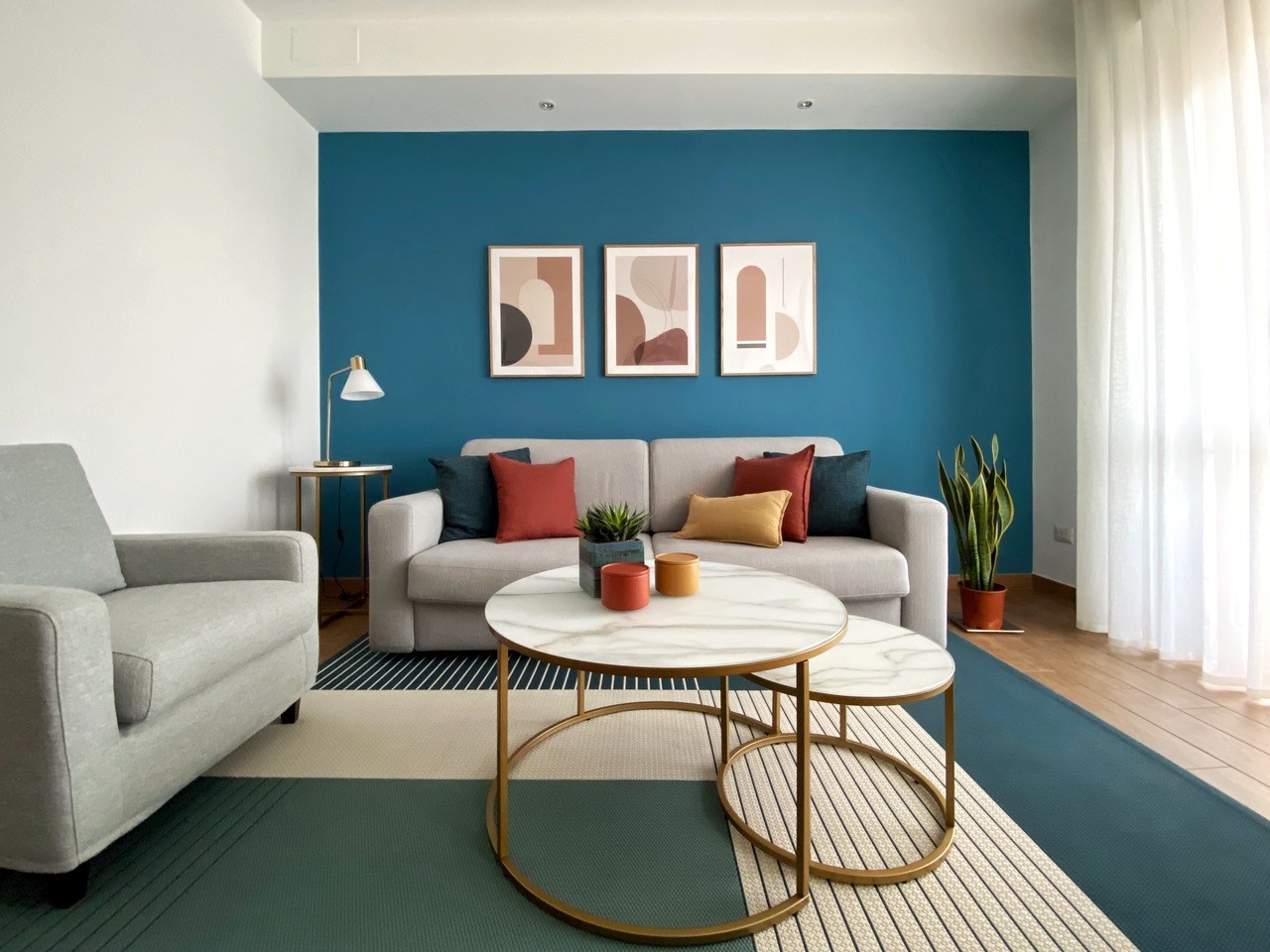 L'intervento di relooking ha interessato la zona living e la camera da letto. La proprietaria, stanca di una casa bianca e asettica in cui non si riconosceva più, sentiva da tempo la necessità di portare una ventata di colore e di rendere lo spazio più fresco e personale. Per la zona living è stato scelto un blu ottanio per le pareti, abbinato a complementi color senape e terracotta. Per la camera da letto è stata selezionata una carta da parati materica color verde salvia. Completano il tutto i tendaggi realizzati su misura.