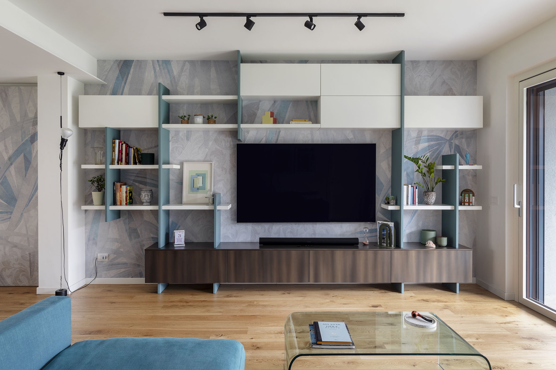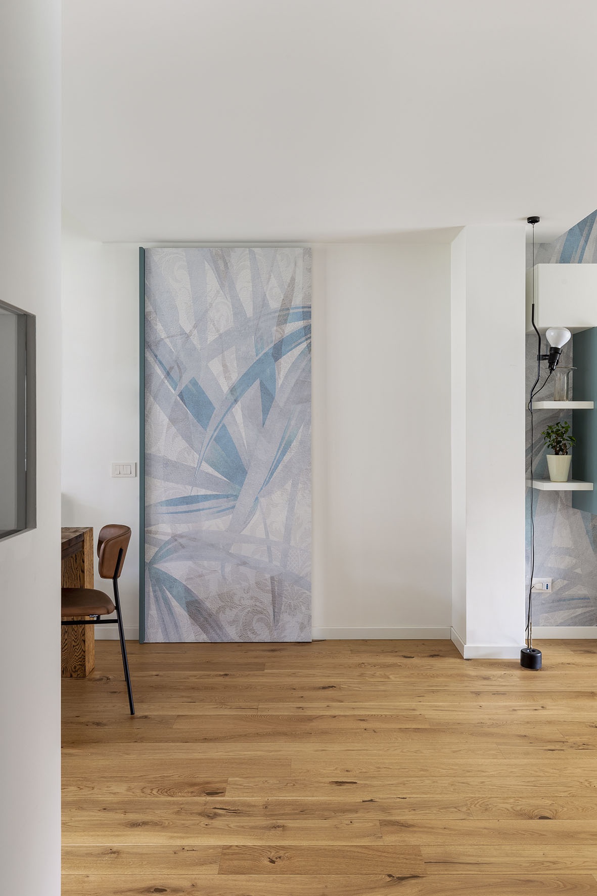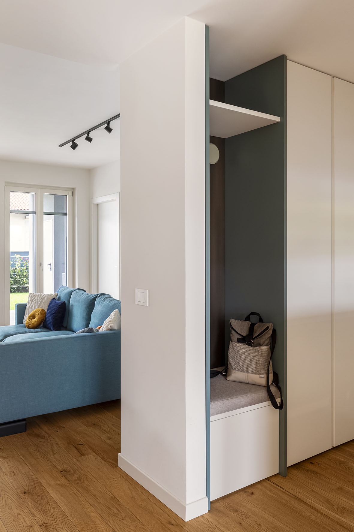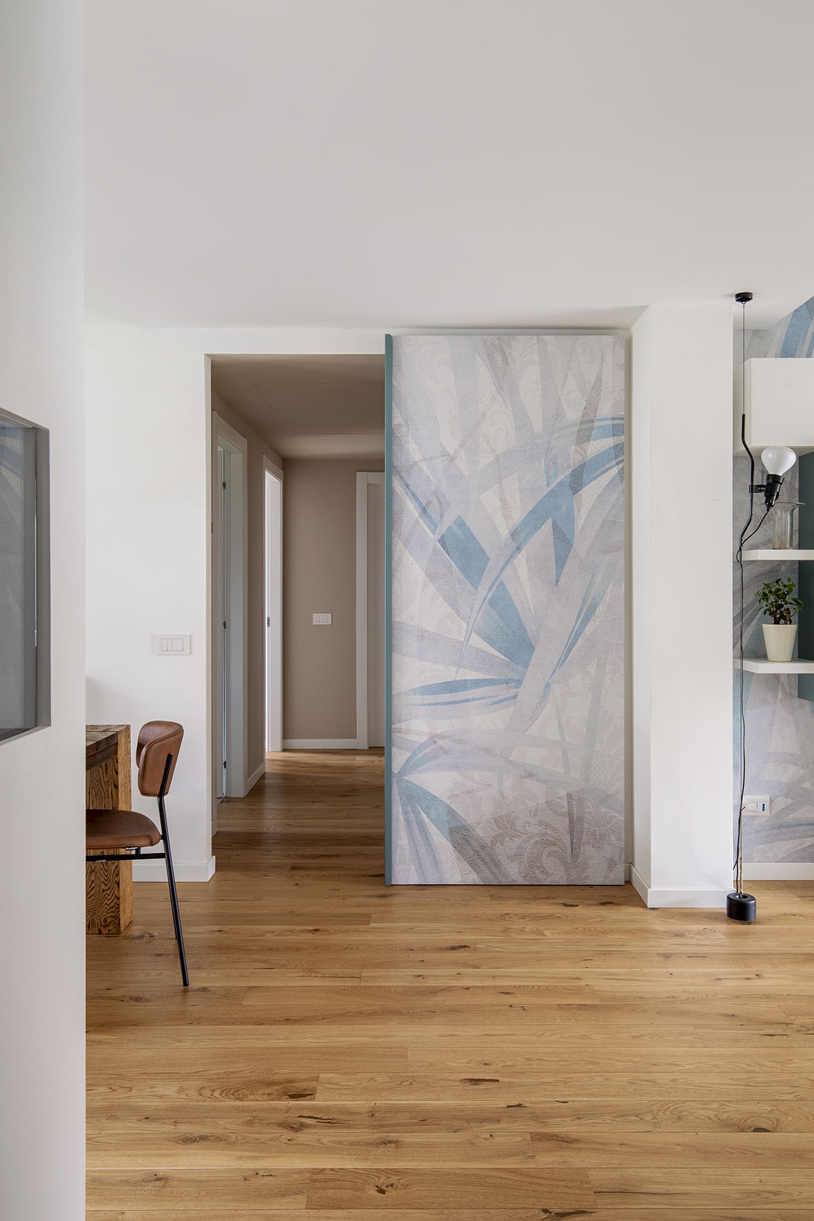 Appartamento in un condominio di nuova costruzione Al piano terra della Residenza al Parco Toti, circondato da un giardino privato, si trova questo appartamento studiato su misura per una famiglia con due bambini piccoli.Un ingresso con guardaroba custom made introduce ad un ampio open space con doppio affaccio: da un lato una cucina disposta a ferro di cavallo, mentre dall’altro il soggiorno collegato ad uno studio.L’intero progetto rispecchia l’amore della proprietaria per i colori e il suo gusto eccentrico si riflette nell’uso di carte da parati sia come rivestimento a parete, sia come elementi d’accento in doccia e sulla porta scorrevole che divide zona giorno e zona notte.I mobili del soggiorno sono stati progettati su misura riprendendo il disegno della cucina, separata ma visibile dall’ingresso grazie ad una piccola vetrata. A pavimento è stato scelto un parquet posato a correre che insieme al colore dà continuità agli ambienti. Ph credits: Marta D'Avenia