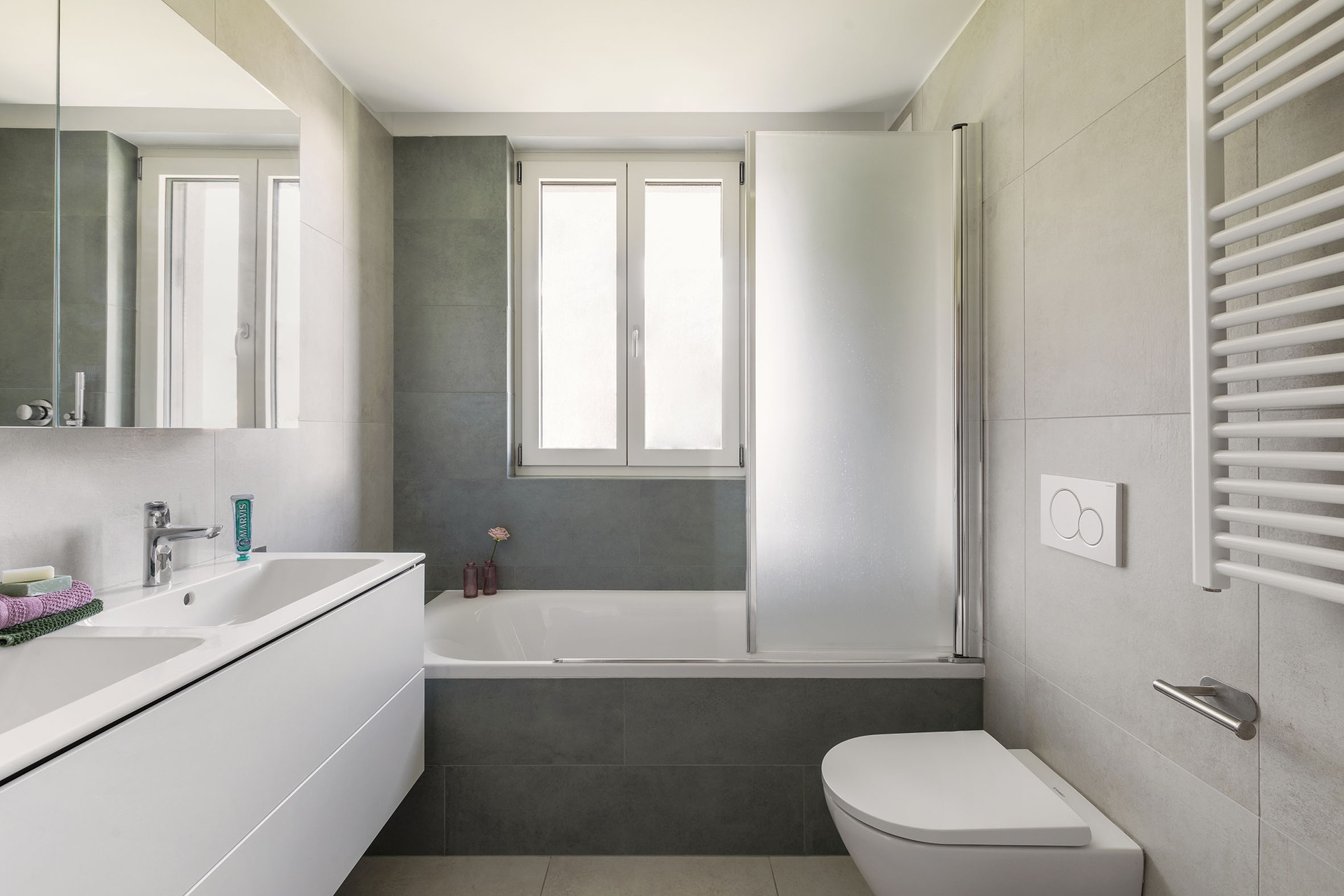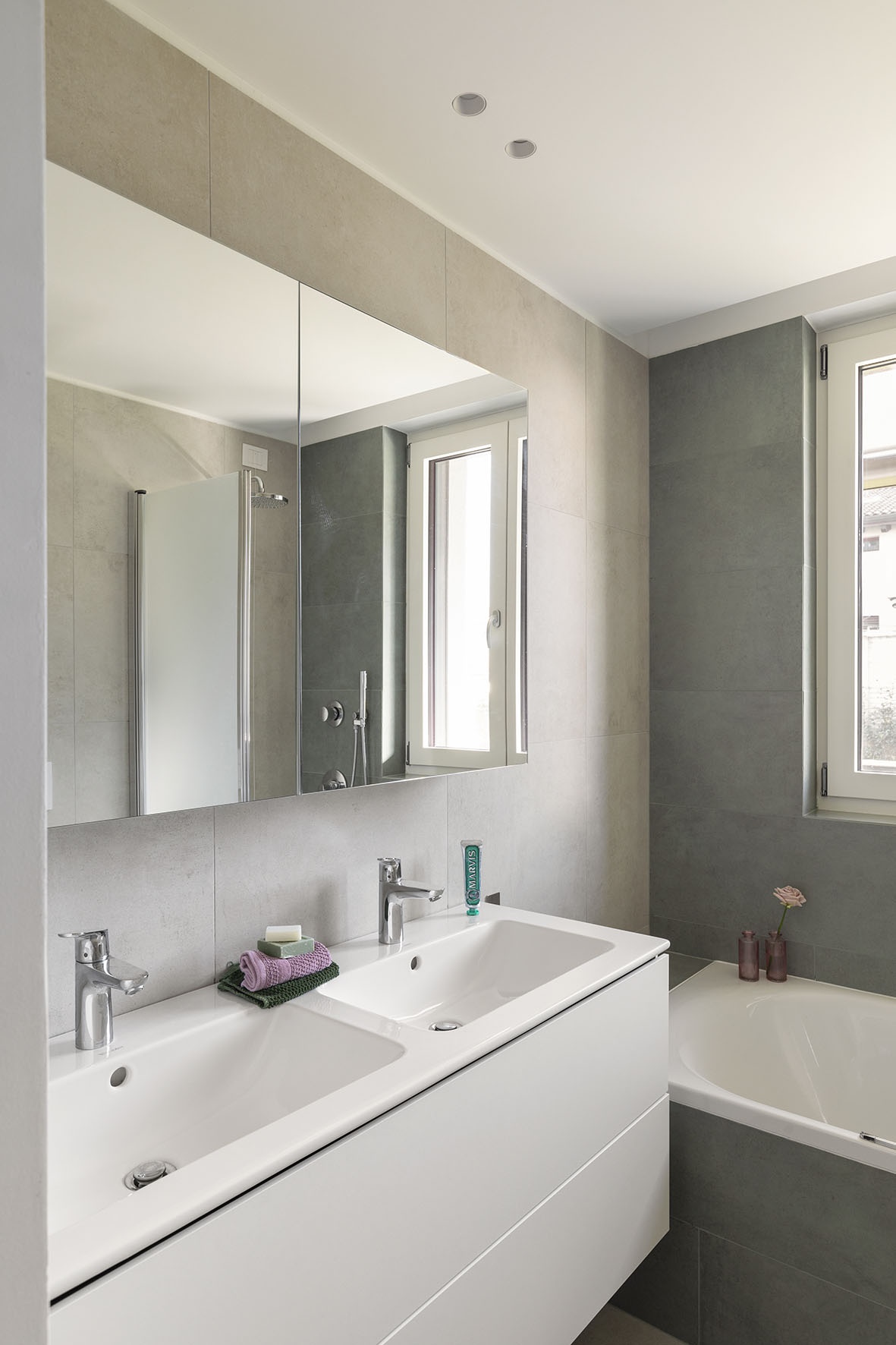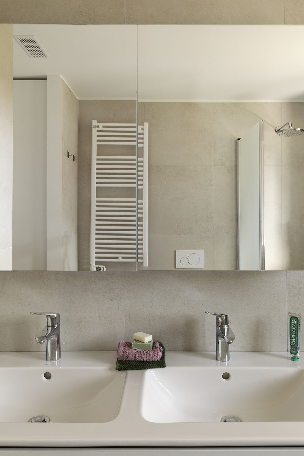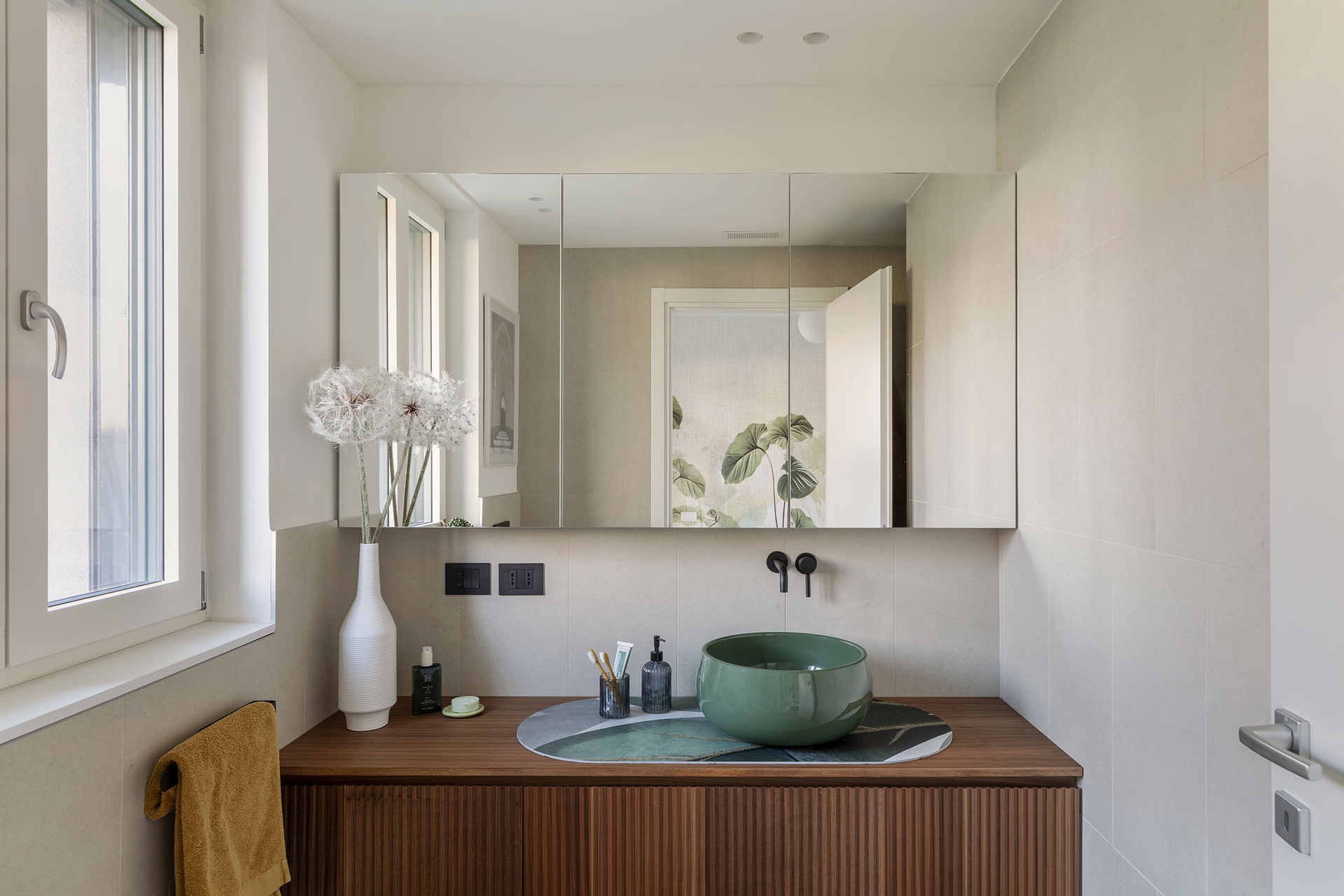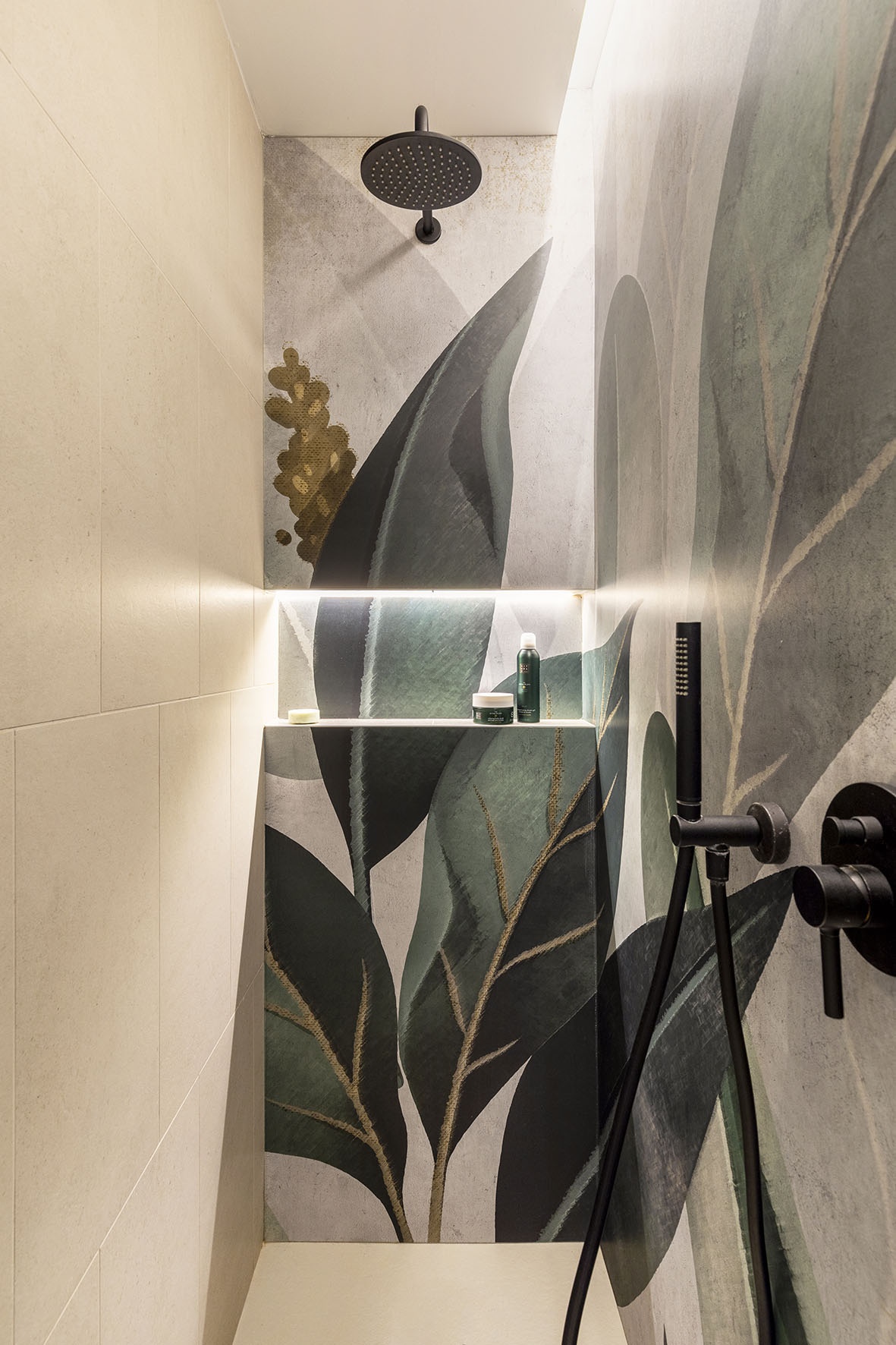 Appartamento in un condominio di nuova costruzione Al piano terra della Residenza al Parco Toti, circondato da un giardino privato, si trova questo appartamento studiato su misura per una famiglia con due bambini piccoli.Un ingresso con guardaroba custom made introduce ad un ampio open space con doppio affaccio: da un lato una cucina disposta a ferro di cavallo, mentre dall’altro il soggiorno collegato ad uno studio.L’intero progetto rispecchia l’amore della proprietaria per i colori e il suo gusto eccentrico si riflette nell’uso di carte da parati sia come rivestimento a parete, sia come elementi d’accento in doccia e sulla porta scorrevole che divide zona giorno e zona notte.I mobili del soggiorno sono stati progettati su misura riprendendo il disegno della cucina, separata ma visibile dall’ingresso grazie ad una piccola vetrata. A pavimento è stato scelto un parquet posato a correre che insieme al colore dà continuità agli ambienti. Ph credits: Marta D'Avenia