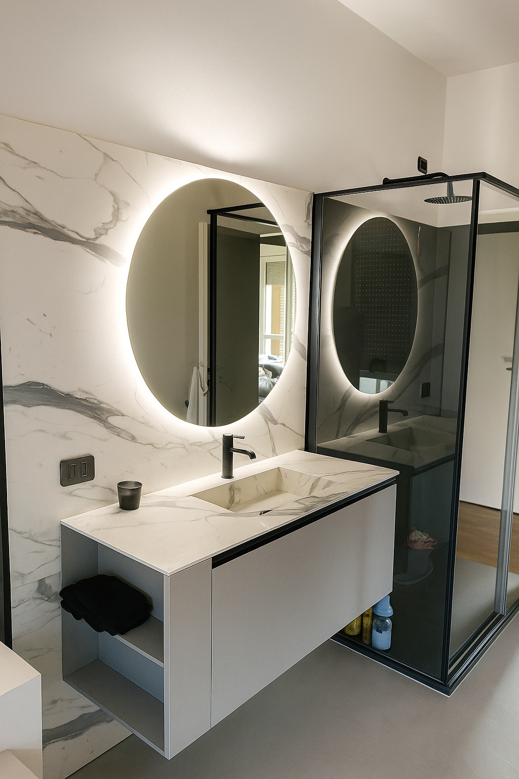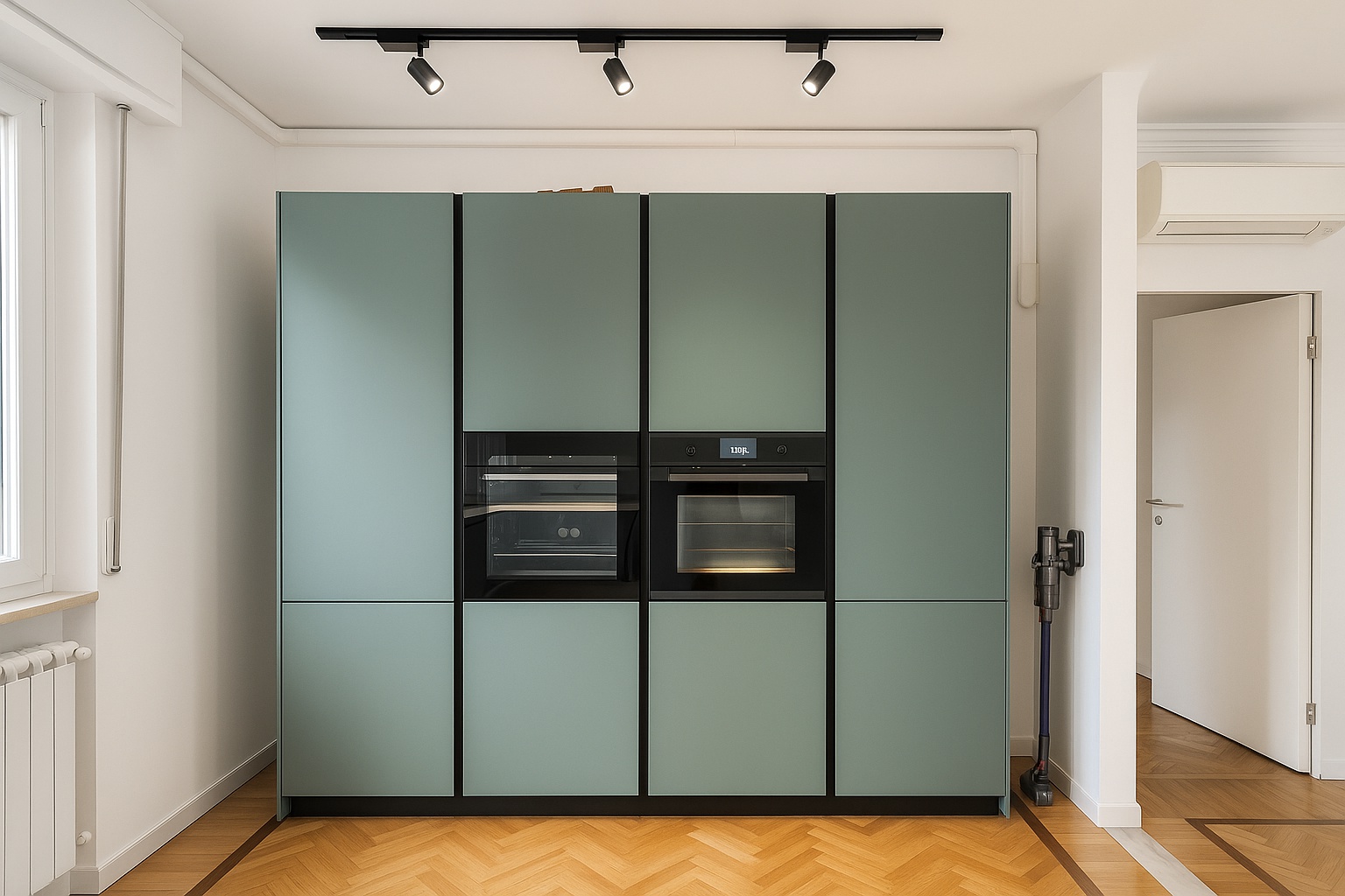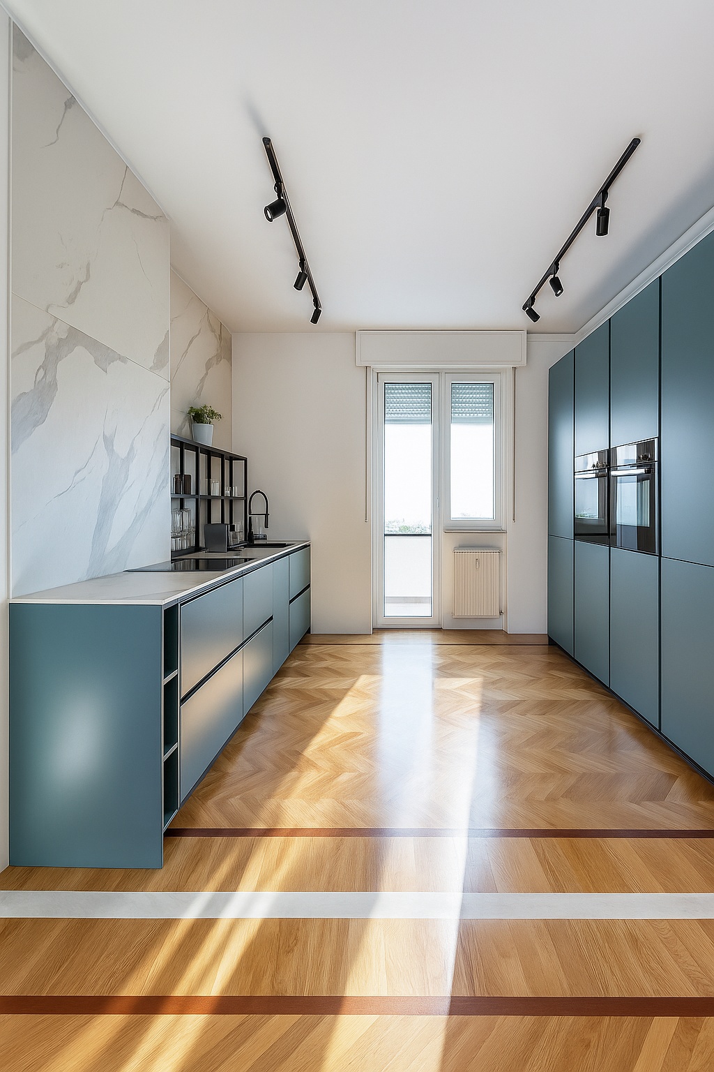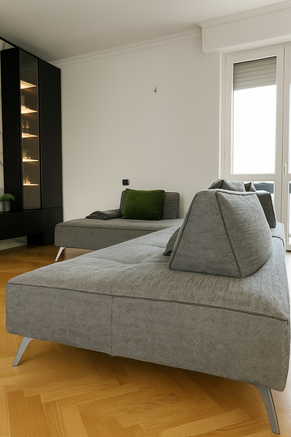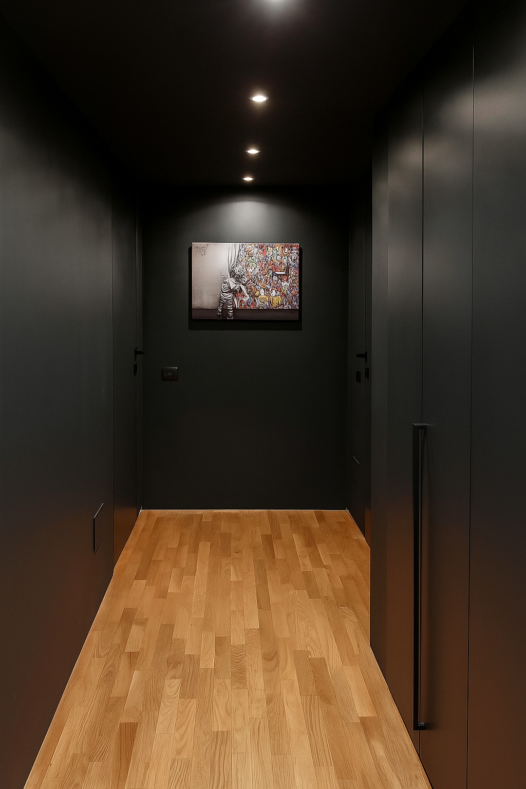 Abbiamo ristrutturato questo attico di 4 locali. Come primo step abbiamo aperto la cucina sulla sala, creando così uno spazio unico, più luminoso e confortevole. I bagni sono stati rifatti applicando il microcemento direttamente sui rivestimenti già esistenti e sostituendo sanitari e mobili. Il lungo corridoio tipico delle case anni 70 è stato impreziosito inserendo delle porte a filo muro e dipingendo le pareti di grigio antracite così da creare uno spazio a sè rispetto al resto della casa.