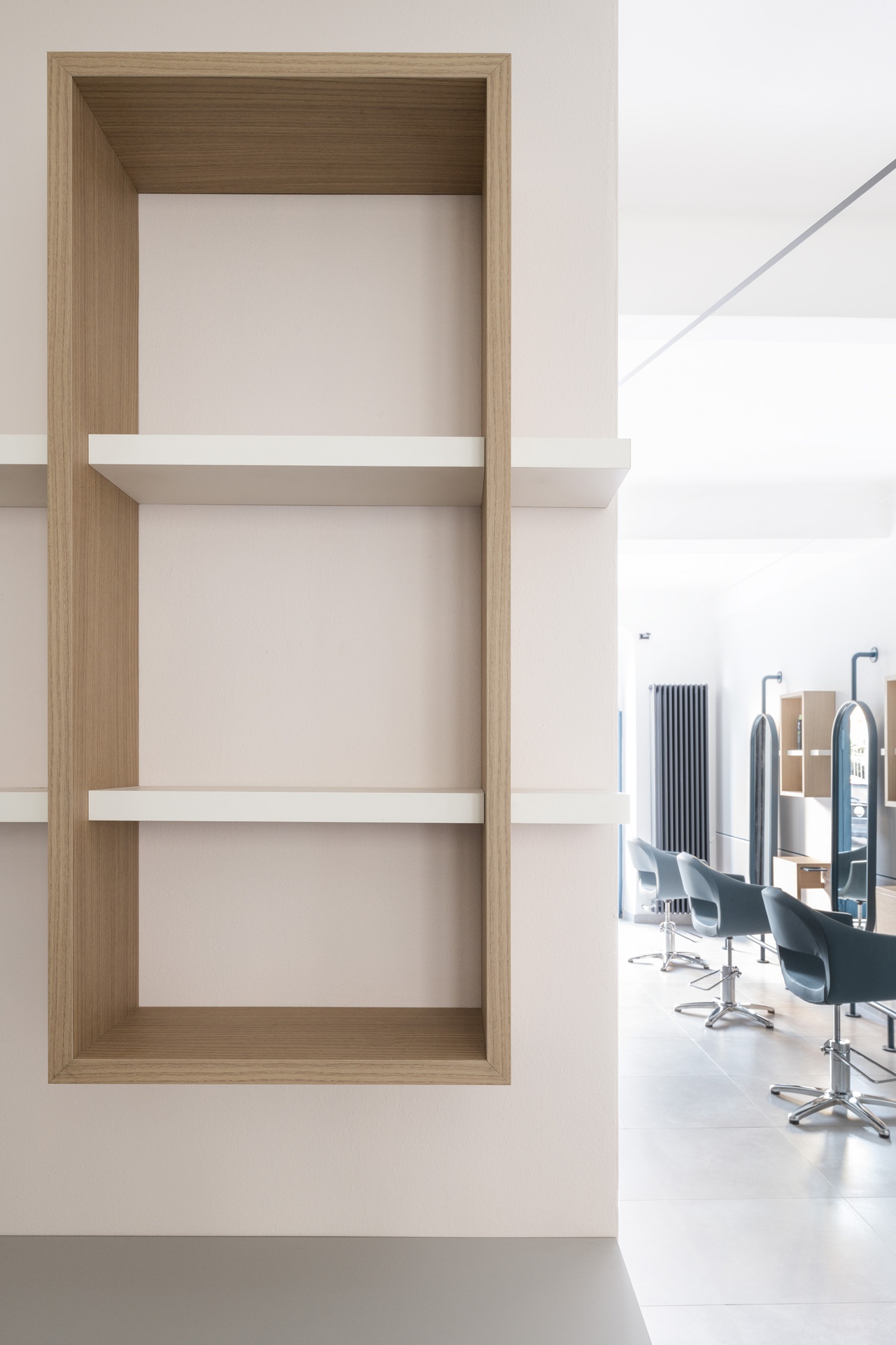 Come un parrucchiere lavora con attenzione ad un nuovo taglio di capelli o bilancia il colore giusto, noi per il salone della nostra Cliente ci siamo concentrati su un equilibrio fatto di dettagli e di nuovi punti di vista.Lo spazio interno si sviluppa in lunghezza, secondo la tipica conformazione longitudinale del centro storico, creando ambienti con funzioni diverse ma tutti legati da un uso studiato dell’illuminazione a cura del marchio Davide Groppi.La luce naturale entra dalla grande vetrata d’accesso e si trasforma in luce artificiale attraverso due lampade rettilinee che si intrecciano disegnando lo spazio nella sua profondità.Come in un gioco di toni e di riflessi la palette di colori ricade su una scelta alternata di colori neutri e toni più intensi, da cui traspare il carattere discreto ma deciso della titolare.Il cuore dello spazio progettato è il volume centrale della reception in rovere naturale, che diventa punto di separazione delle due aree operative del salone, una più aperta verso l’esterno e una più privata sul retro.Il quadro con testa di fiori appeso alla parete di fondo è il nuovo centro prospettico. Lo sguardo arriva in quel punto lasciandosi condurre dalle linee luminose a soffitto che direzionano il nuovo taglio visivo nello spazio.CreditsFoto: Federico Villa StudioIlluminazione: Davide GroppiArredo: Essence FalegnameriaVetreria: Barani