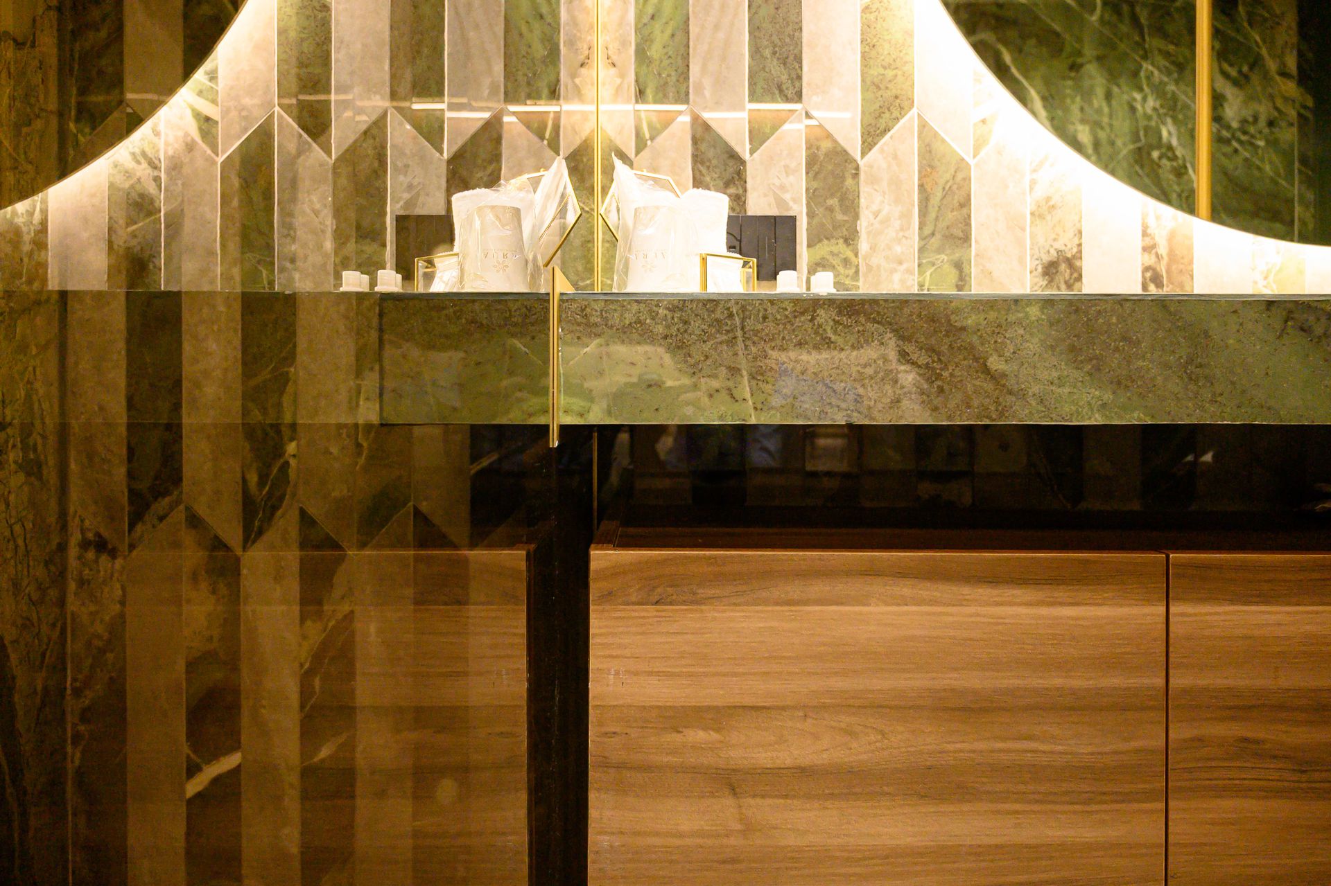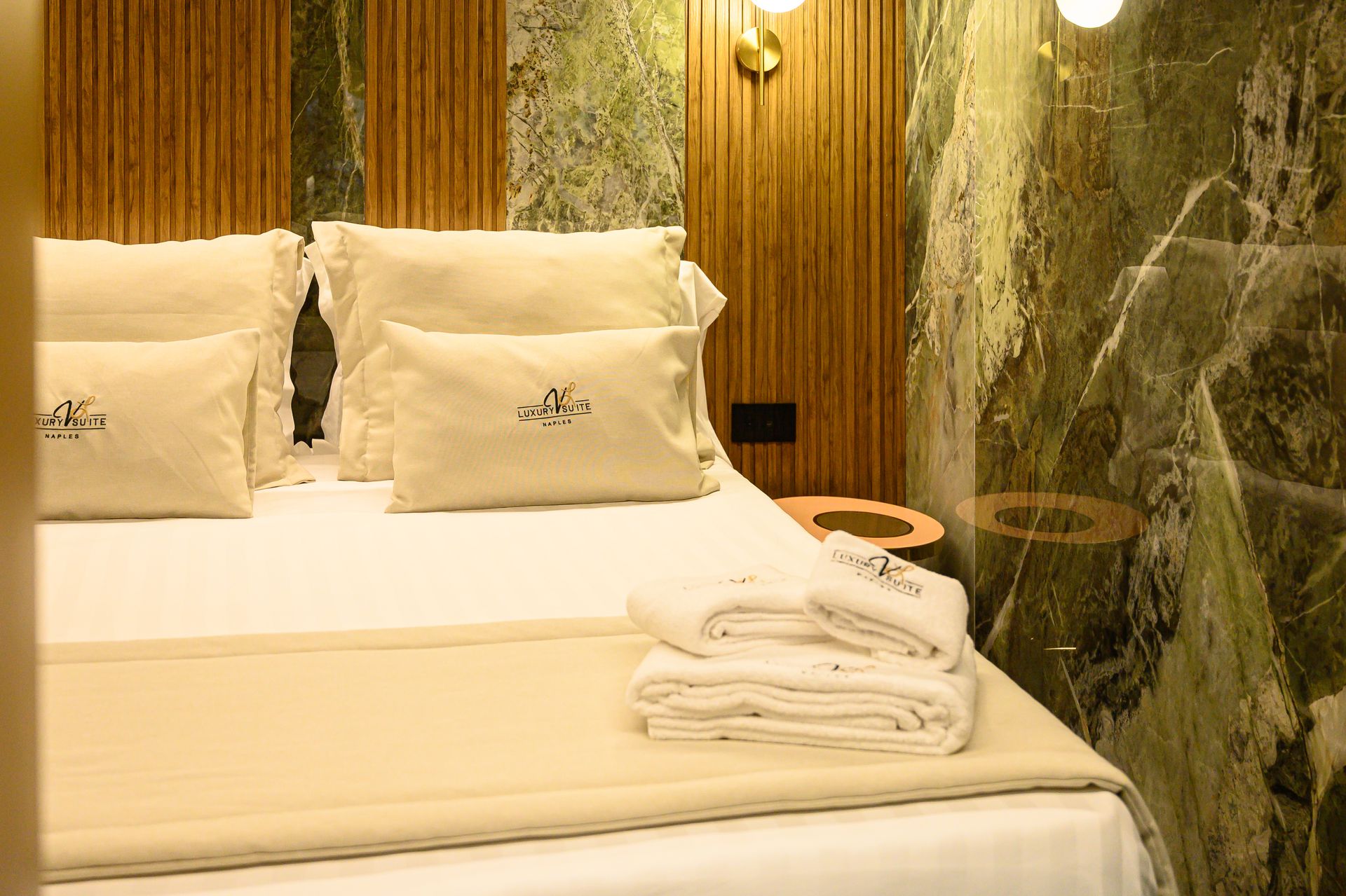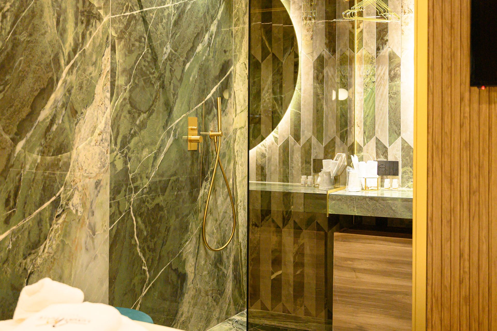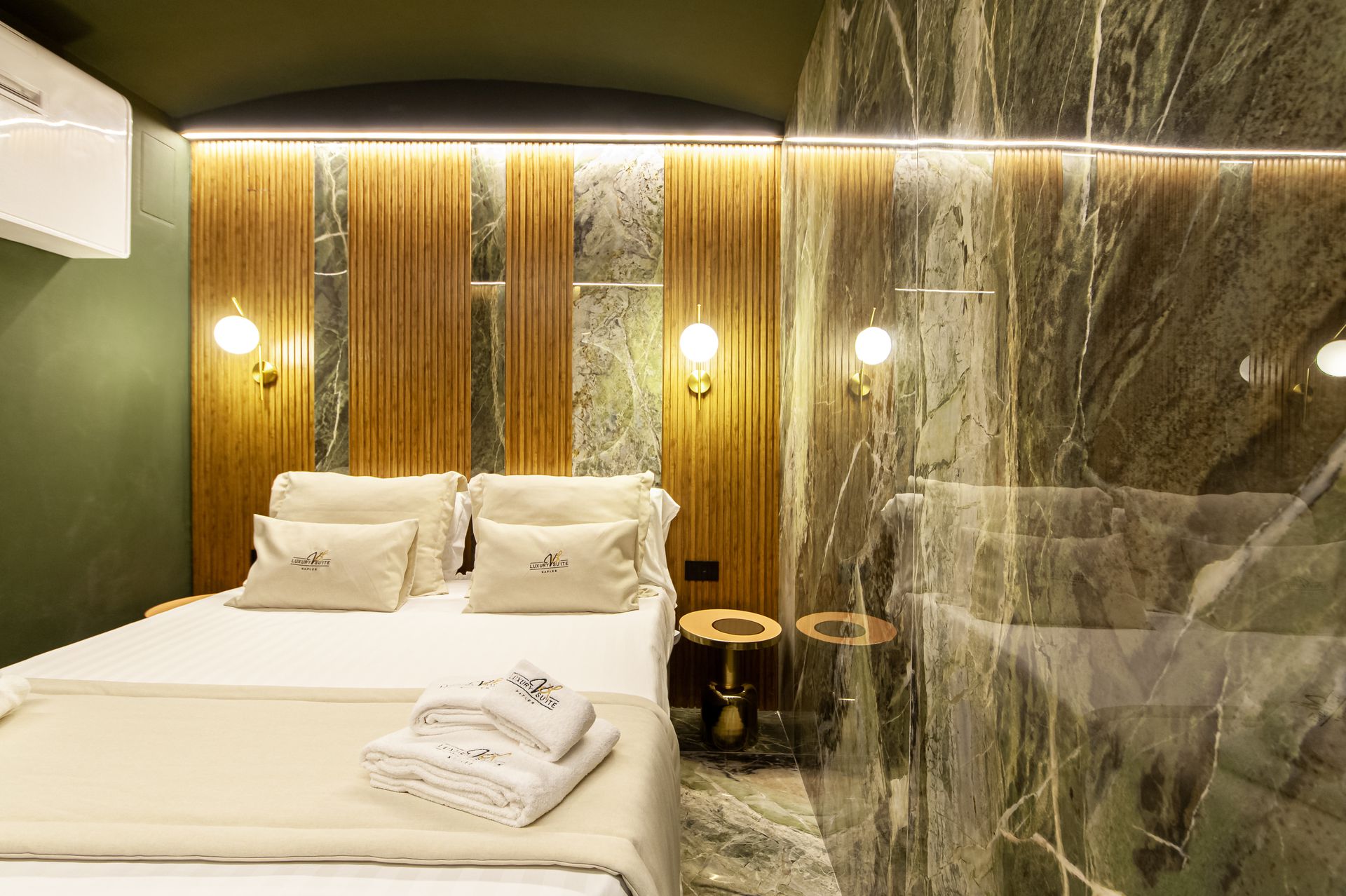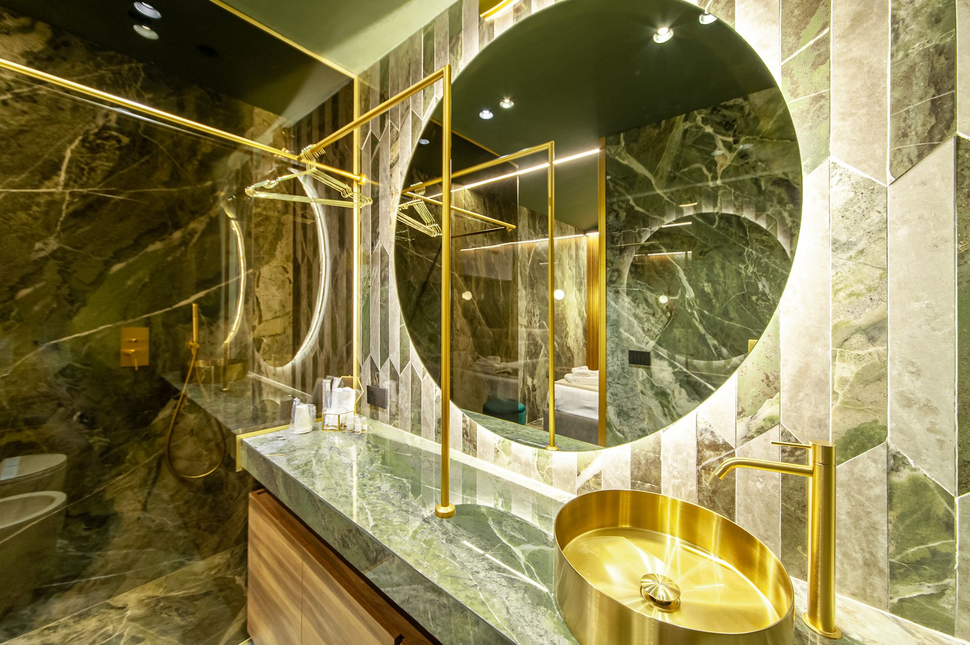 Un progetto che interpreta il concetto di ospitalità di lusso attraverso una forte identità materica e un linguaggio contemporaneo sofisticato. Suite Verde Imperiale nasce dall’incontro tra marmo dalle venature scenografiche, ottone satinato e legno naturale, in un equilibrio calibrato tra eleganza e carattere.Il marmo verde, protagonista assoluto, avvolge pavimenti e pareti creando continuità visiva e profondità prospettica. Le sue venature dinamiche dialogano con inserti verticali e lavorazioni geometriche che trasformano le superfici in quinte architettoniche decorative. Il bagno, concepito come ambiente esperienziale, integra lavabo scultoreo in ottone, specchio retroilluminato circolare e dettagli dorati che enfatizzano la percezione di esclusività.La zona notte è pensata come un rifugio intimo e sofisticato: il fondale in doghe verticali in legno scandisce il ritmo visivo, mentre l’illuminazione lineare integrata e le applique sferiche generano una luce calda e avvolgente. La trasparenza della parete vetrata crea una continuità tra camera e sala bagno, trasformando l’intero spazio in un’unica suite scenografica dal forte impatto emozionale.Un progetto che coniuga design, materia e luce per offrire un’esperienza immersiva, dove ogni dettaglio contribuisce a definire un’atmosfera contemporanea, ricercata e altamente distintiva.