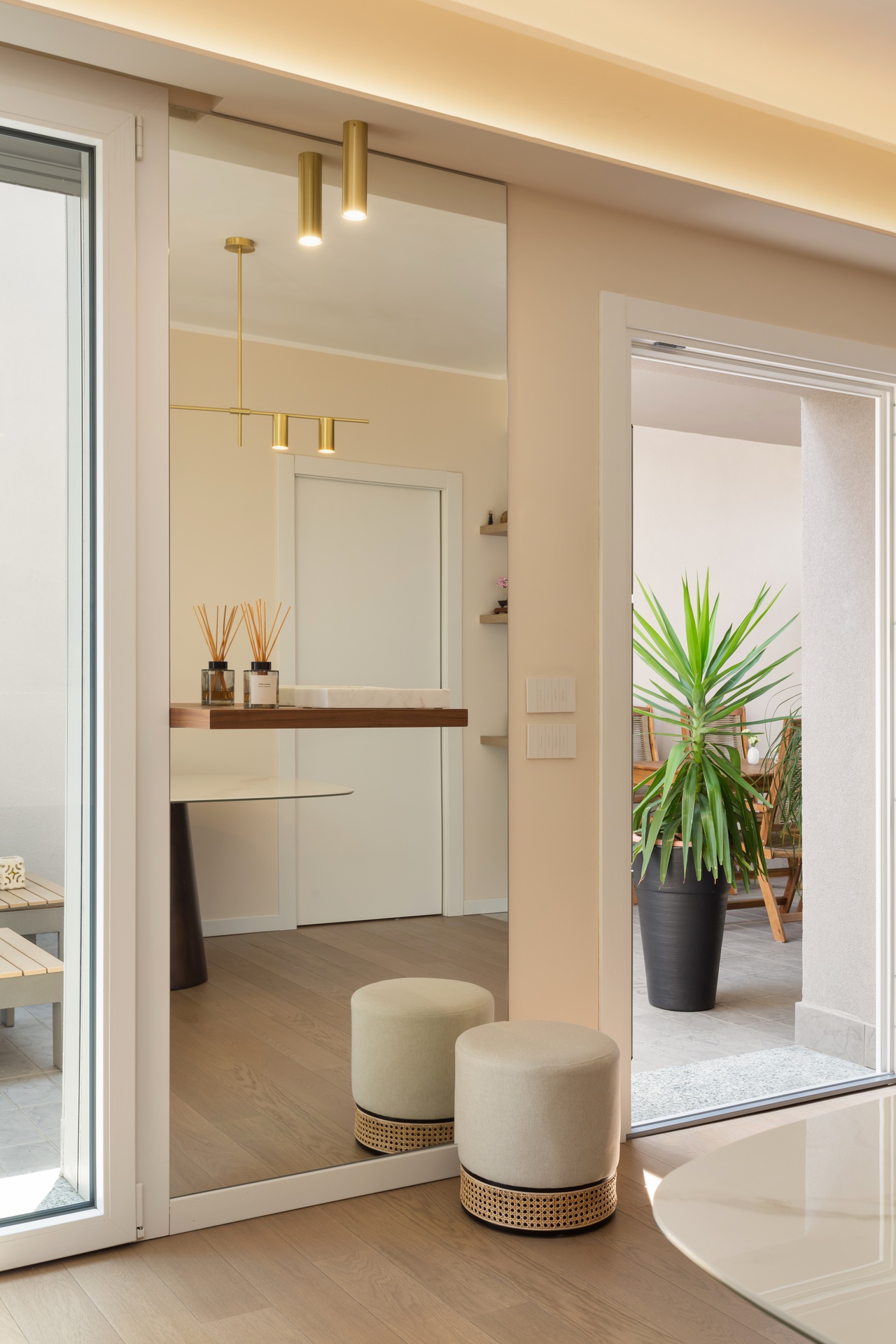 Il progetto Trasimeno 64 riguarda la progettazione dell'intera zona living di un duplex di recente costruzione, i cui proprietari avevano esigenze ben precise: avere uno spazio accogliente, luminoso e moderno. Ecco quindi che è nato questo progetto caratterizzato da uno stile moderno e un tocco di eleganza. L'utilizzo di materiali pregiati come il legno, i tessuti e il gres porcellanato incorniciano il disegno d'interior mentre lo studio illuminotecnico regala giochi di luce e giochi di ombre.