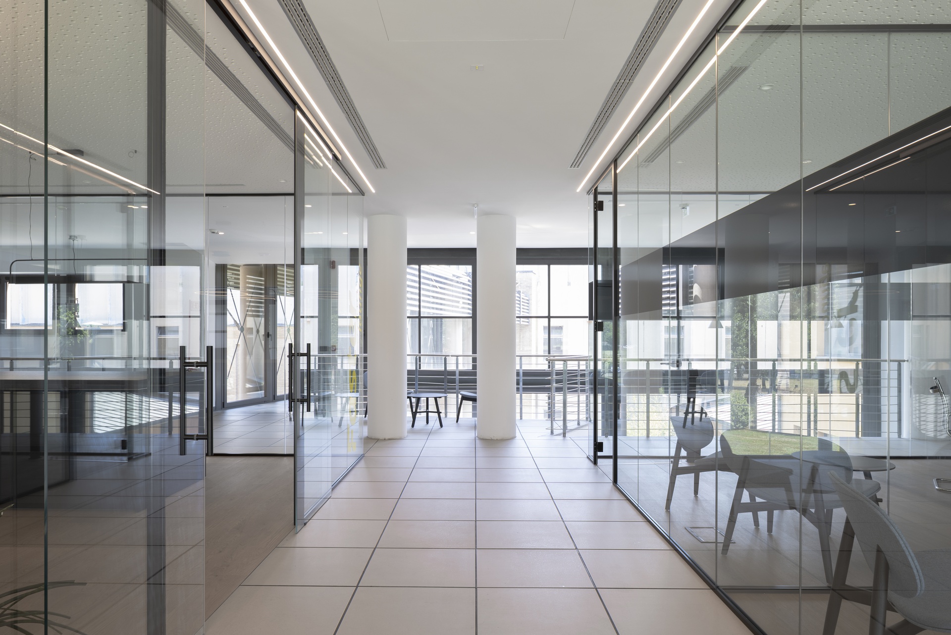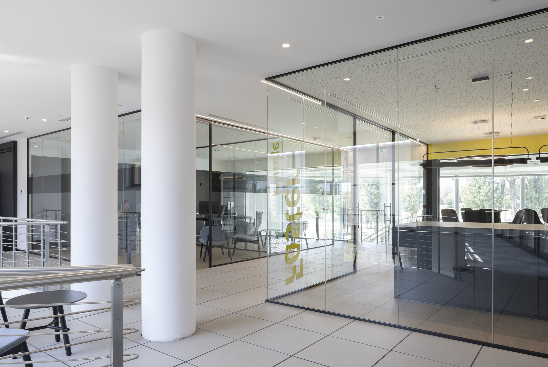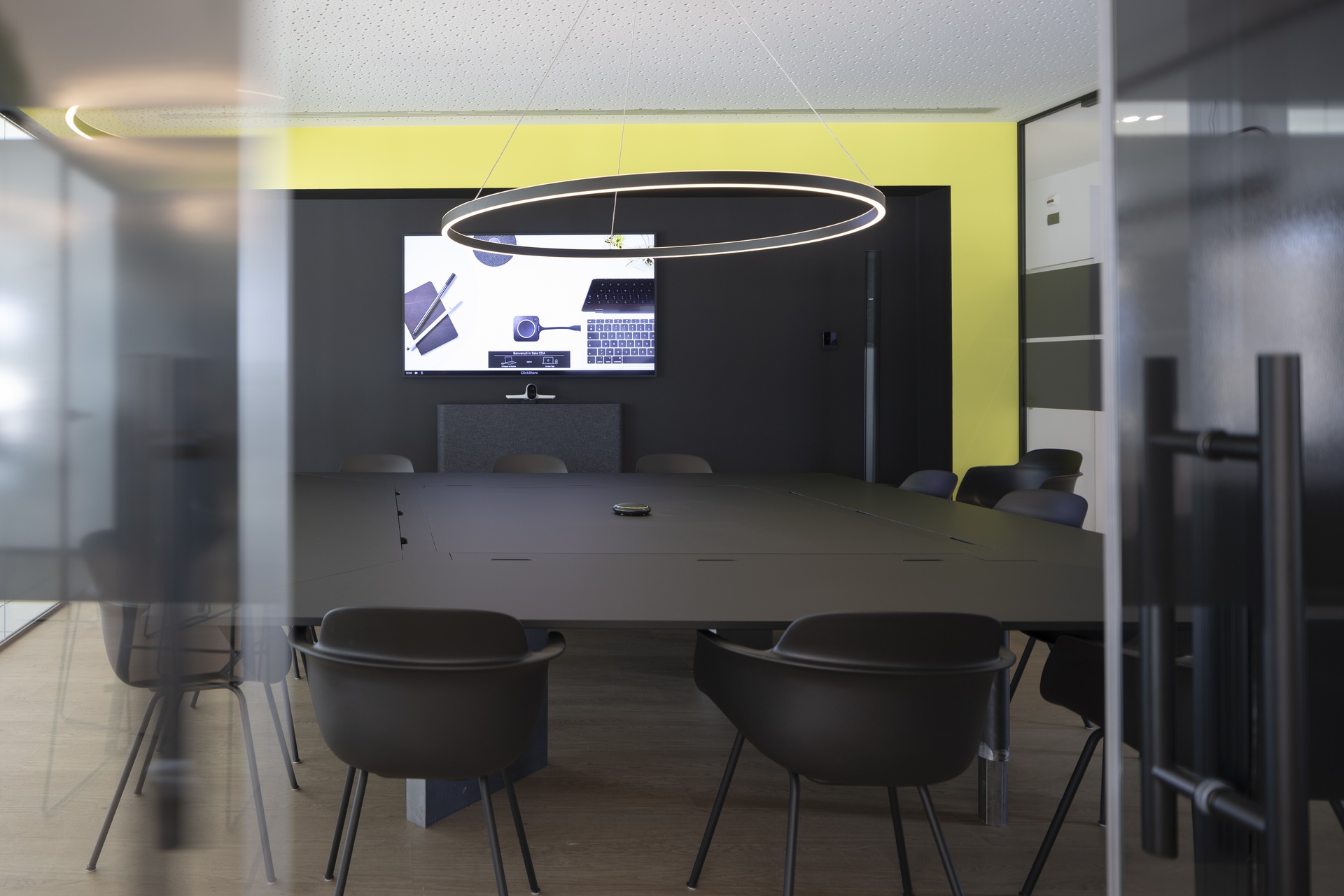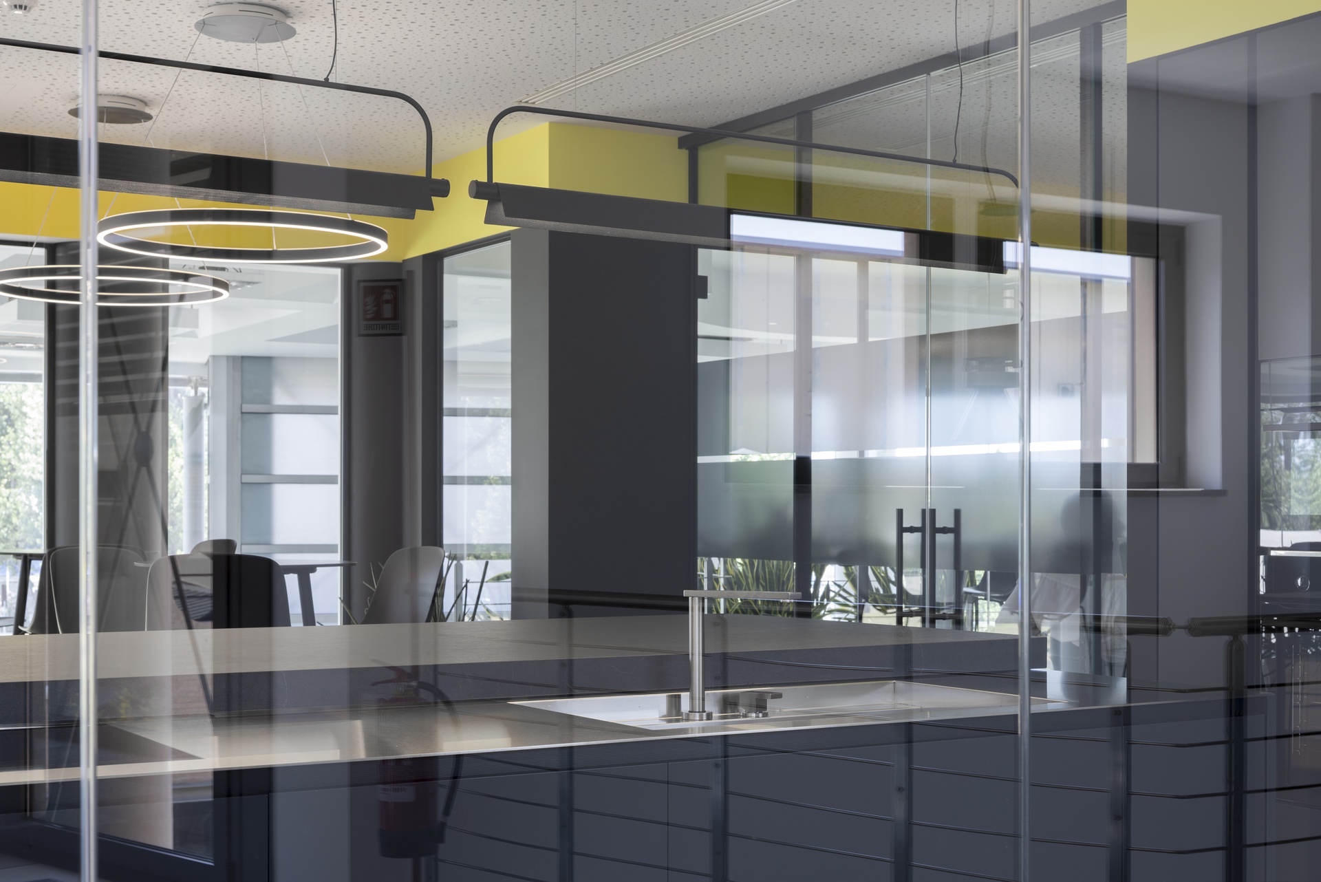 L’intervento riguarda la riconfigurazione degli uffici direzionali dell’azienda Faster Group a Rivolta d’Adda e la loro trasformazione in una zona lounge con sala riunioni e uffici, dove poter accogliere clienti o partner commerciali, svolgere all’occasione eventi aziendali e di show-cooking . L’area è al primo piano dell’edificio, sopra la zona d’ingresso e messa in diretto collegamento con questa attraverso un doppio volume e una scala aperta che dalla reception porta alla Faster lounge.Il progetto si è sviluppato fin da subito cercando di minimizzare l’impatto della ristrutturazione sull’esistente, sia attraverso il mantenimento dei percorsi longitudinali e trasversali, sia nel recupero dei materiali esistenti, come la pavimentazione galleggiante degli spazi comuni. Questo ha portato a individuare due aree, separate dal corridoio di acceso centrale, da destinare a uffici accoglienza e alla zona lounge con sala riunioni.Mentre i due uffici presentano toni neutri e un arredo minimale, la zona lounge è volumetricamente più articolata e cromaticamente caratterizzata (ved. descrizione “Faster lounge”). Per garantire una permeabilità visiva dell’area si è deciso di nascondere tutti gli impianti (idrici, elettrici, di riscaldamento e raffrescamento) nel pavimento galleggiante e nel controsoffitto. La differenza dei materiali di finitura va a rimarcare la differenza delle funzioni: negli uffici e nella zona lounge, inoltre, la pavimentazione con effetto legno e il controsoffitto forato contribuiscono a garantire il comfort acustico necessario all’uso di questi spazi.Nella zona lounge, il piano della penisola della cucina può scorrere per trasformarsi in una zona lavoro con fornelli e lavello; chiusa, invece, rimane un elemento monolitico in mezzo all’ambiente. Questa insieme alle colonne laterali (complete con frigorifero, forno, microonde e macchina del caffè) permette l’utilizzo dell’area per eventi aziendali e di show-cooking. I tavoli alti e gli sgabelli sul lato opposto, si prestano all’uso quotidiano dello spazio per mangiare, lavorare o per piccole riunioni informali.La sala riunioni è in diretto collegamento con la lounge per permettere l’utilizzo delle due aree in contemporanea. E’ dotata di un terrazzo interno che affaccia sulla zona d’ingresso e di un gioiello realizzato su misura: un tavolo riunioni progettato da noi con il bordo a sfumare, completamente cablato internamente e rivestito in fenix. La setosità del materiale della parte superiore, contrasta con le gambe sottostanti in acciaio trattato, con cui nel disegno abbiamo voluto richiamare la vocazione industriale dell’azienda.