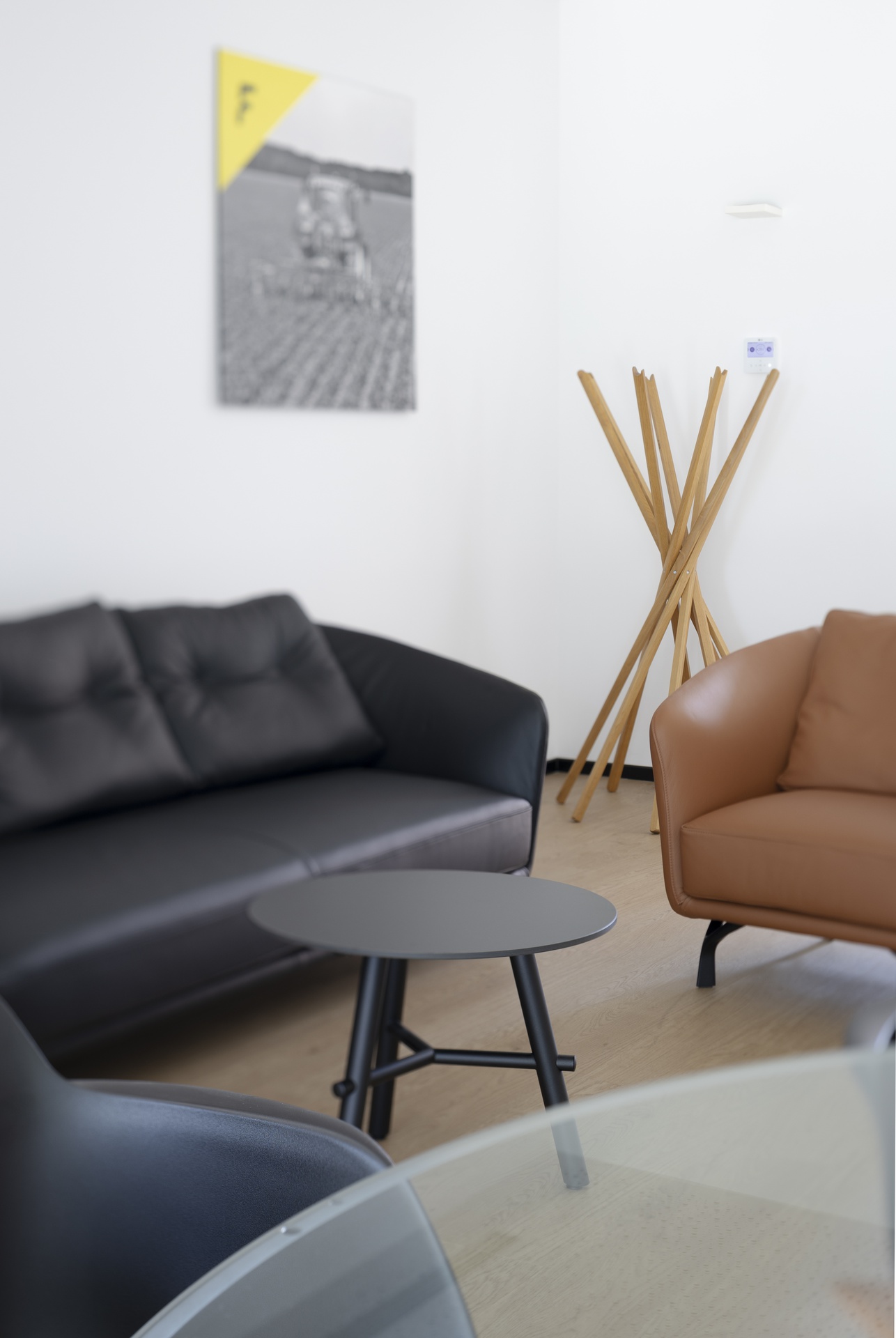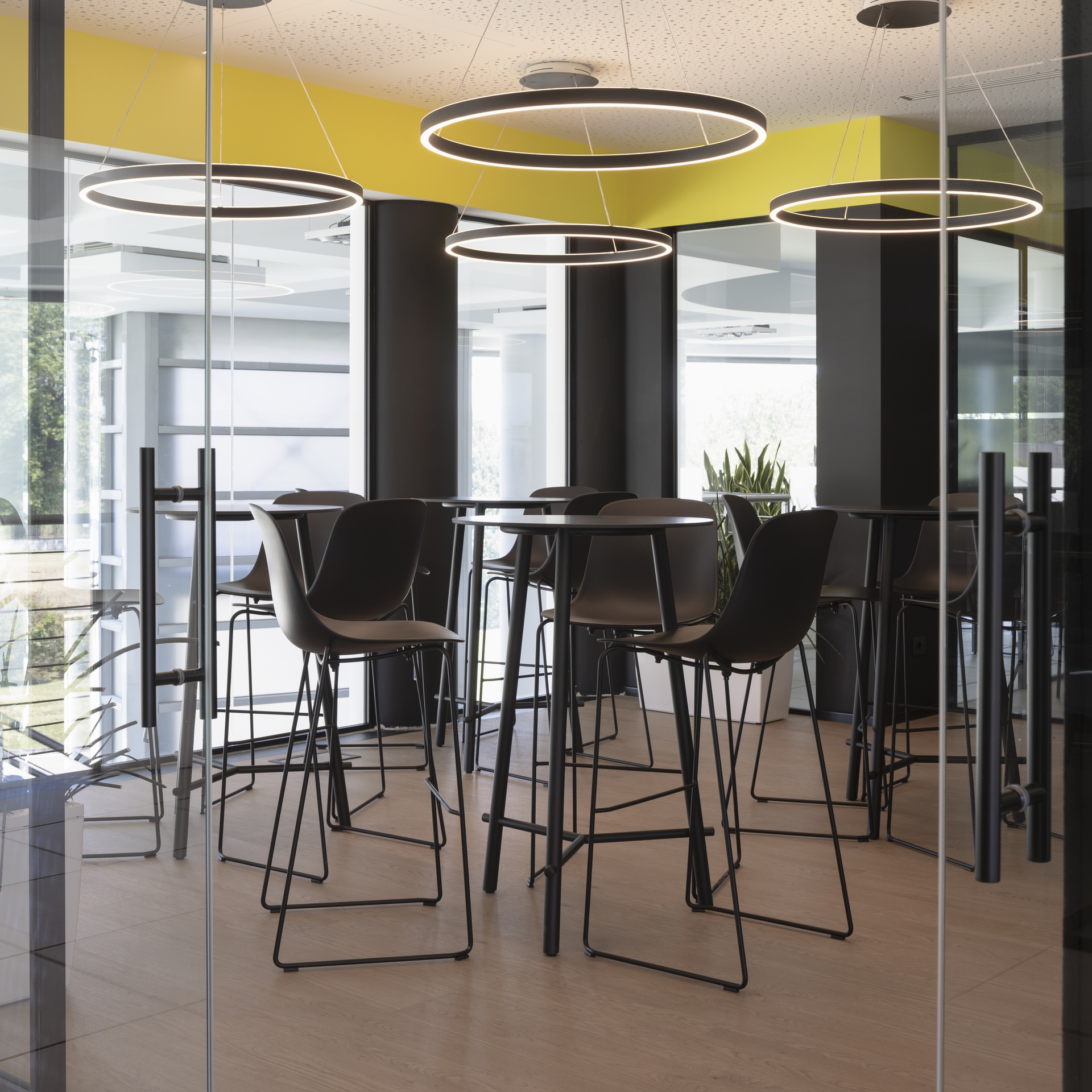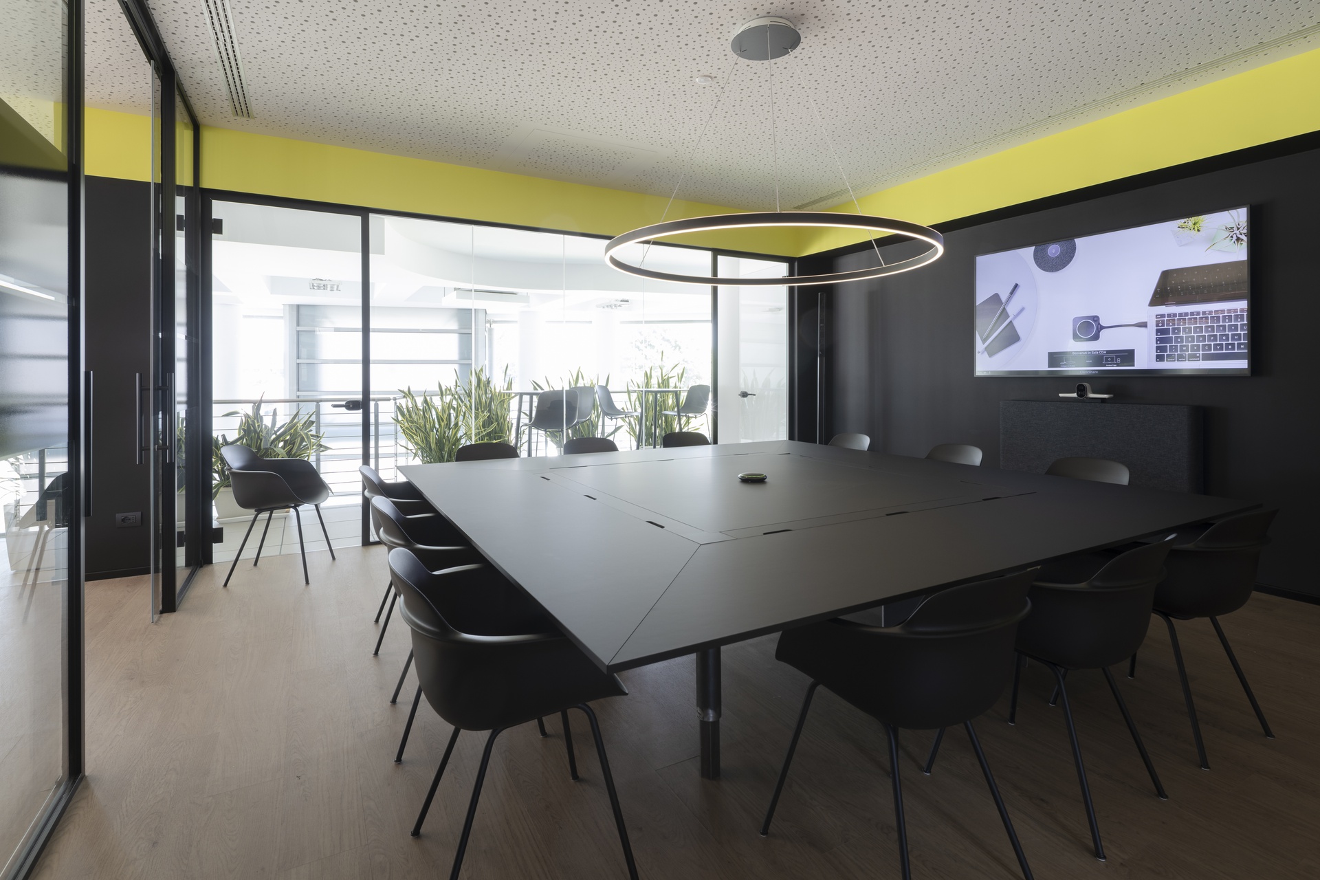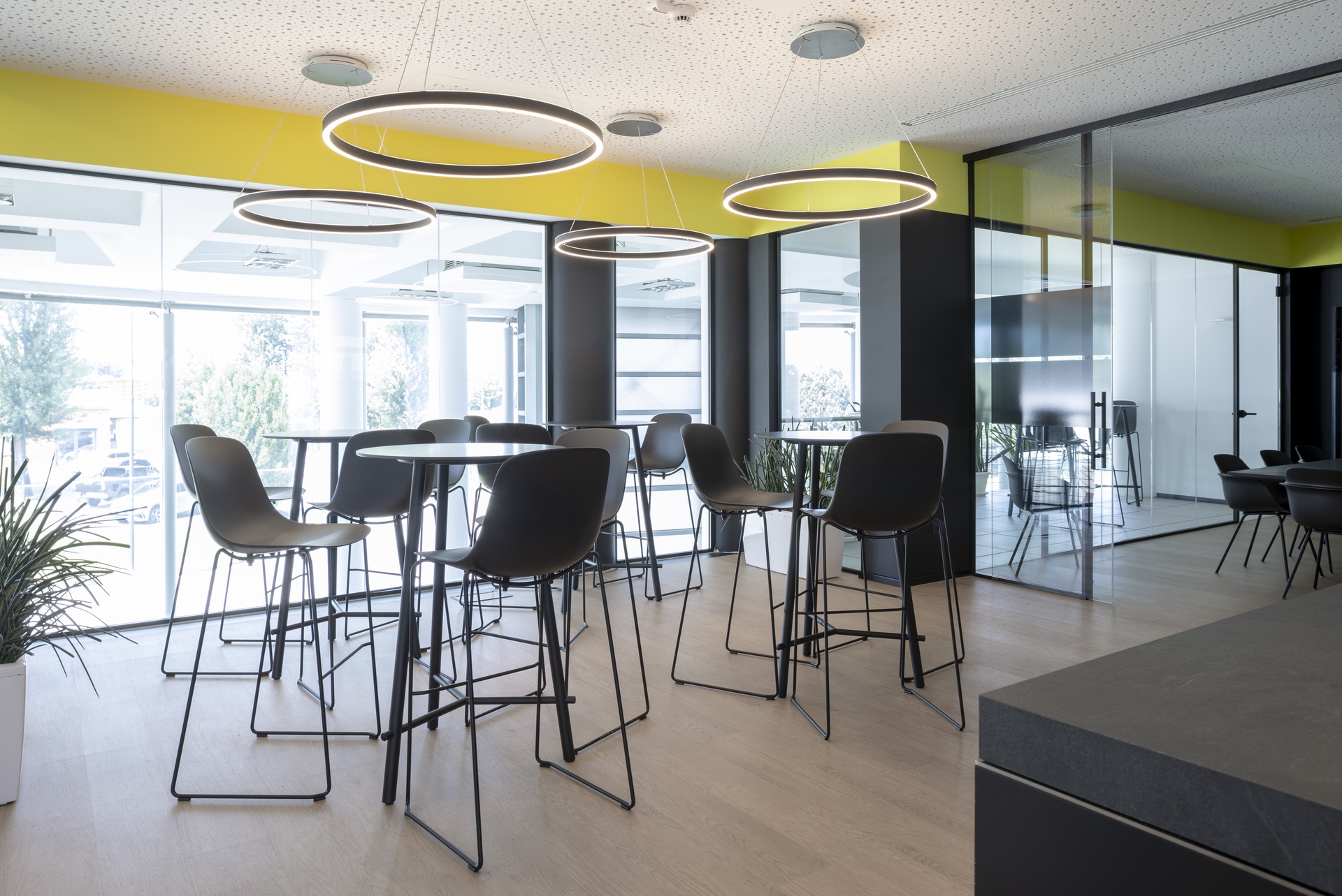 L’intervento riguarda la riconfigurazione degli uffici direzionali dell’azienda Faster Group a Rivolta d’Adda e la loro trasformazione in una zona lounge con sala riunioni e uffici, dove poter accogliere clienti o partner commerciali, svolgere all’occasione eventi aziendali e di show-cooking . L’area è al primo piano dell’edificio, sopra la zona d’ingresso e messa in diretto collegamento con questa attraverso un doppio volume e una scala aperta che dalla reception porta alla Faster lounge.Il progetto si è sviluppato fin da subito cercando di minimizzare l’impatto della ristrutturazione sull’esistente, sia attraverso il mantenimento dei percorsi longitudinali e trasversali, sia nel recupero dei materiali esistenti, come la pavimentazione galleggiante degli spazi comuni. Questo ha portato a individuare due aree, separate dal corridoio di acceso centrale, da destinare a uffici accoglienza e alla zona lounge con sala riunioni.Mentre i due uffici presentano toni neutri e un arredo minimale, la zona lounge è volumetricamente più articolata e cromaticamente caratterizzata (ved. descrizione “Faster lounge”). Per garantire una permeabilità visiva dell’area si è deciso di nascondere tutti gli impianti (idrici, elettrici, di riscaldamento e raffrescamento) nel pavimento galleggiante e nel controsoffitto. La differenza dei materiali di finitura va a rimarcare la differenza delle funzioni: negli uffici e nella zona lounge, inoltre, la pavimentazione con effetto legno e il controsoffitto forato contribuiscono a garantire il comfort acustico necessario all’uso di questi spazi.Nella zona lounge, il piano della penisola della cucina può scorrere per trasformarsi in una zona lavoro con fornelli e lavello; chiusa, invece, rimane un elemento monolitico in mezzo all’ambiente. Questa insieme alle colonne laterali (complete con frigorifero, forno, microonde e macchina del caffè) permette l’utilizzo dell’area per eventi aziendali e di show-cooking. I tavoli alti e gli sgabelli sul lato opposto, si prestano all’uso quotidiano dello spazio per mangiare, lavorare o per piccole riunioni informali.La sala riunioni è in diretto collegamento con la lounge per permettere l’utilizzo delle due aree in contemporanea. E’ dotata di un terrazzo interno che affaccia sulla zona d’ingresso e di un gioiello realizzato su misura: un tavolo riunioni progettato da noi con il bordo a sfumare, completamente cablato internamente e rivestito in fenix. La setosità del materiale della parte superiore, contrasta con le gambe sottostanti in acciaio trattato, con cui nel disegno abbiamo voluto richiamare la vocazione industriale dell’azienda.