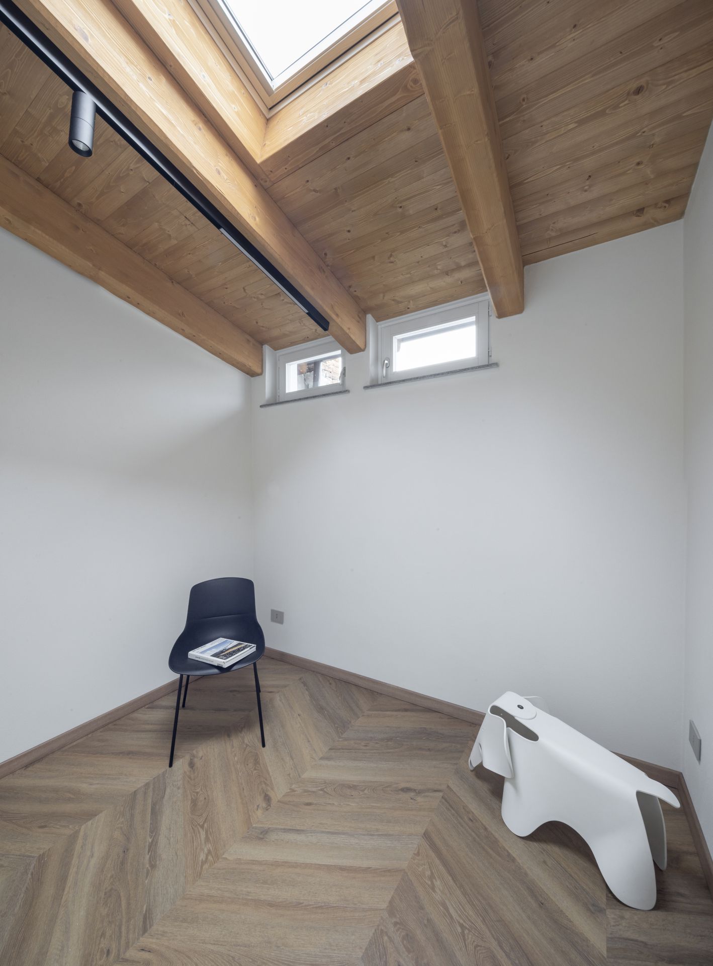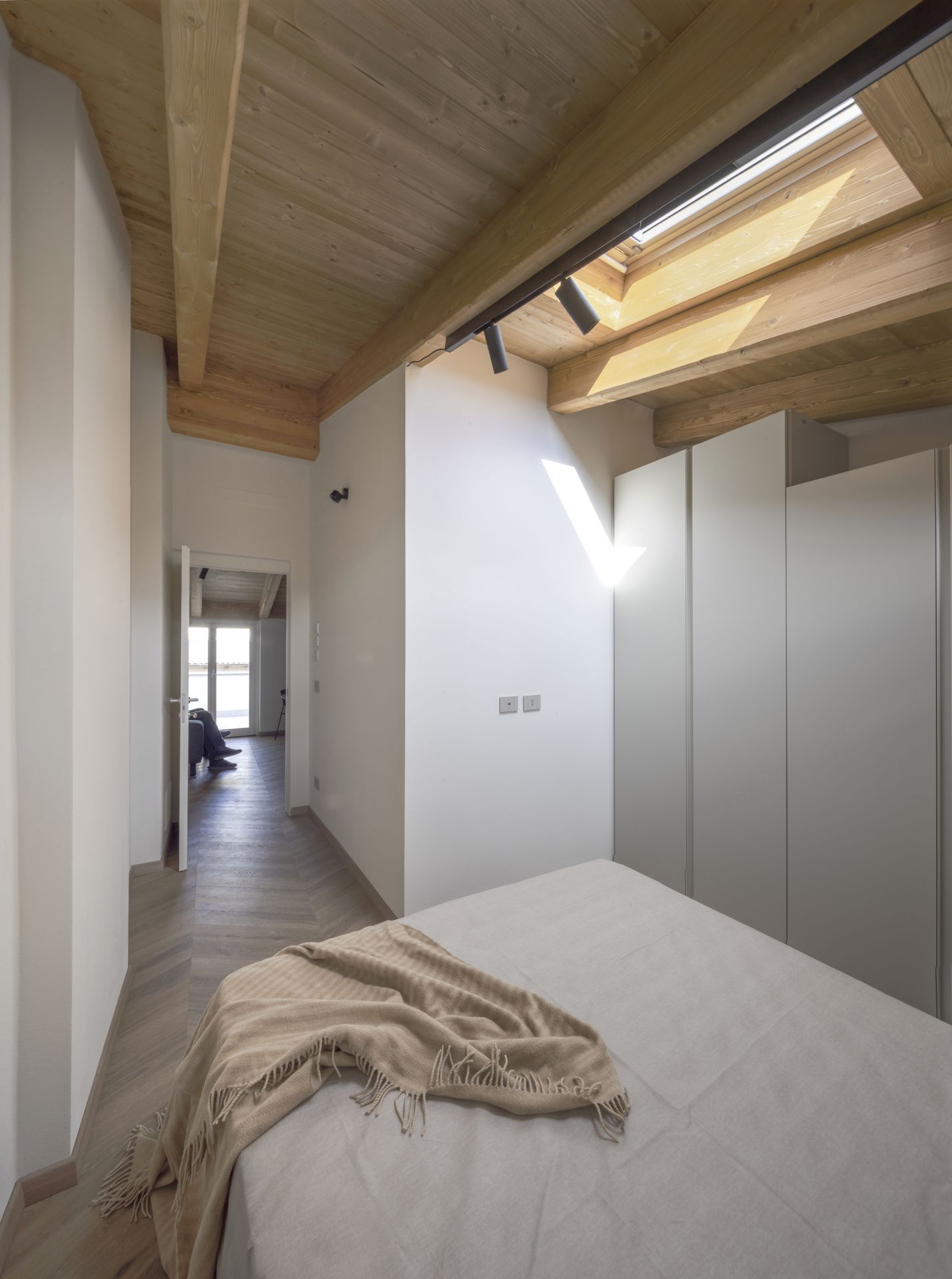 Un blocco centrale ordina gli ambienti, tra luce filtrata e spazi raccolti. L’intervento riguarda la ristrutturazione completa di un sottotetto all’ultimo piano di un palazzo antico situato lungo la via pedonale principale del centro storico di Cuneo. Lo spazio, originariamente non abitabile, è stato completamente ripensato per accogliere una nuova unità residenziale. Il progetto si struttura attorno a un blocco centrale compatto che integra cucina e bagno e funge da elemento ordinatore della distribuzione interna. Attorno a questo nucleo si articolano gli spazi abitativi, definiti da un impianto semplice e leggibile, che ottimizza le superfici e favorisce la continuità visiva. La nuova copertura è definita da travi di nuova realizzazione lasciate a vista, che contribuiscono a ridisegnare lo spazio interno e a valorizzarne le altezze e la percezione complessiva. Il progetto si completa con la realizzazione di un terrazzino affacciato sull’interno cortile, uno spazio esterno raccolto e silenzioso che introduce una relazione intima con l’esterno e diventa naturale estensione dell’ambiente abitativo. L’intervento restituisce così un’abitazione essenziale e contemporanea, in equilibrio tra rigore distributivo, luce naturale e relazione con il contesto storico urbano.