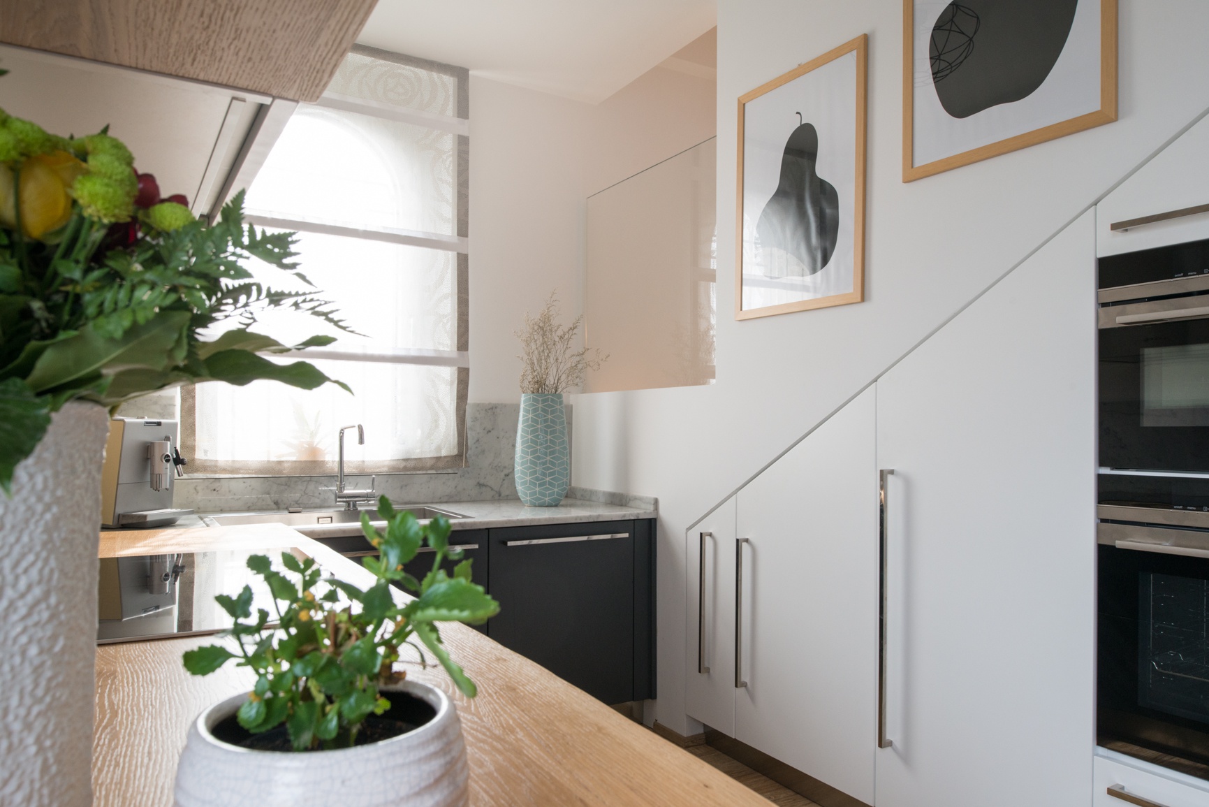 La proposta vede un arredo minimale con superfici laccate, integrato da elementi di recupero, quali vecchie tavole in legno massello segnate dall’usura del tempo. Nella zona soggiorno è stato dedicato ampio spazio al divano, composto da moduli sfalsati e la pavimentazione è stata realizzata in gres effetto legno per garantire facilità di uso e di pulizia. Il rivestimento della parete nell’ingresso, è stato pensato con pannelli in legno laccato, intervallati da pannelli in legno naturale, scelta che ha permesso di inglobare la porta che introduce al bagno di servizio. Per non creare un ingresso troppo chiuso è stata inserita una libreria a giorno che torna a ripetersi con la stessa modulazione e gli stessi materiali anche nel fianco del mobile tv, generando un filtro con la zona divano.La parete dedicata alla tv e all’impiantistica è stata pensata come un enorme contenitore dove poter riporre oggetti senza generare disordine. Lo spazio cucina è stato ottimizzato inserendo le colonne e gli elettrodomestici più ingombranti nel sottoscala, mentre tutta la zona operativa, è stata pensata sulla parete opposta dove la finestra illumina il piano lavoro con luce naturale.