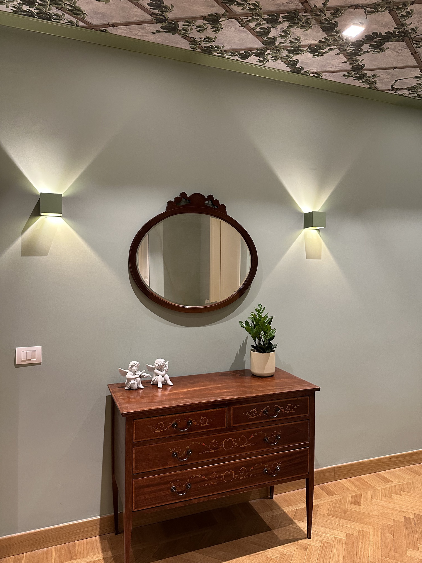 Le attività svolte all'interno di questo ingresso sono state prettamente di relooking.La Cliente aveva voglia di "svecchiare" un po' l'ingresso di casa in modo tale da poter accogliere i suoi ospiti in un'ambiente famigliare e dall'effetto WOW!Abbiamo quindi deciso di eliminare la tinta precedente alle pareti, un ormai datato giallo, con una tinta più morbida ed accogliente... la scelta è ricaduta quindi su un verde salvia. Un piccolo dettaglio è stato quello di tinteggiare le nuove applique in gesso ed una bordura a soffitto, con una tinta più scura.Il tanto desiderato effetto WOW è stata l'applicazione di un wallpaper a soffitto, raffigurante un reticolato in legno con dell'edera rampicante, donando così all'ambiente ampiezza e senso di libertà!