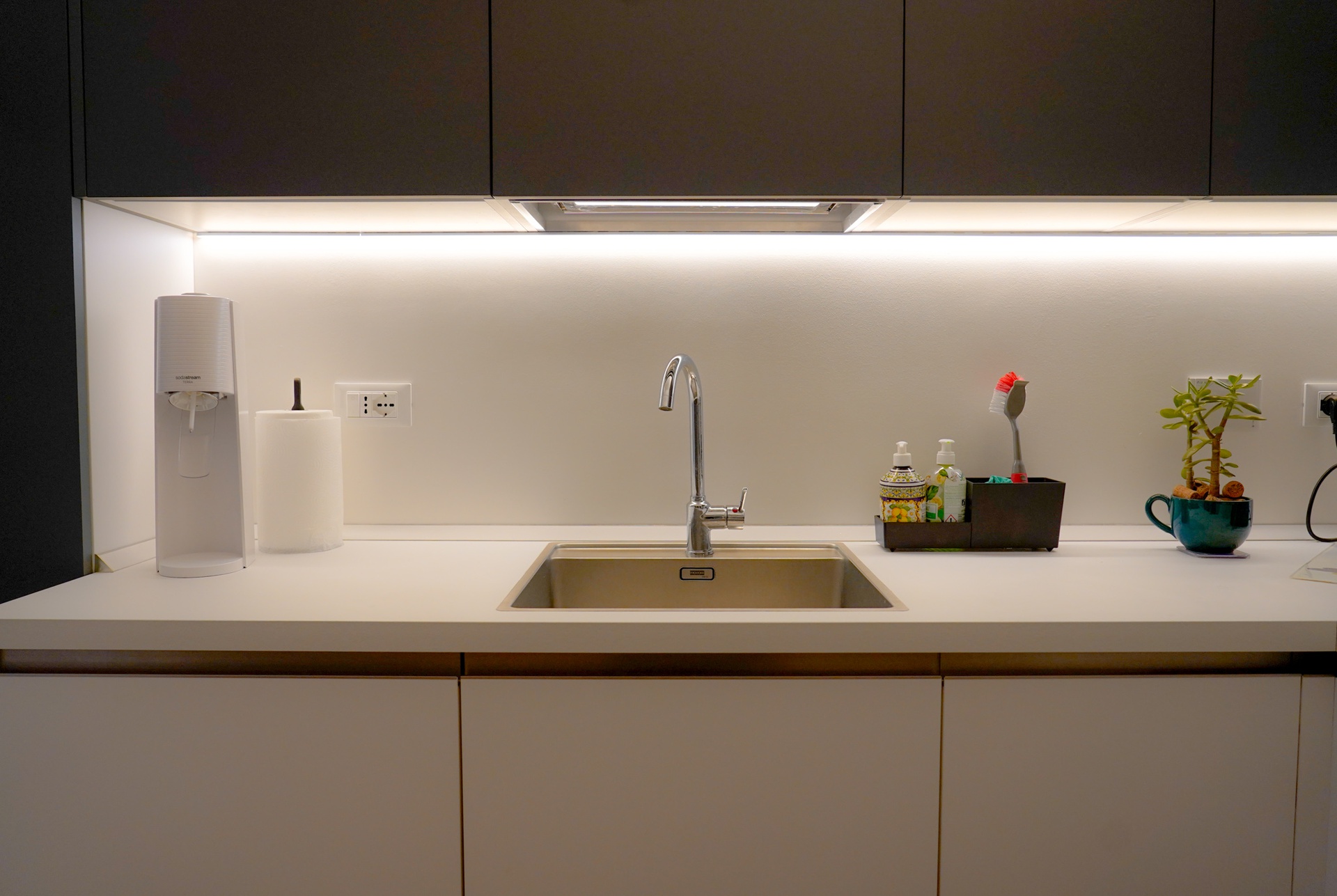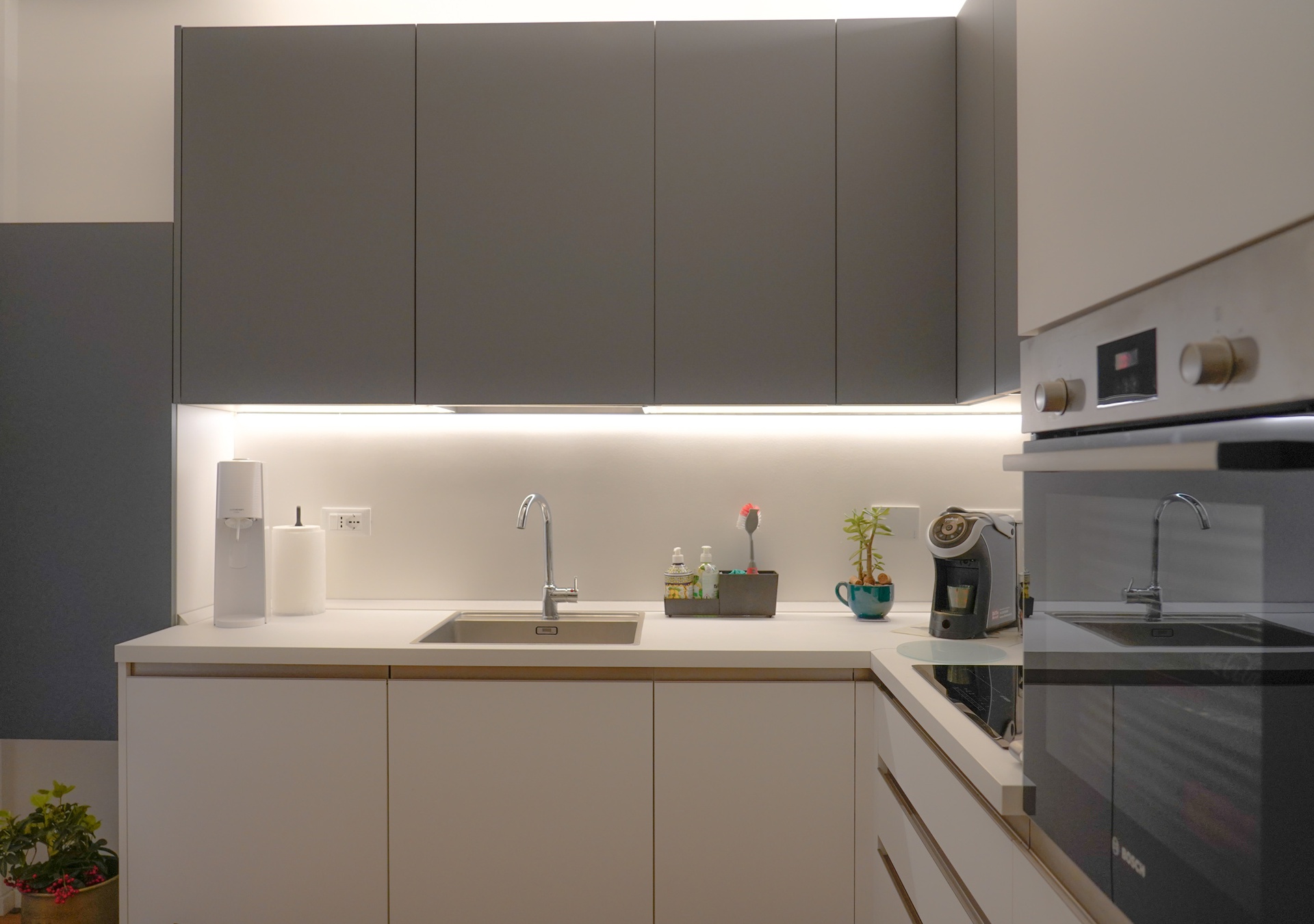 Genova - 2022Questo progetto è stato molto interessante, nella sua piccolissima dimensione (48mq) è stato cmq rivoluzionato e ogni cm è stato sfruttato. L'uso del colore e dell'arredo hanno poi completato la composizione rendendo l'interior design accattivante e giocoso.L'appartamento è situato al piano terra di un caseggiato ed è arricchito da un grazioso spazio esterno.L'impostazione originaria dell'appartamento era composta da una serie di stanze che si susseguivano lungo un piccolo corridoio di distribuzione.La funzione delle stanze non è mutata, ma grazie a piccole e delimitate demolizioni, si è cmq riusciti a rivoluzionare gli spazi.Entrando nell'ingresso vi trova spazio un armadio contenitivo e un mobile consolle con specchiera. Questo mobile blu richiama il blu (lo stesso RAL) del corridoio. Di fronte all'ingresso si accede alla camera da letto, con letto matrimoniale e un grande armadio quattro stagioni.La camera, di base bianca, ha dei decori geometrici rosa antico nel retro letto; la cromia del rosa si completa con tutte le sfumature del viola. I colori sono caratterizzati da una lieve desaturazione dei colori che rende la camera accogliente e calda.Nessun dettaglio è lasciato al caso, come la serie di specchi, la sedia dello stesso colore e le luci a comodino molto particolari.Dal corridoio si accede anche ad una dispensa che è stata ingrandita rispetto all'impianto originale per consentire di avere più spazi stivaggio in una piccola casa.Anche il corridoio è in realtà uno spazio di stiva, il controsoffitto è infatti strutturale e vi si possono riporre oggetti e scatole, vi si accede mediante una botola in legno leccato a filo muro dall'ingresso.Altre due botole di accesso sono presenti nel soggiorno in corrispondenza del ribassamento in cartongesso, sempre strutturale. Il ribassamento crea vuoti e pieni nel soggiorno realizzando un gioco di luci e ombre; grazie al suo volume riesce a definire uno spazio di stivaggio notevole per il cambio armadio, valigie ecc ecc.Prima di accedere al soggiorno si incontra il bagno, il bagno gioca tutto sulla monocromia dei grigi e dei bianchi con rivestimenti e pavimenti effetto pietra.L'unica nota di colore è data dai vari accessori e dal particolare mobile rosso-ciliegia.La demolizione che ha reso la casa diversa dal suo aspetto originale è stata quella della tramezza tra la cucina e il soggiorno, in questo modo è stato creato un unico spazio open space con cucina sala da pranzo/salotto.Il salotto dedicato alla vita giornaliera è completo di una grande tv, un ampio divano, una libreria e una zona/angolo lettura-scrittoio.Interessante è lo snack per i pasti veloci con sgabelli al di sollo del quale trova posto una cantinetta per i vini.Progetto Architettonico e Interior Design: Arch. Valentina SoleraImpresa Edile: Lumen ServicesArredo Bagni: Fratelli Rivera Arredi su misura: Artigiano km0 Luci: MarchiorettoFotografie: Matteo Cucini