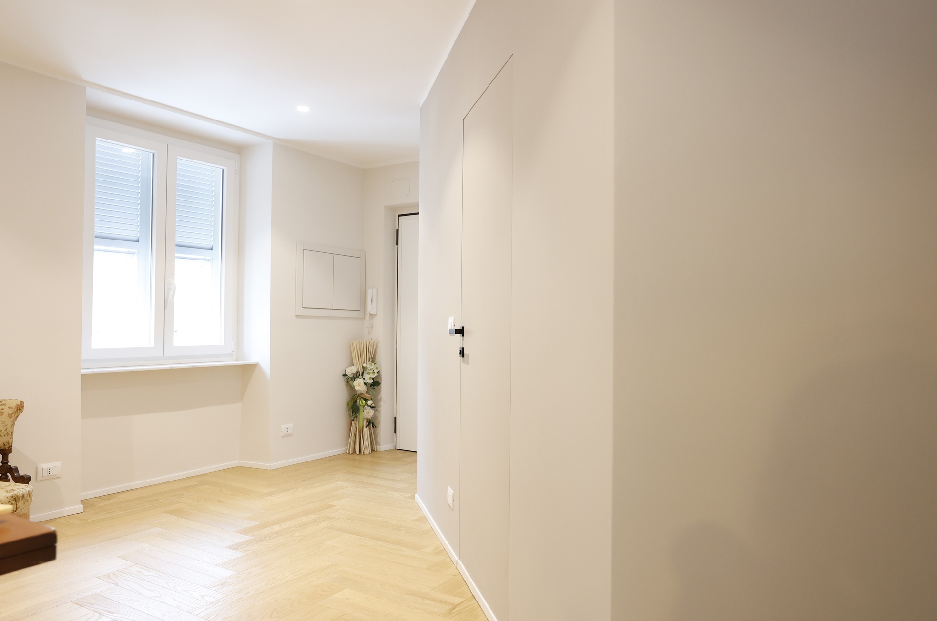 L’appartamento si trova all’interno di un caseggiato di fine ‘800, con struttura portante, tramezze collaboranti interne e solai lignei.Questo appartamento, vista mare e a due passi dalla spieggia, era caratterizzato da un lungo corridoio e da numerose stanzette, una distribuzione tipica dell’epoca di impianto del fabbricato.Il corridoio era caratterizzato da una tramezza di spina portante passante per tutto il caseggiato e sopra a questo appartamento sono presenti altri due piani.Era presente un bagno senza areazione e una cucina con latrina posta nella veranda lato cavedio.Il desiderio dei nuovi condomini è stato quello di rendere più attuale la distribuzione dell’appartamento rivoluzionando la zona giorno lato mare e volendo una sistemazione migliore per i bagni. Il primo grande cambiamento è stato l’ingresso, da vano “alla genovese” molto ampio ed inutilizzato è stato modificato ricavando una grande cabina armadio concepita come un volume a se’ in continuità con il corridoio distributivo.Il bagno cieco è stato completato da una areazione forzata e totalmente ristrutturato.La vecchia latrina è diventata una comoda lavanderia e la cucina si è trasformata in un grande bagno con finestra, antibagno e dispensa.Gli stili dei due bagni sono contrapposti, uno più rustico e romantico, l’altro iper moderno e minimalista.Il cuore della casa è la zona giorno lato mare.Le finestre con unico infisso creano una serie di quadri in soggiorno e fanno entrare il mare in casa.La zona giorno è nata della demolizione di ben 5,4 metri di parete portante e dall’installazione di un doppio portale in acciaio con pilastro formato da 2 putrelle affiancate.Questo intervento è stato la svolta poiché il mare e la luce sono entrati in casa illuminandola e rendendo l’ambiente moderno e organico.La cucina in connessione con il soggiorno presenta un’isola con tavolo dal sapore un po’ industriale.Colori tenui e pavimento in parquet a spina italiana fanno della casa un piccolo gioiello.Il fil rouge di tutto l’interior design è il dettaglio del nero che si riprende nelle maniglie, nei rubinetti, negli arredi dei bagni .Progetto e Direzione Lavori: Arch Valentina SoleraProgetto strutturale: Ing. Daniele MerloImpresa edile e impianti: US CostruzioniArredo bagno, forniture: Rivera Finiture srlCucina: Veneta CucineFotografie: Diletta Nicosia