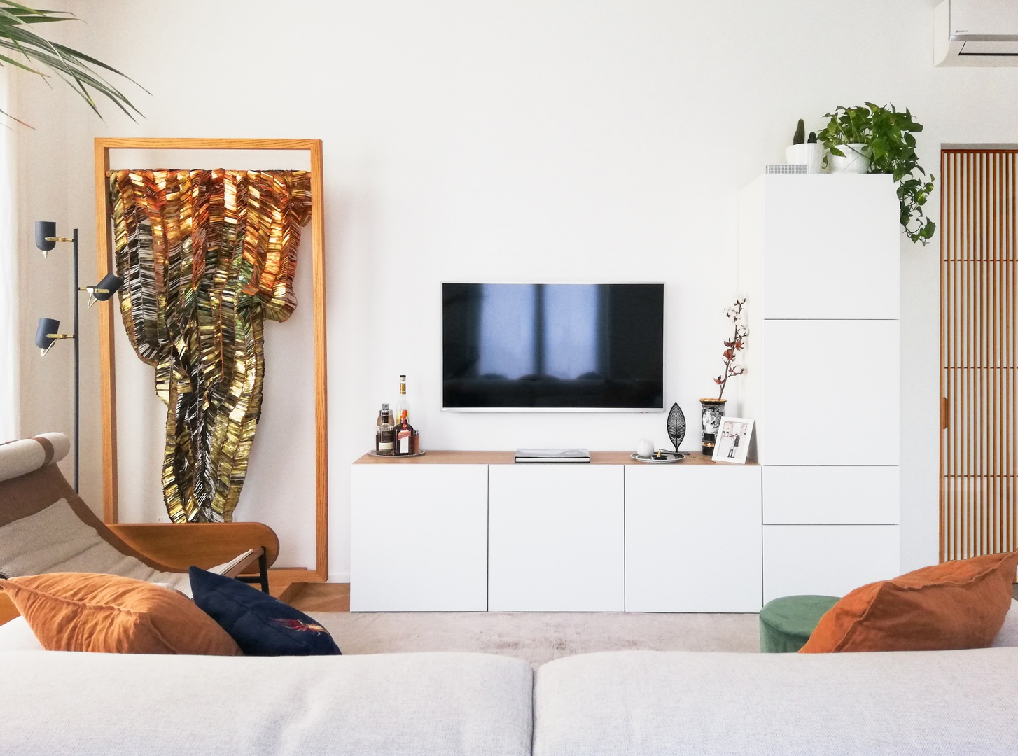 Ristrutturazione di un ampio e luminoso bilocale per una giovane coppia. La richiesta era di recuperare tutto il possibile e creare una casa molto ‘cosy’ e rilassante. Fortunatamente i materiali originali e recuperati, come il marmo botticino e il parquet di rovere, hanno dei toni morbidi e sabbiosi che già da soli sono rilassanti. Con le pareti bianche, il legno, la paglia di vienna e i tessuti neutri hanno creato un mood molto naturale. Infine grazie ai dettagli neri abbiamo evitato di avere un risultato ‘casa al mare’.I colori sono stati introdotti con opere d’arte, muri speciali e arredi secondari tenendo in mente sempre elementi naturali come le piante.