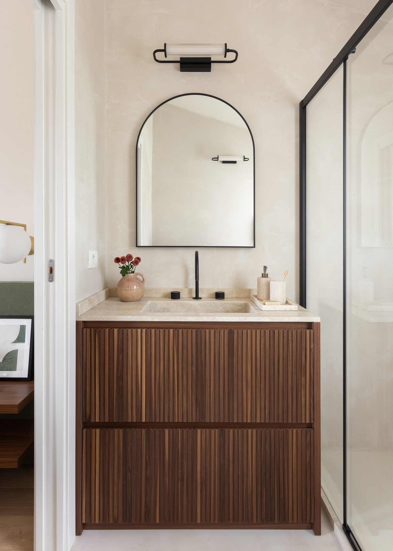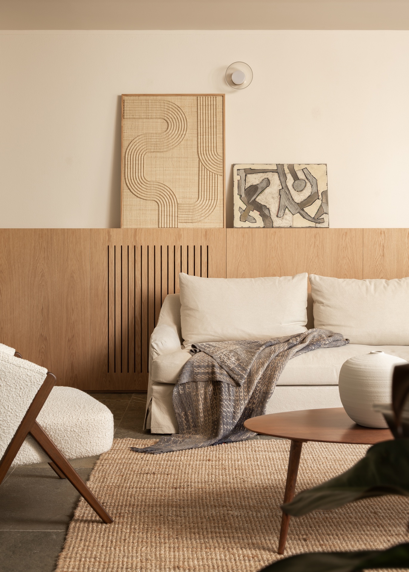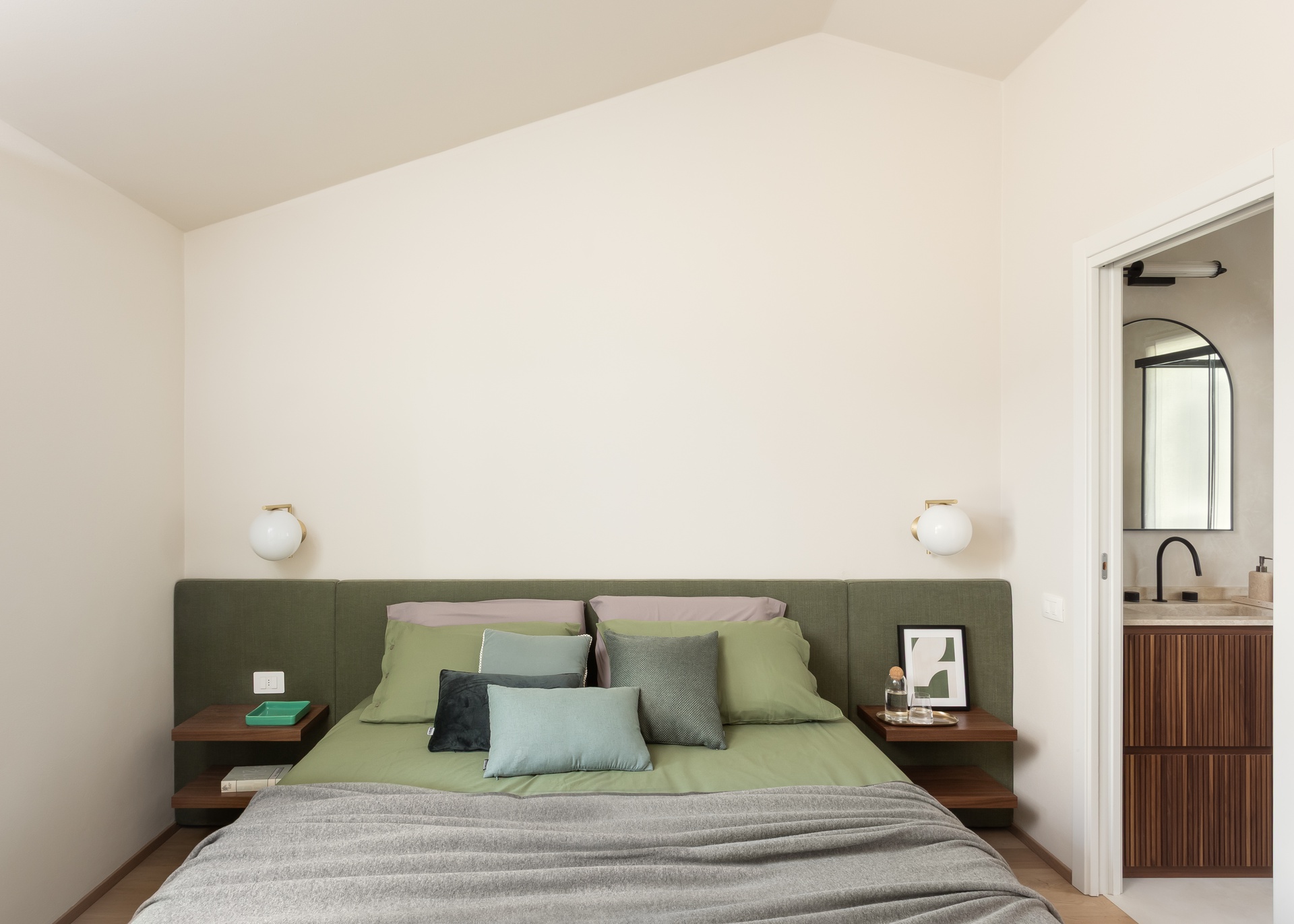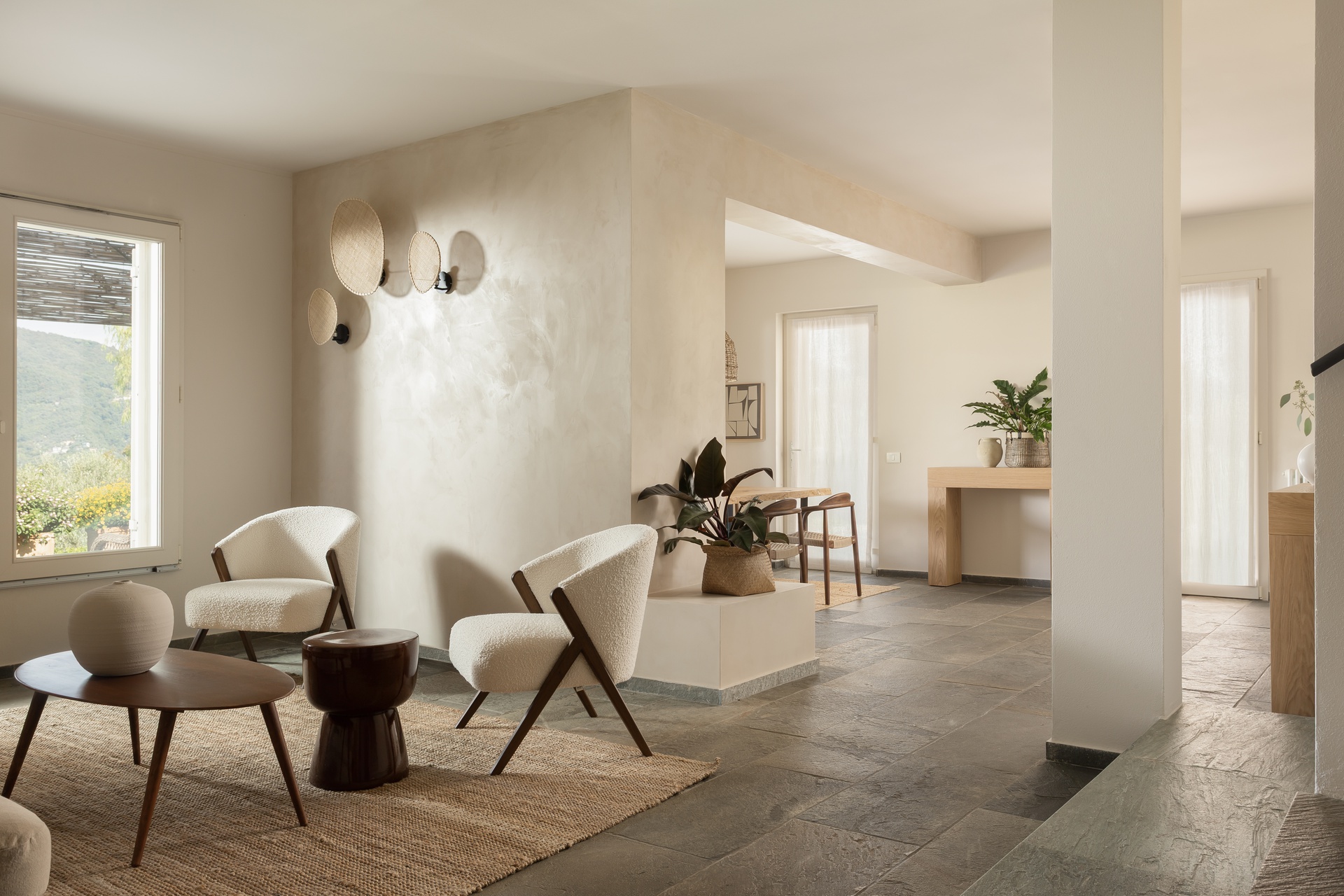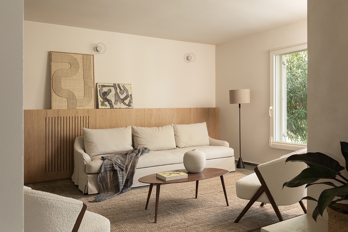 Il progetto di questa casa al mare rielabora gli interni senza alterare la struttura originale, puntando su materiali, colori e dettagli capaci di ridefinirne l’identità. Il camino, trasformato in elemento scultoreo, diventa il fulcro della zona giorno. Una palette calda e neutra, con pietra, legno e intonaci morbidi, richiama il paesaggio naturale e valorizza la luce. Arredi essenziali e tessuti naturali creano un’atmosfera equilibrata, mentre l’illuminazione discreta accompagna i diversi momenti della giornata. Nella zona notte prevalgono tonalità più avvolgenti — verdi, grigi e legno — arricchite da dettagli in ottone, per un ambiente intimo e rilassante. I bagni, completamente ridisegnati, riprendono lo stesso linguaggio materico con contrasti eleganti e moderni. In sintesi, la casa esprime un equilibrio tra semplicità, eleganza e dialogo con il paesaggio, offrendo uno spazio sereno e armonioso che riflette lo spirito della vita al mare.