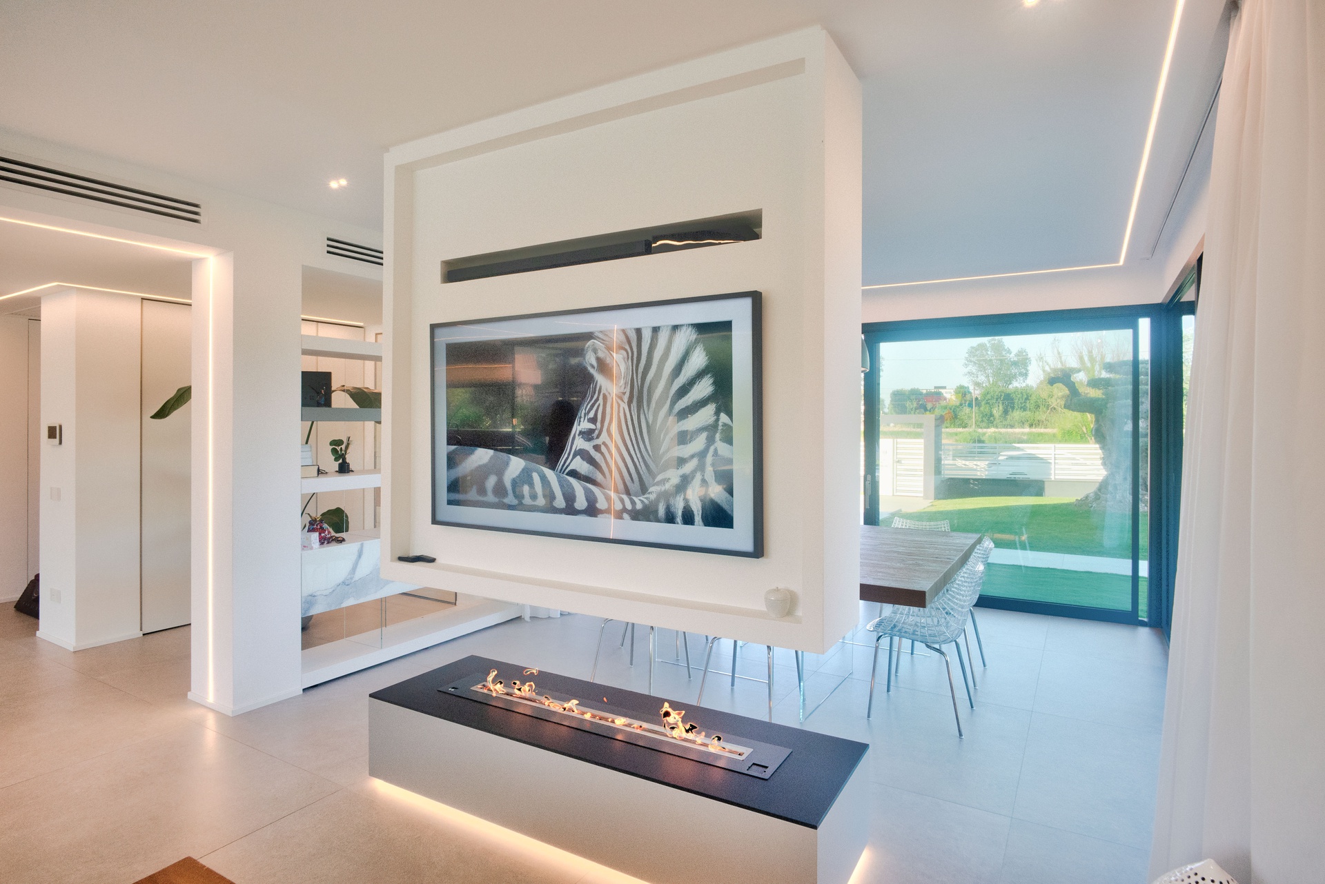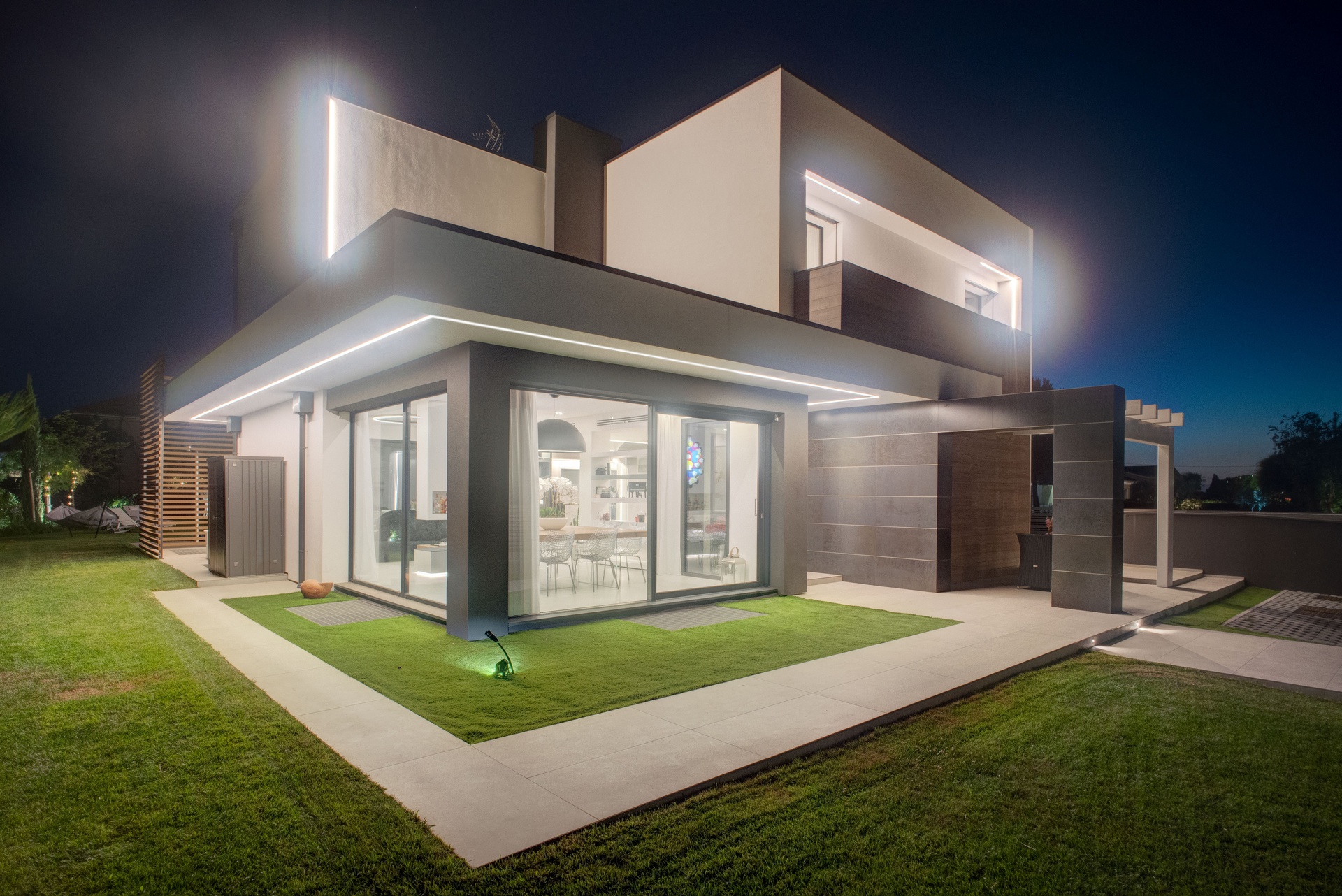 In collaborazione con lo Studio di Progettazione Area52 che ha curato il progetto architettonico, strutturale, la D.L. e tutta la parte amministrativa dell'intervento, mi sono occupato nello specifico dell'interior design e del progetto di lighting design di tutta la casa. Il fulcro della casa è sicuramente la grande scala elicoidale in cemento armato che collega i tre livelli su cui si sviluppa l'abitazione e attorno alla quale si articolano i vari volumi in una composizione architettonica che genere quattro prospetti diversi tra loro e scorci prospettici sorprendenti. Il piano terra e il piano primo sono caratterizzati dalle ampie aperture che assicurano una forte relazione visiva e funzionale tra "il dentro" e "il fuori" e dalla presenza di finiture, arredi e complementi molto particolari che donano unicità ai vari ambienti.