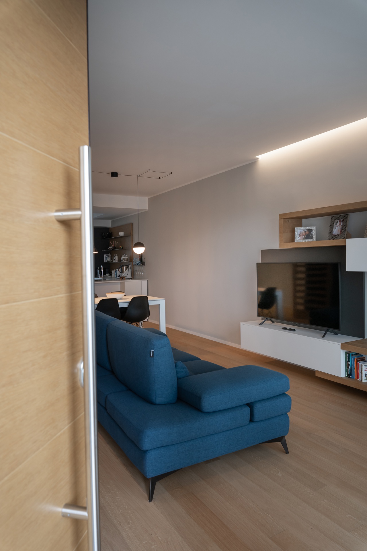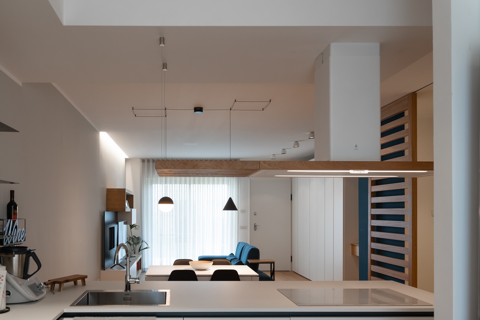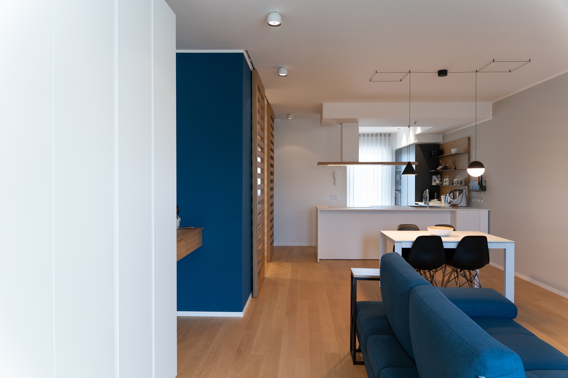 Linearità delle forme e contrasti per una villa che sorge in un nuovo complesso residenziale in Puglia. La zona giorno è separata dalla zona notte da una quinta scenica in cui il colore blu ha il ruolo comunicativo delle scelte architettoniche adottate. Non solo un atto decorativo.Il blu fa da sfondo agli scorrevoli realizzati a misura in rovere naturale e ne sottolinea i contrasti. L'alternanza dei pieni e dei vuoti è il fulcro compositivo per questi elementi che non svolgono solo funzione d'arredo, ma indicano la volontà progettuale di distribuire gli spazi sull'asse longitudinale, per garantire luminosità a tutti gli ambienti della casa. Elemento di giunzione tra gli armadi della zona giorno e la quinta è lo specchio e la sua mensola porta oggetti realizzata in rovere e a misura, completa di cassetti. La cucina è a penisola. Il contrasto tra gli elementi caratterizzati dal bianco ottico e quelli verticali nero antracite, è attenuato dagli elementi lignei d’arredo, posti a richiamare anche l’essenza del parquet naturale del pavimento.Il tocco morbido della cappa in legno sospesa da cavi in acciaio e il pannello in rovere che ospita le mensole in metallo pressopiegato e verniciato a polvere, conferiscono all’ambiente il giusto equilibrio. Se la zona giorno è caratterizzata da forti contrasti, la zona notte è dominata da linee più morbide, raffinate ed eleganti, anche se non mancano i contrasti.Sobrio e dalle allegre forme geometriche, il bagno degli ospiti.Luminosi contrasti e linearità delle forme hanno guidato l’intero progetto per questa Villa che sorge in Puglia, che nacque con il nome “Oleandro”, in un nuovo borgo, Borgo a Mare.