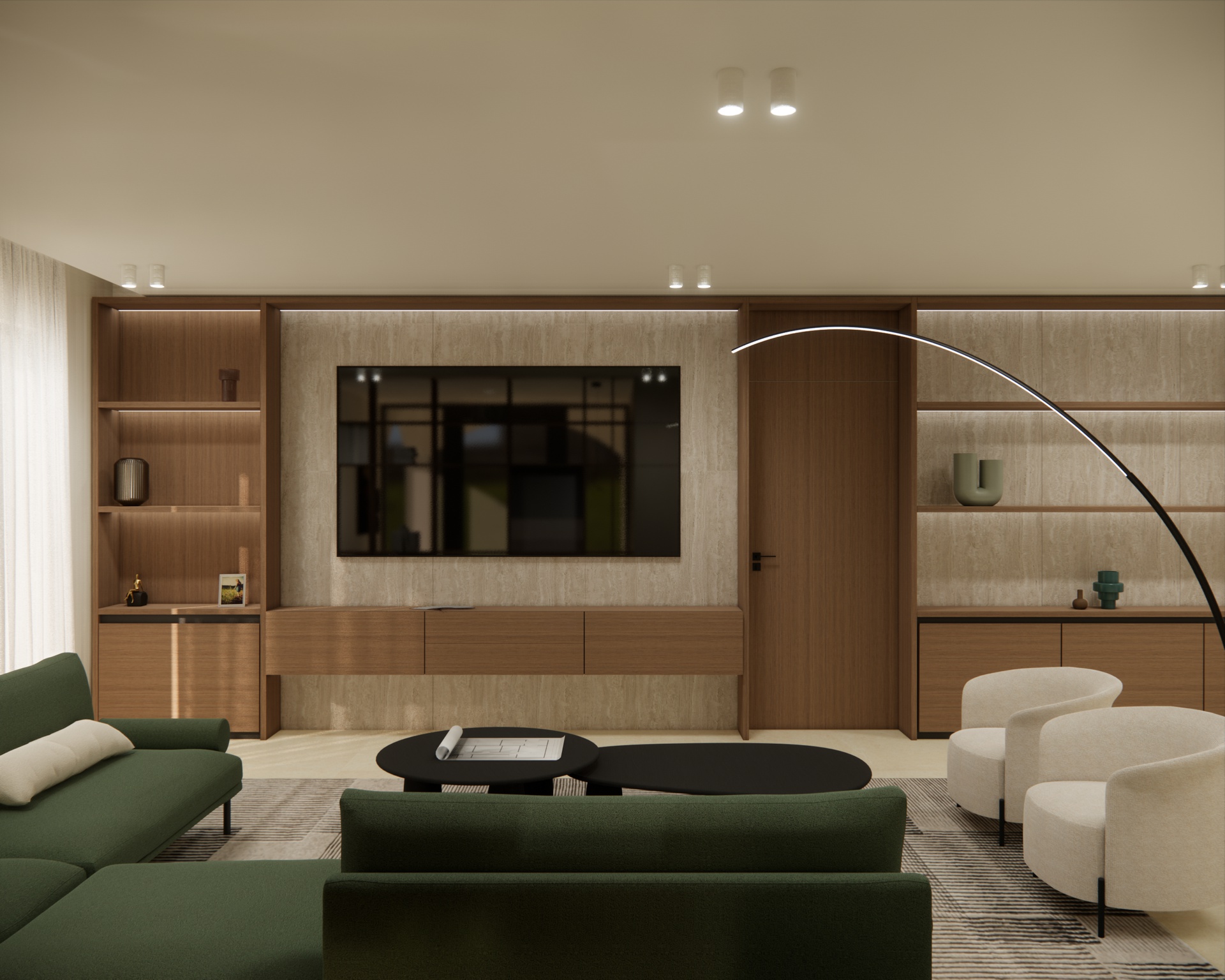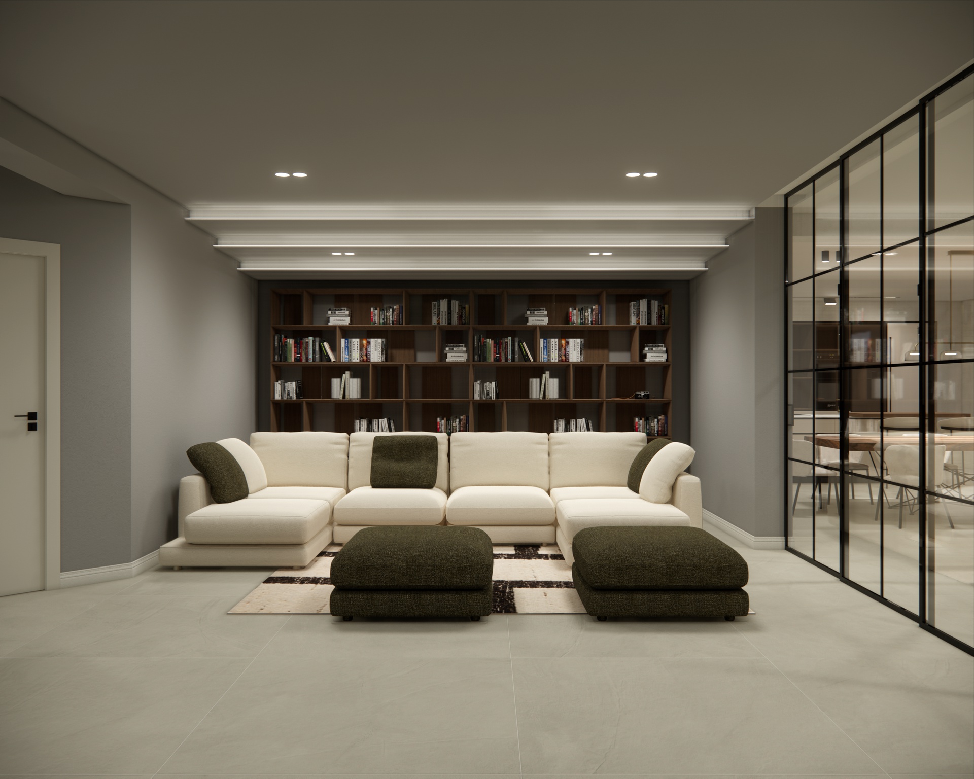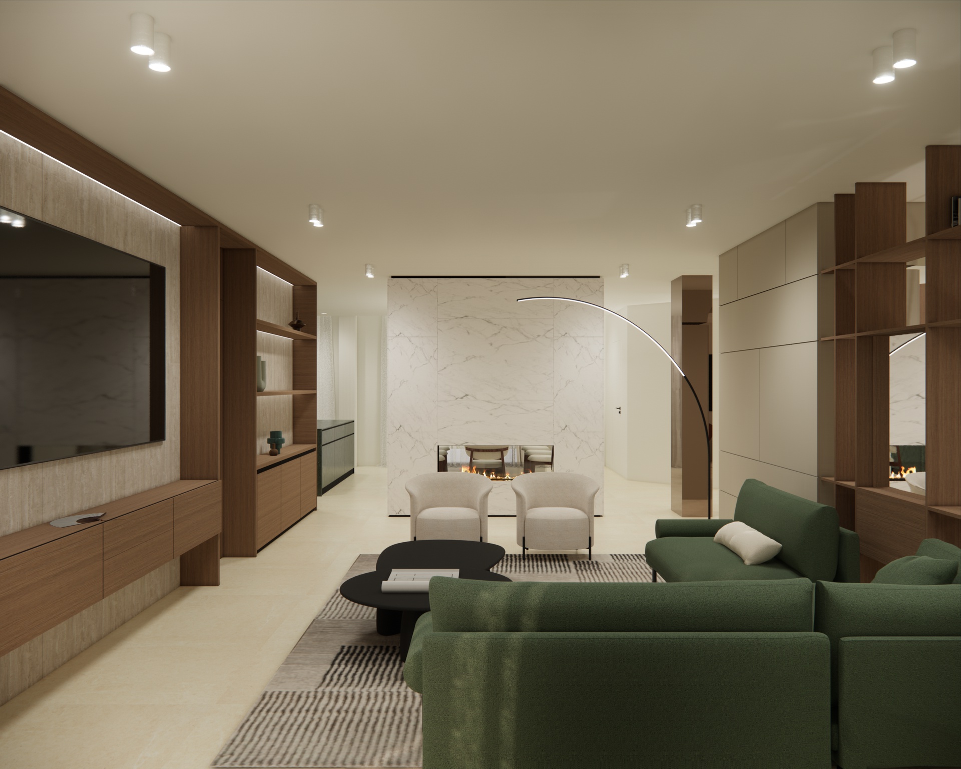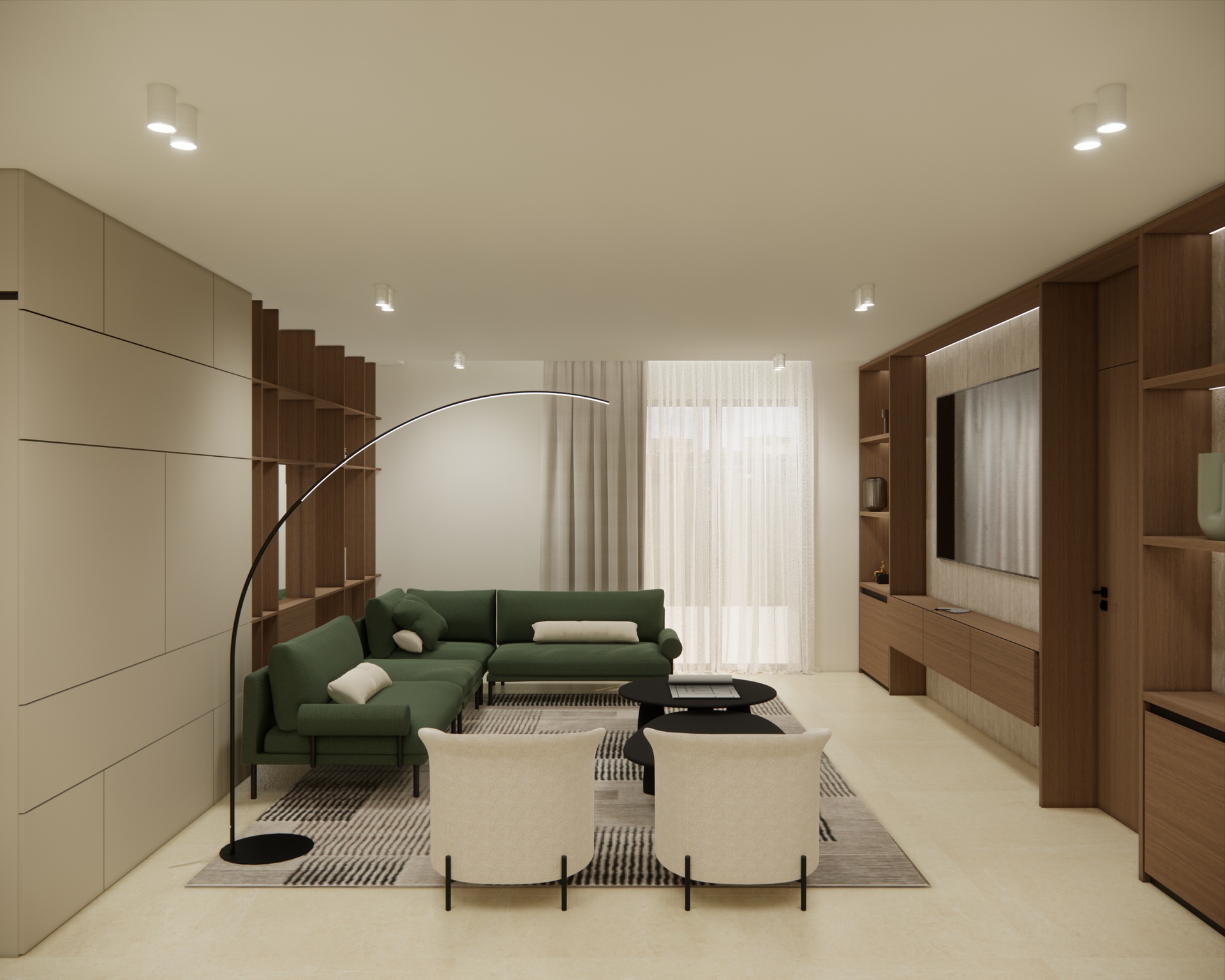 Quando siamo stati contattati dai proprietari di questa villa erano ormai stremati: 3 imprese già cambiate durante i lavori, un progetto architettonico sviluppato senza un'accurata progettazione degli arredi, errori e problemi durante varie fasi dei lavori ecc. Siamo stati così incaricati di curare tutta la progettazione di interni. La base di partenza prevedeva 2 grandi openspace: uno al piano terra e uno nel seminterrato. Due spazi enormi, vuoti, con dei pilastri al centro dello spazio pareti con ampie superfici vetrate (al piano terra). Attraverso la progettazione di arredi su misura abbiamo stravolto la distribuzione del piano terra, creato un ingresso che garantisse privacy e funzionalità, con libreria svota-tasche, cappottiera e ampio armadio contenitivo. Alle spalle di questo elemento si sviluppa un ampio salotto caratterizzato da un divano in velluto verde e una parete attrezzata che ingloba tutta la parete e diventa filo conduttore fino alla zona cucina-pranzo. Qui il verde è ancora protagonista con un'isola monolitica in verde guatemala, imponente e straordinaria. Ad essa si accosta una cucina lineare in legno e un tavolo di design elegante dai toni chiari. Al piano seminterrato l'intero spazio è stato convertito in taverna, dove trascorrere serate tra amici e parenti. L'atmosfera è un po' più rustica ed industriale con elementi in metallo, un grade tavolo il legno rustico e una caratteristica porta scorrevole in legno. La taverna è composta da un home-cinema con annesso angolo bar, salottino privato accanto ad un camino a legna rivestito in pietra, e la zona pranzo con cucina. L'ultimo piano della villa ospita la zona notte, con 2 camere da letto, bagno, lavanderia e suite padronale con doppia cabina armadio e bagno in camera.