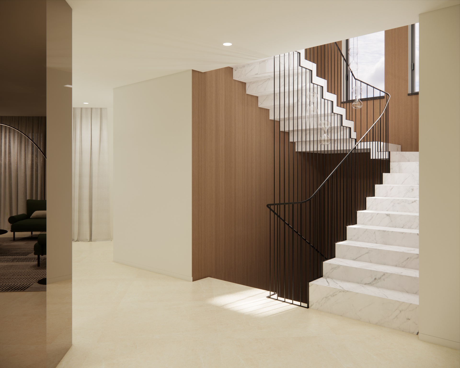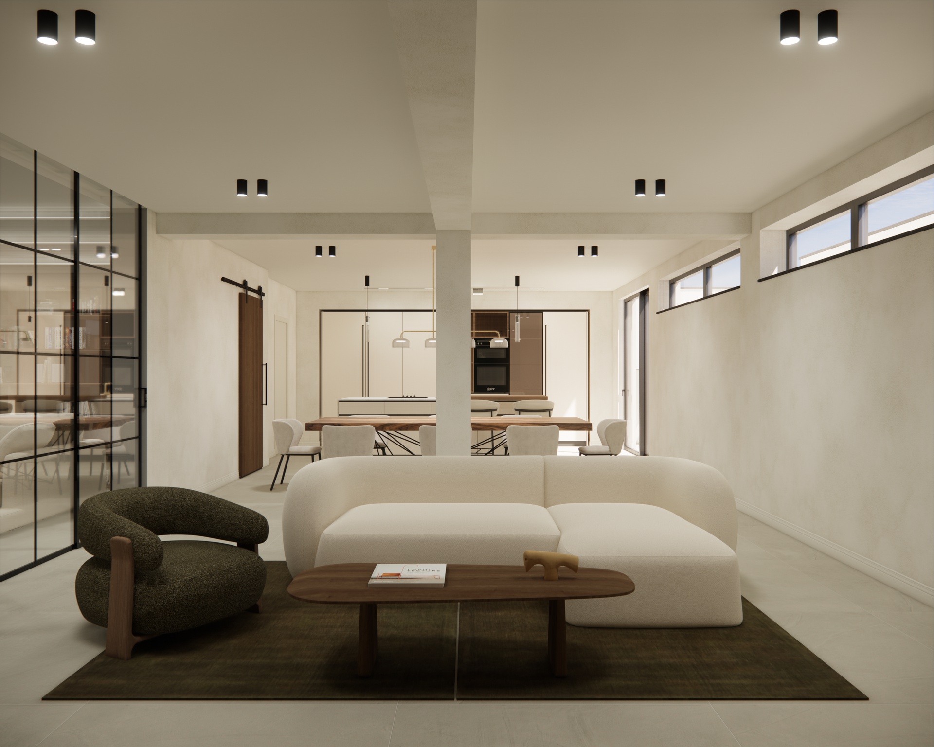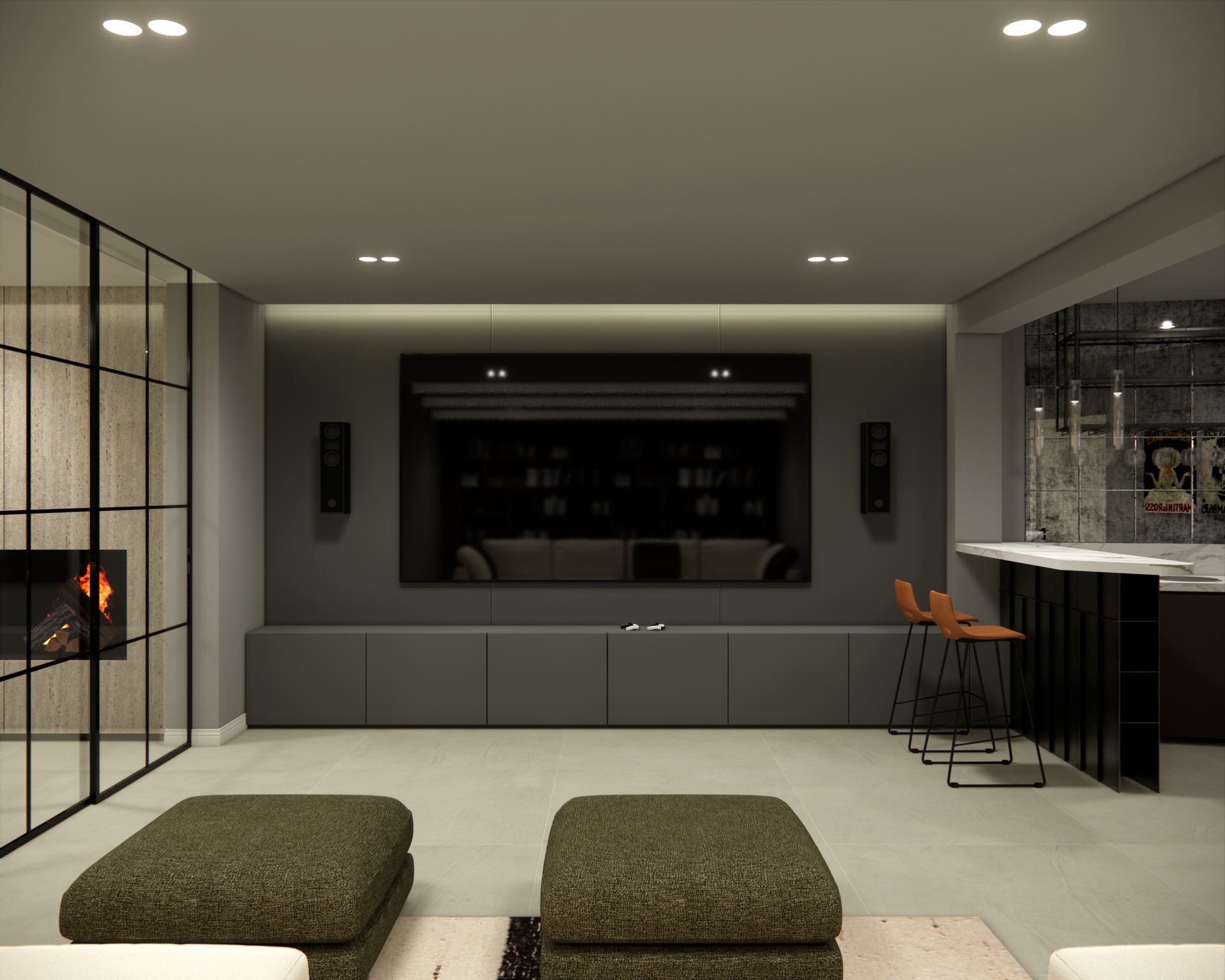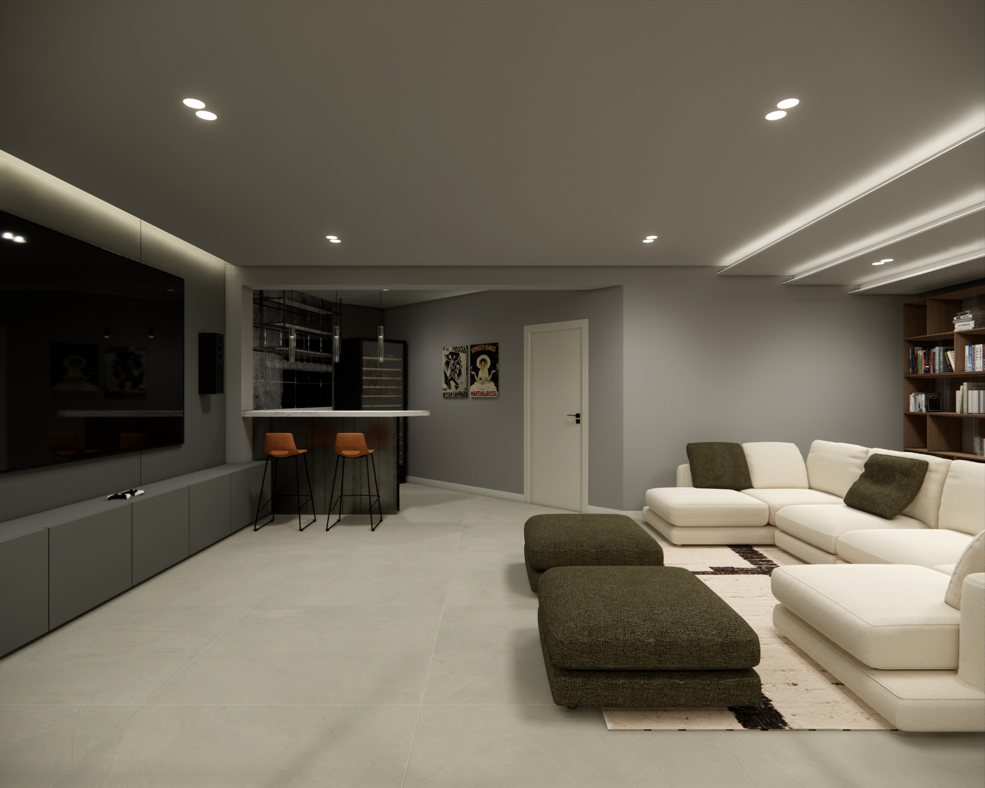 Quando siamo stati contattati dai proprietari di questa villa erano ormai stremati: 3 imprese già cambiate durante i lavori, un progetto architettonico sviluppato senza un'accurata progettazione degli arredi, errori e problemi durante varie fasi dei lavori ecc. Siamo stati così incaricati di curare tutta la progettazione di interni. La base di partenza prevedeva 2 grandi openspace: uno al piano terra e uno nel seminterrato. Due spazi enormi, vuoti, con dei pilastri al centro dello spazio pareti con ampie superfici vetrate (al piano terra). Attraverso la progettazione di arredi su misura abbiamo stravolto la distribuzione del piano terra, creato un ingresso che garantisse privacy e funzionalità, con libreria svota-tasche, cappottiera e ampio armadio contenitivo. Alle spalle di questo elemento si sviluppa un ampio salotto caratterizzato da un divano in velluto verde e una parete attrezzata che ingloba tutta la parete e diventa filo conduttore fino alla zona cucina-pranzo. Qui il verde è ancora protagonista con un'isola monolitica in verde guatemala, imponente e straordinaria. Ad essa si accosta una cucina lineare in legno e un tavolo di design elegante dai toni chiari. Al piano seminterrato l'intero spazio è stato convertito in taverna, dove trascorrere serate tra amici e parenti. L'atmosfera è un po' più rustica ed industriale con elementi in metallo, un grade tavolo il legno rustico e una caratteristica porta scorrevole in legno. La taverna è composta da un home-cinema con annesso angolo bar, salottino privato accanto ad un camino a legna rivestito in pietra, e la zona pranzo con cucina. L'ultimo piano della villa ospita la zona notte, con 2 camere da letto, bagno, lavanderia e suite padronale con doppia cabina armadio e bagno in camera.