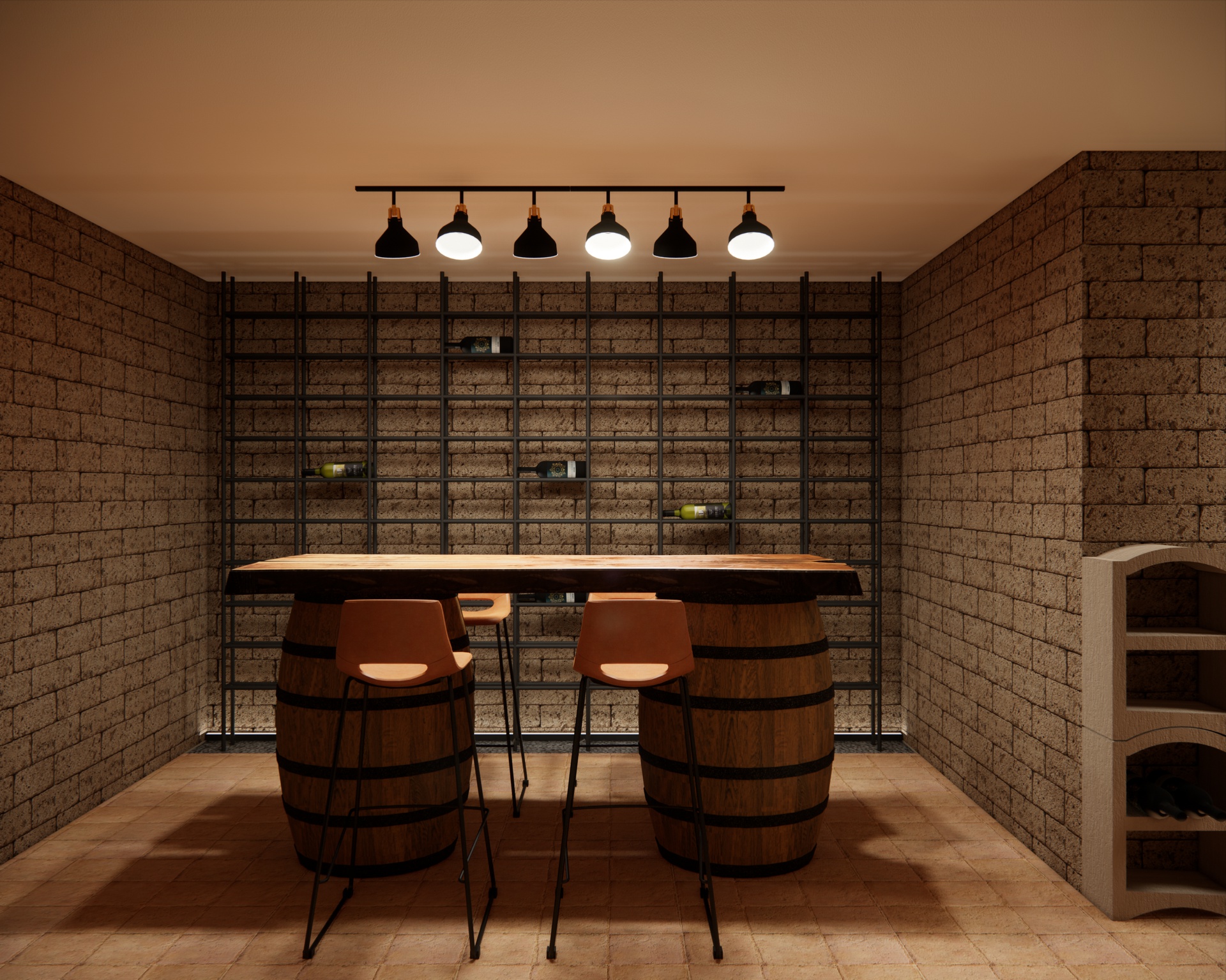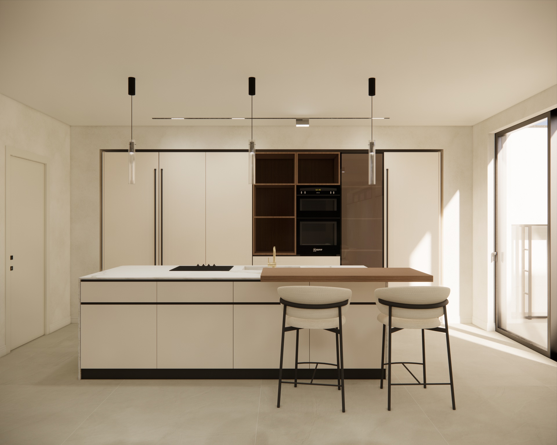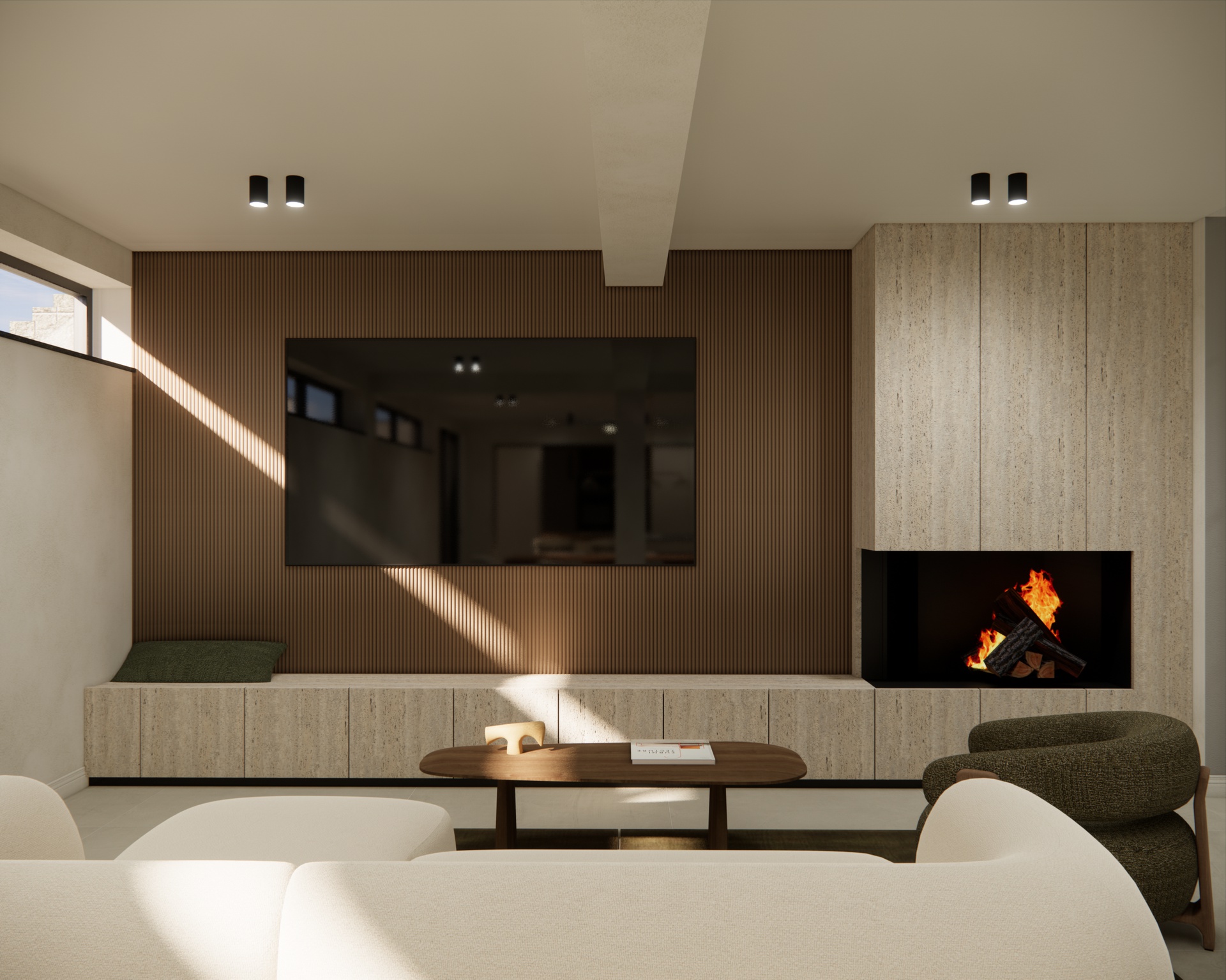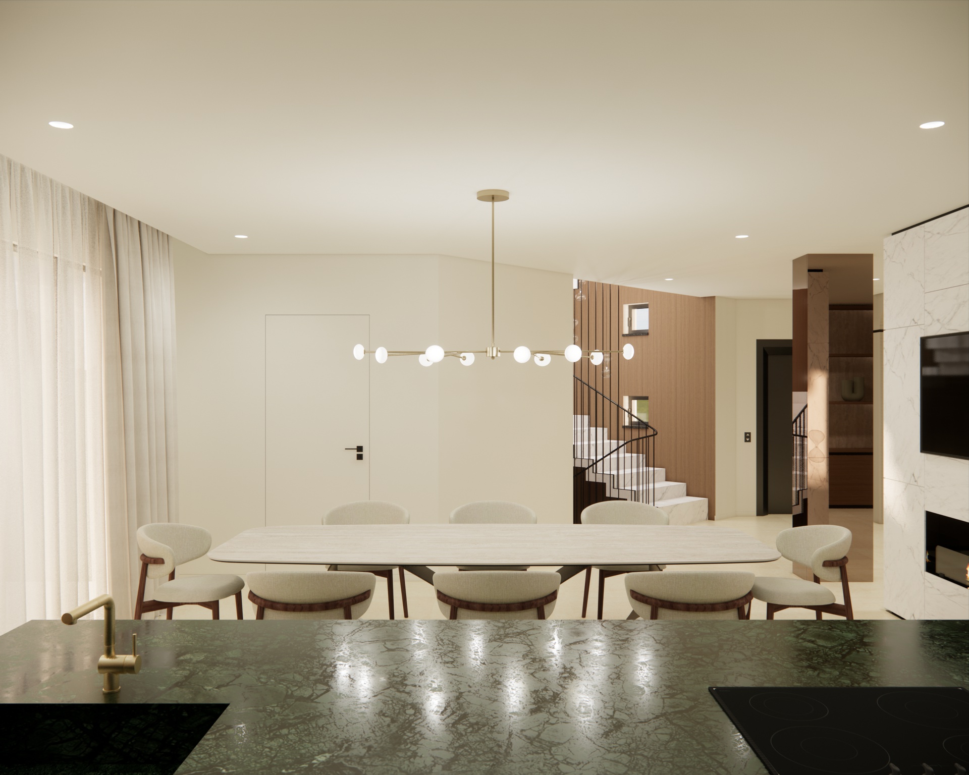 Quando siamo stati contattati dai proprietari di questa villa erano ormai stremati: 3 imprese già cambiate durante i lavori, un progetto architettonico sviluppato senza un'accurata progettazione degli arredi, errori e problemi durante varie fasi dei lavori ecc. Siamo stati così incaricati di curare tutta la progettazione di interni. La base di partenza prevedeva 2 grandi openspace: uno al piano terra e uno nel seminterrato. Due spazi enormi, vuoti, con dei pilastri al centro dello spazio pareti con ampie superfici vetrate (al piano terra). Attraverso la progettazione di arredi su misura abbiamo stravolto la distribuzione del piano terra, creato un ingresso che garantisse privacy e funzionalità, con libreria svota-tasche, cappottiera e ampio armadio contenitivo. Alle spalle di questo elemento si sviluppa un ampio salotto caratterizzato da un divano in velluto verde e una parete attrezzata che ingloba tutta la parete e diventa filo conduttore fino alla zona cucina-pranzo. Qui il verde è ancora protagonista con un'isola monolitica in verde guatemala, imponente e straordinaria. Ad essa si accosta una cucina lineare in legno e un tavolo di design elegante dai toni chiari. Al piano seminterrato l'intero spazio è stato convertito in taverna, dove trascorrere serate tra amici e parenti. L'atmosfera è un po' più rustica ed industriale con elementi in metallo, un grade tavolo il legno rustico e una caratteristica porta scorrevole in legno. La taverna è composta da un home-cinema con annesso angolo bar, salottino privato accanto ad un camino a legna rivestito in pietra, e la zona pranzo con cucina. L'ultimo piano della villa ospita la zona notte, con 2 camere da letto, bagno, lavanderia e suite padronale con doppia cabina armadio e bagno in camera.