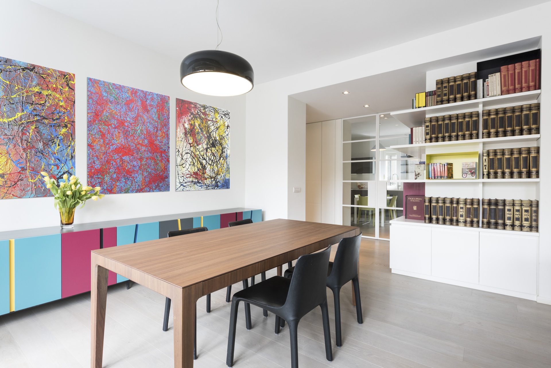 Non capita spesso di trovare appartamenti come questo: geometrie, tocchi di colore decisi e uno stile estroso ed elegante! L'appartamento, completamente ristrutturato dallo studio di architettura ArchiFacturing, si trova a Milano nel quartiere QTS (Quartiere Tortona Solari).Gli architetti Sara Cimarelli e Giorgio Opolka hanno dato molta importanza allo studio della luce ed a soluzioni d'arredo che puntano ad avere, già dall'ingresso dell'appartamento, un impatto sorprendente.L'ampio living è arredato in stile contemporaneo, dove un sapiente utilizzo della luce e del colore contribuisce a dare vita a un ambiente sofisticato ma al contempo giovane e dinamico. Qui, la maggior parte degli arredi sono progettati e realizzati su misura, spicca in modo particolare la colorata madia dai toni brillanti della zona pranzo.Una grande vetrata divide il salone dalla cucina ma basta aprire le due ante a battente per avere un living totalmente in connessione con l'ambiente cucina. Rafforza il concetto di connessione la libreria, anch'essa disegnata e realizzata su misura, che ha il compito di connettere i due ambienti. Infatti, la parete attrezzata che abbraccia tutta la zona living passando attraverso la vetrata fino in cucina è una soluzione di grande effetto che contribuisce a unire concettualmente le varie aree della zona giorno.Si è fatta molta attenzione ai colori, per avere un equilibrio di toni per la zona relax dei divani.Ogni dettaglio è stato pensato per creare un ambiente confortevole e accogliente, in cui riposare, guardare la Tv o semplicemente scambiare qualche chiacchiera in famiglia o con gli ospiti. Per ottenere questo risultato i progettisti hanno puntato sul perfetto equilibrio tra toni neutri e vivaci.Come in ogni realizzazione dello studio ArchiFacturing, non viene meno l'attenzione all'organizzazione degli spazi contenitivi; accanto alla vetrata sembra prosegua una parete boiserie ma in realtà grazie a un semplice gesto si rivela un capiente armadio guardaroba perfetto per ospitare cappotti e borse.L'appartamento continua con tre ampie camere da letto e due bagni ma l'ambiente disimpegno sorprende il visitatore con un angolo studio ed una ampia parete lavagna dedicata alla fantasia dei piccoli di casa.Foto: Paolo Fusco
