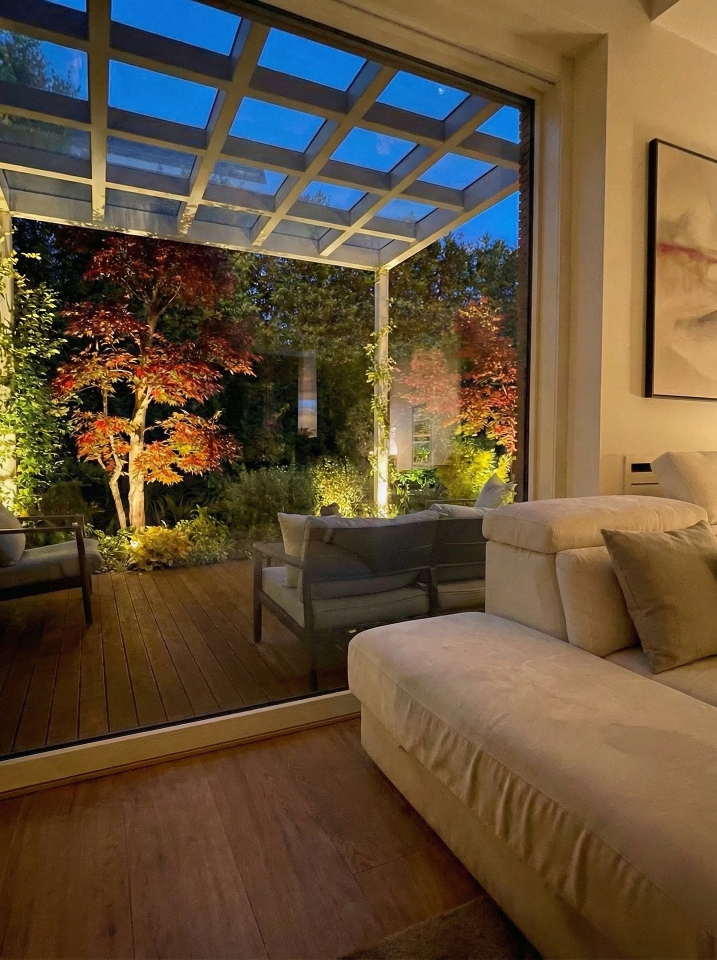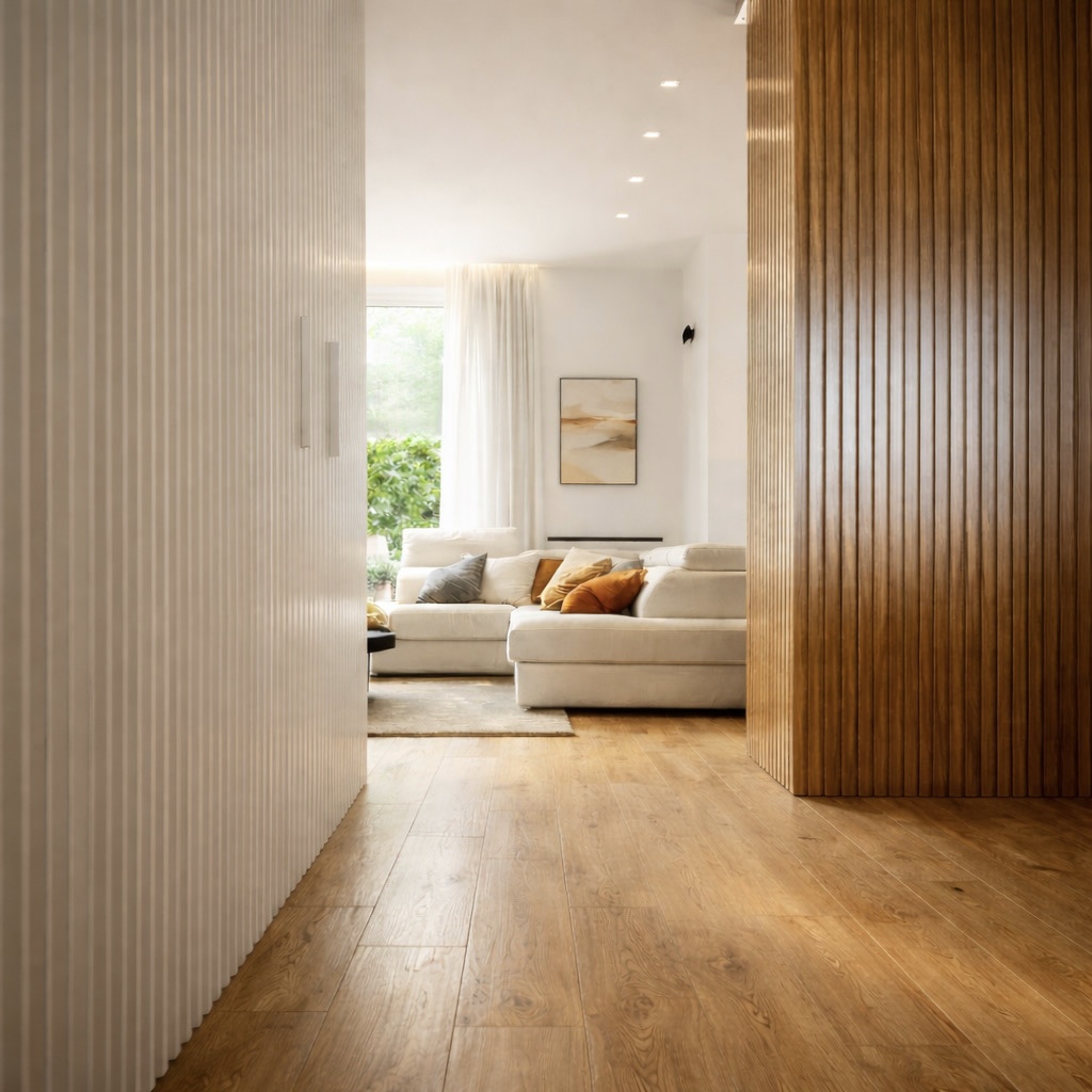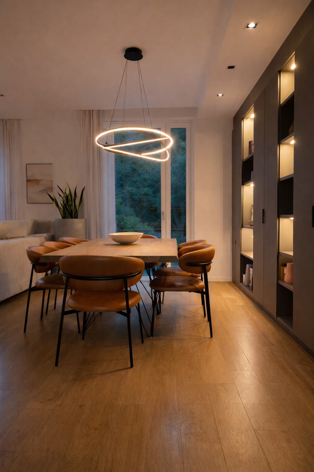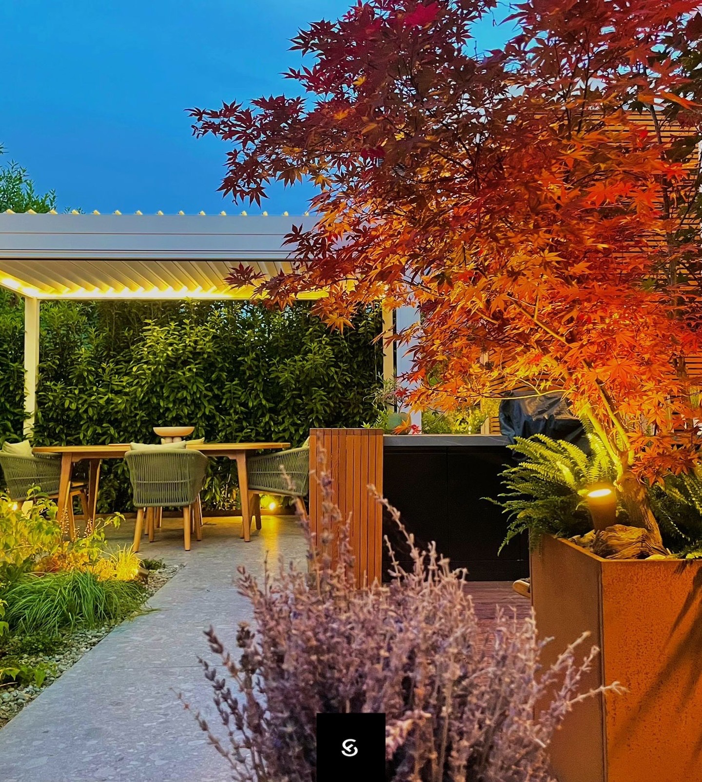 Questo progetto rappresenta la perfetta sintesi tra eleganza contemporanea e calore domestico. L'obiettivo era creare un ambiente che fosse al contempo sofisticato e profondamente accogliente, dove la luce gioca un ruolo da protagonista assoluta.Il fil rouge dell'abitazione è l'uso materico del legno: dalle boiserie cannettate che ritmano i corridoi nascondendo i passaggi, al parquet che scalda ogni stanza, fino ai dettagli della cucina. La zona giorno è un open space fluido, dove il living si raccoglie attorno a un camino minimale e nicchie retroilluminate, mentre la sala da pranzo è impreziosita da un lampadario scultoreo a cerchi intrecciati che dialoga con le tonalità cognac delle sedute.La cucina, bianca ed essenziale, diventa un punto privilegiato di osservazione: la grande finestra incornicia il paesaggio e lascia entrare la "golden hour", trasformando la preparazione dei pasti in un momento magico.In questo progetto, l'architettura non si limita a definire gli spazi interni, ma diventa una cornice per la natura circostante. Il vero cuore pulsante della villa è il dialogo ininterrotto tra in e out: le ampie vetrate scorrevoli a tutt’altezza smaterializzano i confini, trasformando il giardino in un’estensione naturale del living e della cucina.L'esterno è stato concepito secondo la filosofia del Dry Garden, una scelta consapevole che unisce sostenibilità ed estetica. Non un semplice giardino ornamentale, ma un ecosistema resiliente progettato per prosperare con un ridotto fabbisogno idrico. La selezione botanica privilegia essenze autoctone e piante rustiche, capaci di adattarsi al clima e di resistere agli stress termici senza rinunciare alla bellezza.Questo approccio paesaggistico regala una scenografia in continua metamorfosi: il giardino è un quadro vivente che muta colore e texture con il passare delle stagioni. Dalle fioriture primaverili ai toni accesi e ramati del foliage autunnale – visibili nelle sfumature degli aceri e degli arbusti – ogni periodo dell'anno offre una nuova atmosfera che entra prepotentemente in casa, arredandola con la luce e i colori della natura.Il patio, protetto da una pergola bioclimatica e pavimentato in legno caldo, diventa così il luogo privilegiato per osservare questo spettacolo, in un perfetto equilibrio tra comfort contemporaneo e rispetto per l'ambiente.