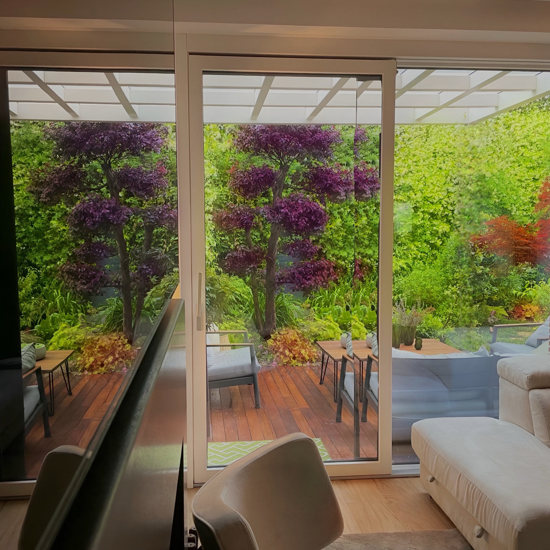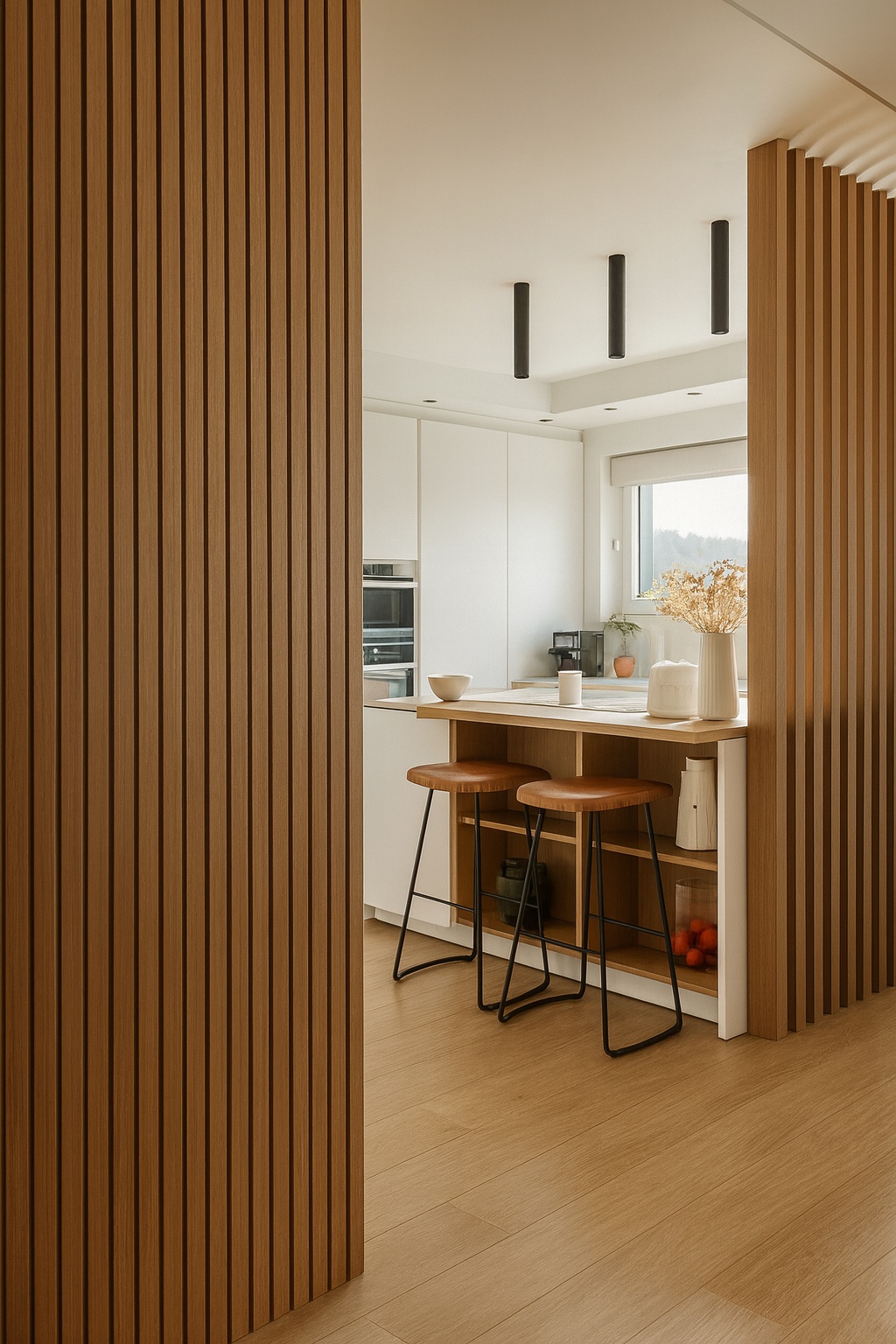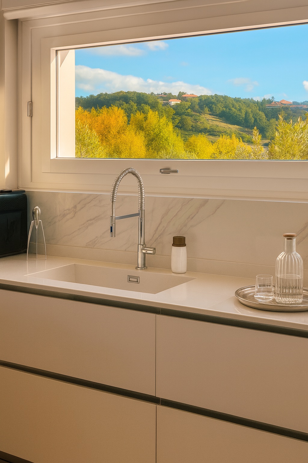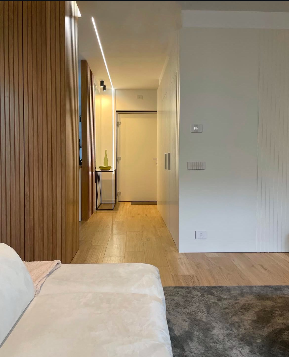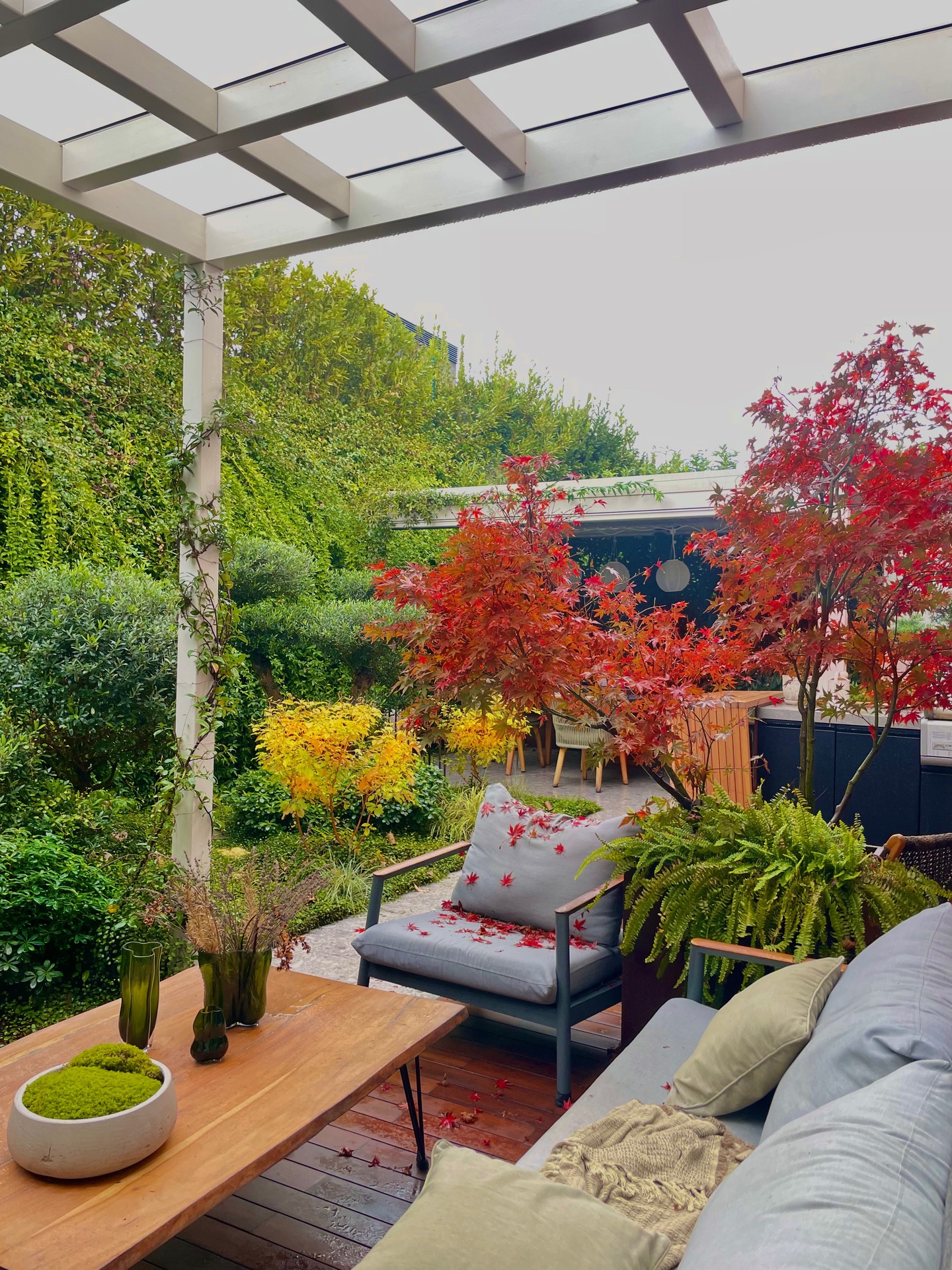 Questo progetto rappresenta la perfetta sintesi tra eleganza contemporanea e calore domestico. L'obiettivo era creare un ambiente che fosse al contempo sofisticato e profondamente accogliente, dove la luce gioca un ruolo da protagonista assoluta.Il fil rouge dell'abitazione è l'uso materico del legno: dalle boiserie cannettate che ritmano i corridoi nascondendo i passaggi, al parquet che scalda ogni stanza, fino ai dettagli della cucina. La zona giorno è un open space fluido, dove il living si raccoglie attorno a un camino minimale e nicchie retroilluminate, mentre la sala da pranzo è impreziosita da un lampadario scultoreo a cerchi intrecciati che dialoga con le tonalità cognac delle sedute.La cucina, bianca ed essenziale, diventa un punto privilegiato di osservazione: la grande finestra incornicia il paesaggio e lascia entrare la "golden hour", trasformando la preparazione dei pasti in un momento magico.In questo progetto, l'architettura non si limita a definire gli spazi interni, ma diventa una cornice per la natura circostante. Il vero cuore pulsante della villa è il dialogo ininterrotto tra in e out: le ampie vetrate scorrevoli a tutt’altezza smaterializzano i confini, trasformando il giardino in un’estensione naturale del living e della cucina.L'esterno è stato concepito secondo la filosofia del Dry Garden, una scelta consapevole che unisce sostenibilità ed estetica. Non un semplice giardino ornamentale, ma un ecosistema resiliente progettato per prosperare con un ridotto fabbisogno idrico. La selezione botanica privilegia essenze autoctone e piante rustiche, capaci di adattarsi al clima e di resistere agli stress termici senza rinunciare alla bellezza.Questo approccio paesaggistico regala una scenografia in continua metamorfosi: il giardino è un quadro vivente che muta colore e texture con il passare delle stagioni. Dalle fioriture primaverili ai toni accesi e ramati del foliage autunnale – visibili nelle sfumature degli aceri e degli arbusti – ogni periodo dell'anno offre una nuova atmosfera che entra prepotentemente in casa, arredandola con la luce e i colori della natura.Il patio, protetto da una pergola bioclimatica e pavimentato in legno caldo, diventa così il luogo privilegiato per osservare questo spettacolo, in un perfetto equilibrio tra comfort contemporaneo e rispetto per l'ambiente.